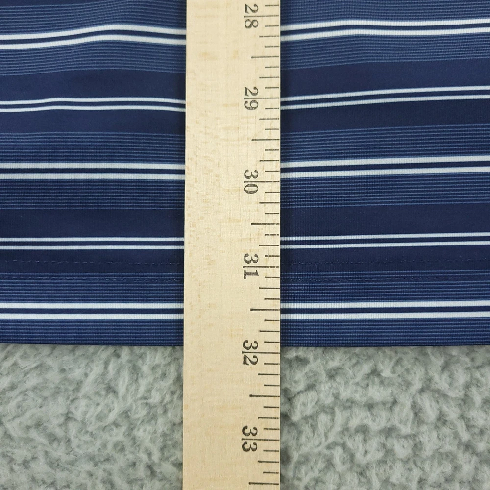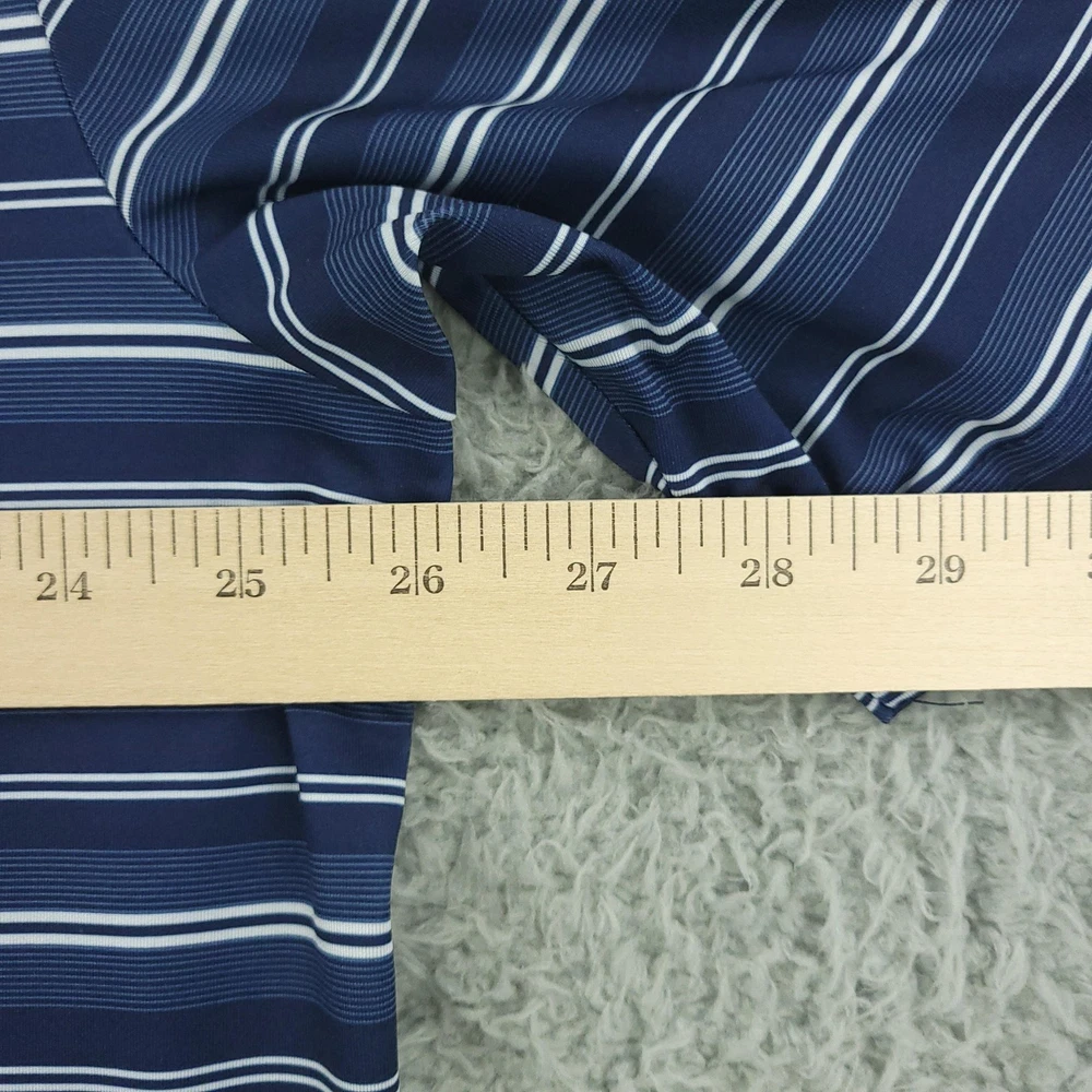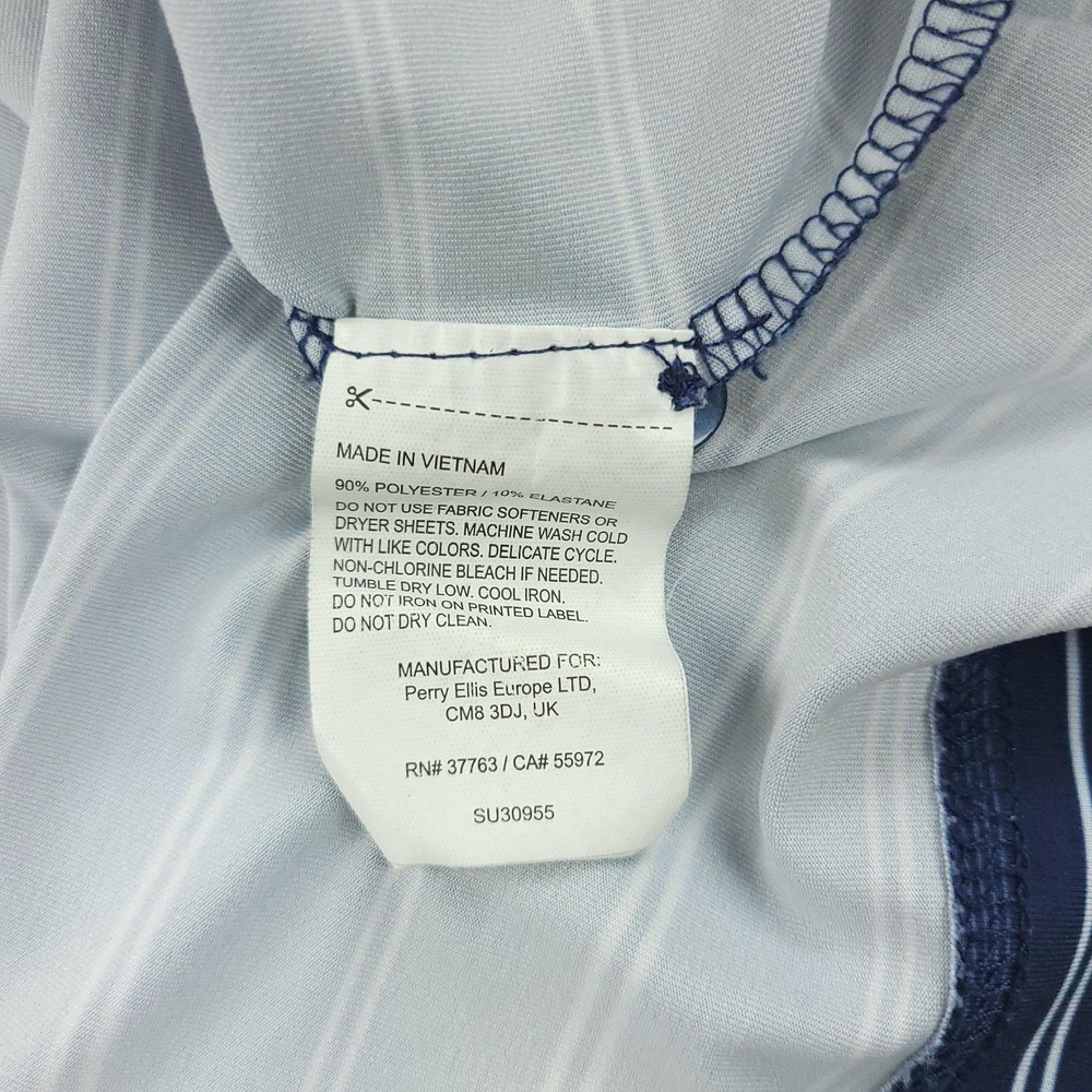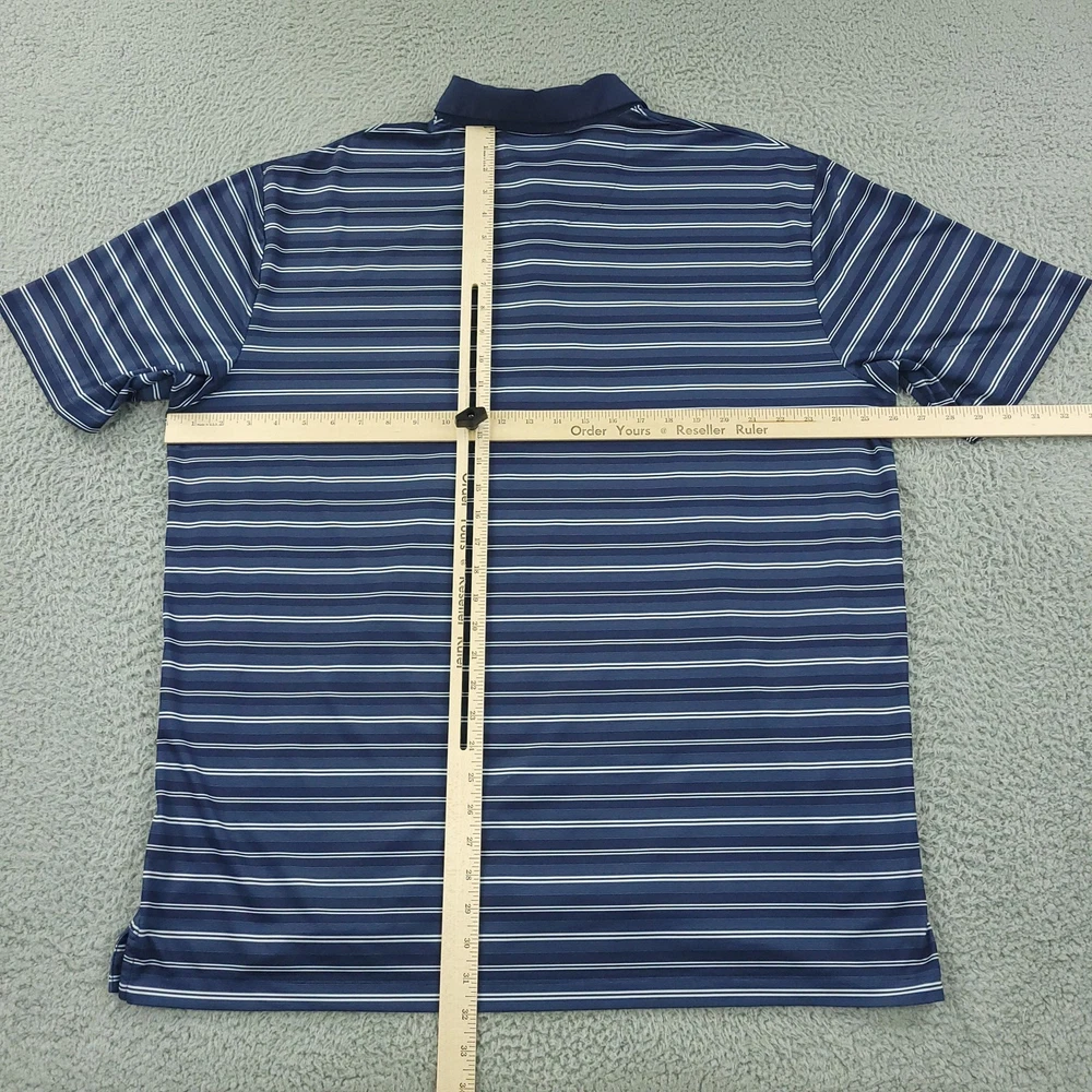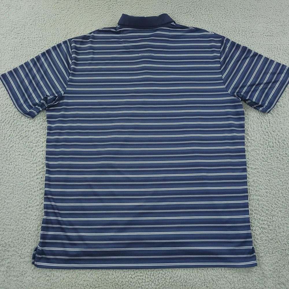 Brand: Callaway Style: Mens short-sleeve polo shirt with horizontal blue and white stripe pattern and classic knit collar. Technology: Opti-Dri moisture-wicking fabric designed to keep you cool and dry during golf and other activities. Color: Navy blue base with white and light blue stripes. Size on tag: XL (Mens). Materials: 90% polyester, 10% elastane for comfortable stretch performance. Country of manufacture: Made in Vietnam. Tag details: Manufactured for Perry Ellis Europe LTD; RN# 37763, CA# 55972, code SU30955. Details: Three-button front placket, Callaway chevron logo at left chest, lightweight performance knit fabric suitable for golf or casual wear. Washed and dried with Fragrance Free Detergent & Dryer Sheets. Measurements are included in the photos, compare measurements with your item to ensure proper fit. (Measurements are done with the item lying flat). I ship next business day and all items include tracking. Items are added daily to my store Visit My Store Buy More & Save! Combined shipping for US customers - $1.99 for each additional item (Add items to shopping cart and discounts will automatically calculate during checkout)