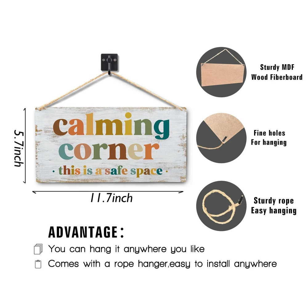 Calming Corner Hanging Wood Sign Plaque - Safe Space Classroom Decor, School Counselor Office Decor, Calm Down Corner Decorations For Classroom Preschool, Boho Classroom Decor(Yellowish White), 12x6 Product Details Color: 010-Calming Corner sign Brand: Absnfatu MPN: 380 UPC: Does not apply EAN: Does not apply Color: 010-Calming Corner sign Brand: Absnfatu Product Dimensions: 12"L x 6"W Shape: Rectangular Style: Modern Product Dimensions: 12 x 6 x 0.04 inches Item Weight: 3.87 ounces Item model number: 380 1. Elevate your home decor with our captivating wooden plaque signs,10x8 inch, featuring vibrant designs that will instantly brighten up any space. 2. Crafted for durability and elegance, our wooden plaques are the perfect choice to add a touch of color and charm to your surroundings. 3. Make special occasions even more memorable with our wooden plaque signs, the ideal gift choice for those who appreciate meaningful and beautiful decor. 5. Add a pop of color and style to your surroundings with our wooden plaque signs, designed to bring joy and charm to your home or office space. Our wooden plaque signs offer a perfect blend of captivating designs, vibrant colors, and durability, making them a versatile and timeless decoration choice for any home or office setting.