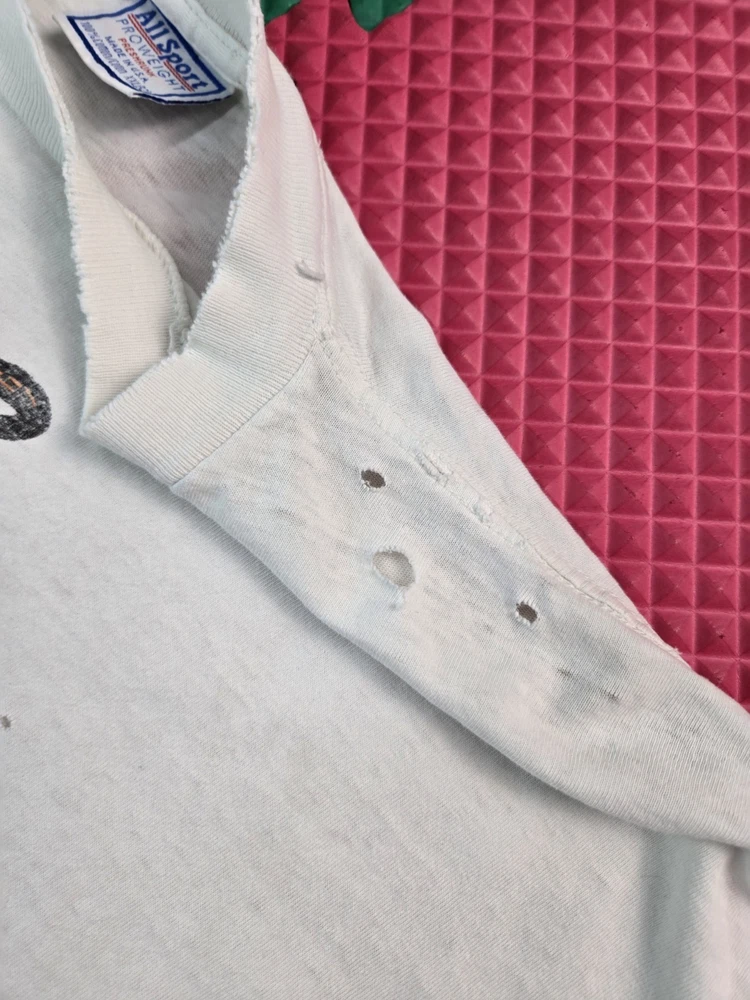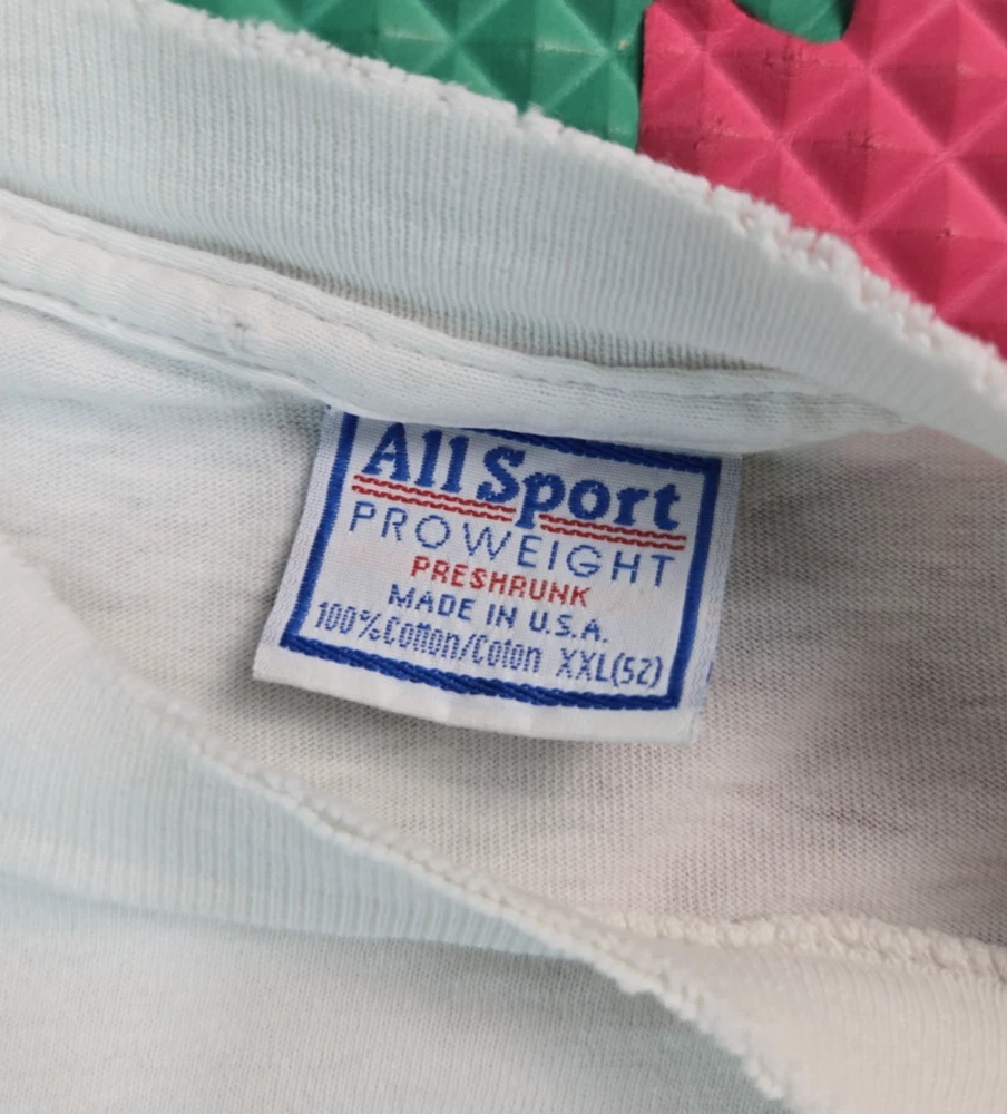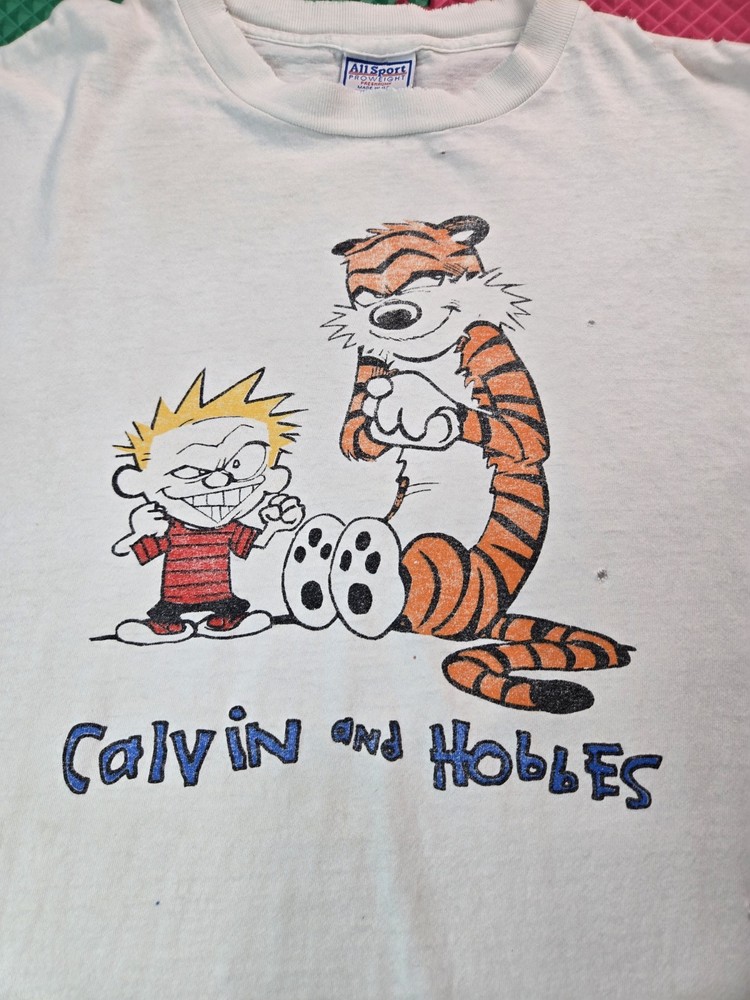 Sleeve Length:Short SleeveAccents:All SeasonsFeatures:All SeasonsTheme:90sDepartment:MenModel:SportsmanSeason:Spring, SummerSize:2XLFit:RegularSize Type:RegularNeckline:Crew NeckHandmade:NoType:T-ShirtSeller Notes:“Has some small holes on the front and some very small minor stains, see photos.”Year Manufactured:1990-1999Country of Origin:United StatesMaterial:CottonVintage:YesGarment Care:Machine WashableCharacter Family:Calvin & HobbesColor:WhitePersonalize:NoBrand:All SportPattern:Graphic Print