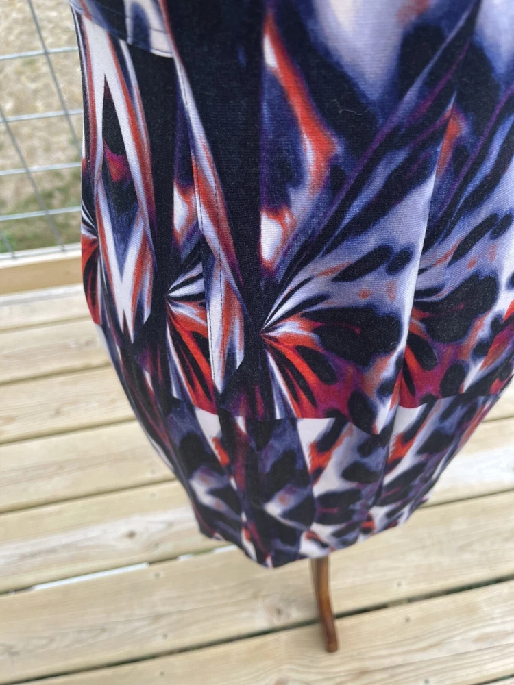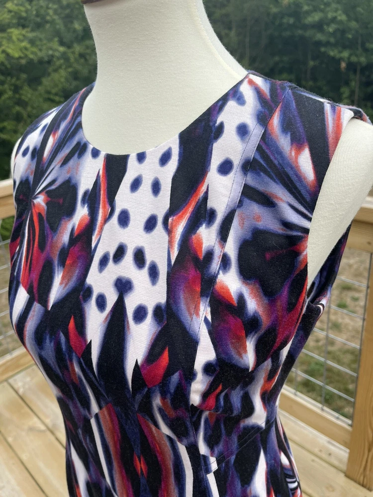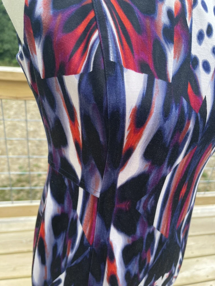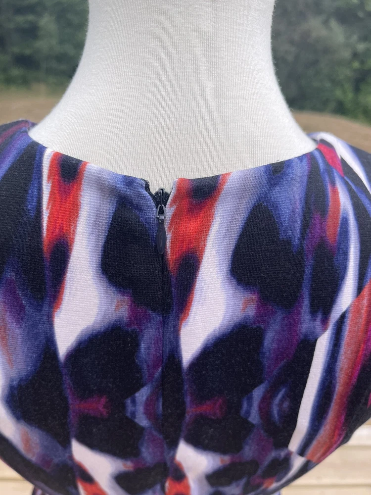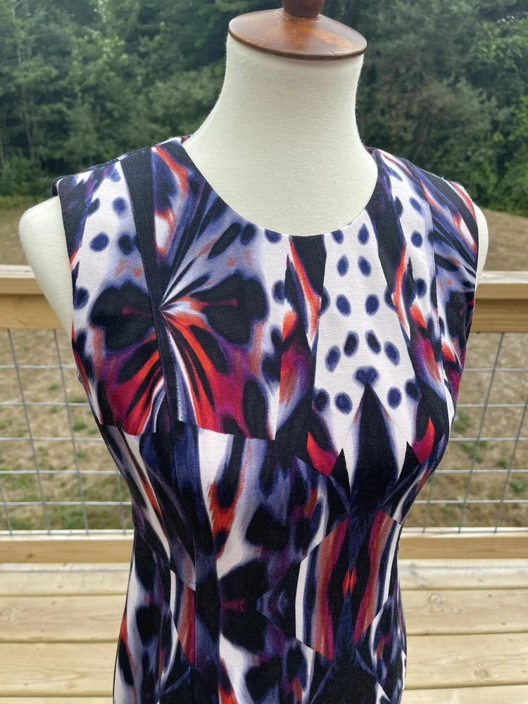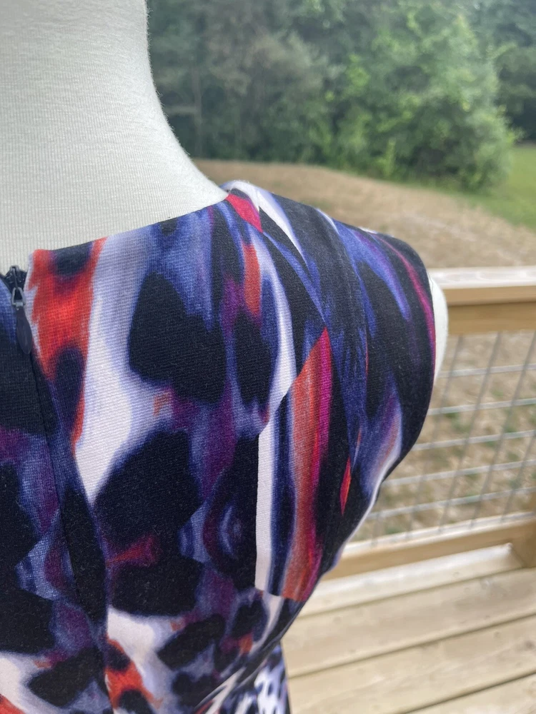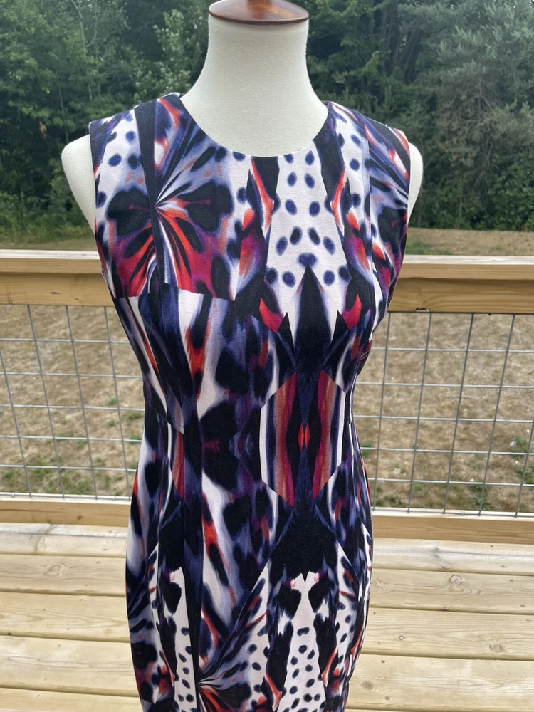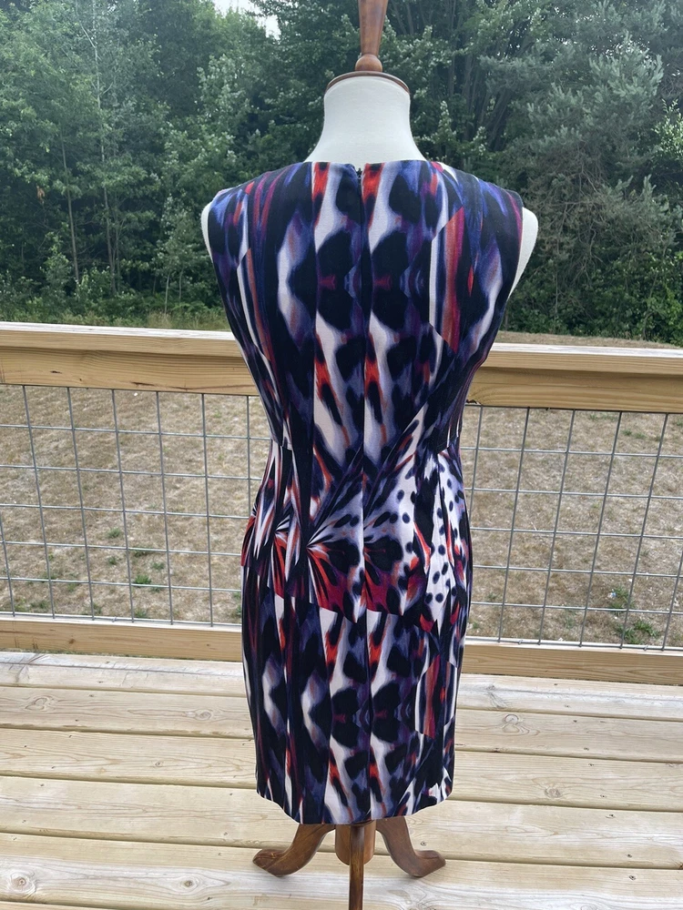 Calvin Klein Dress Womens S M Classic Wild Sleeveless Sheath Pencil Career 3952. EXCELLENT Condition! Like New or very close Very nice quality stretch fabric Vibrant colors: black white orange gray purple violet blue It’s not animal print but it has that vibe Like a cross between a butterfly a zebra and a leopard :) 18” pit to pit 37” Shoulder to Bottom