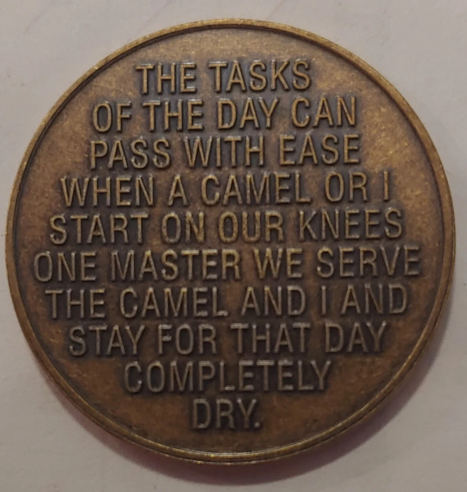 This beautiful bronze medallion is a perfect addition to any collection. With its intricate design and excellent craftsmanship, it is sure to impress. Made in the United States, it is a great way to show support for recovery programs and organizations such as AA and NA. Featuring a camel on one side and recovery slogans on the other, this medallion is an excellent reminder of the journey to sobriety. Whether you are a collector or just looking for a meaningful token to carry with you, this medallion is a great choice. Add it to your collection today!