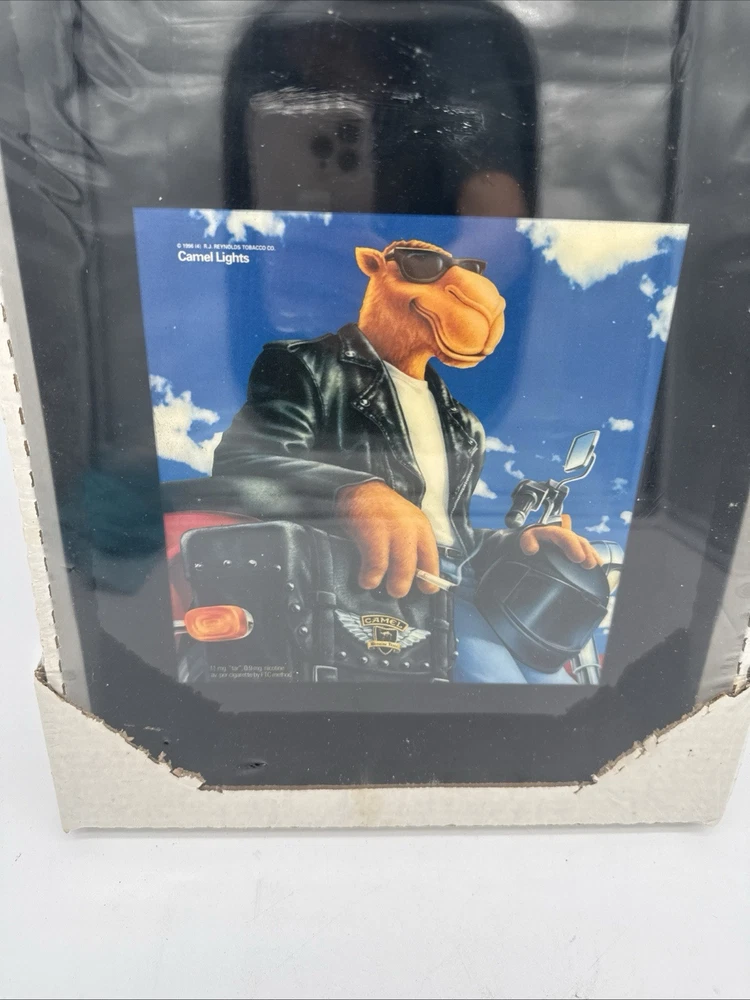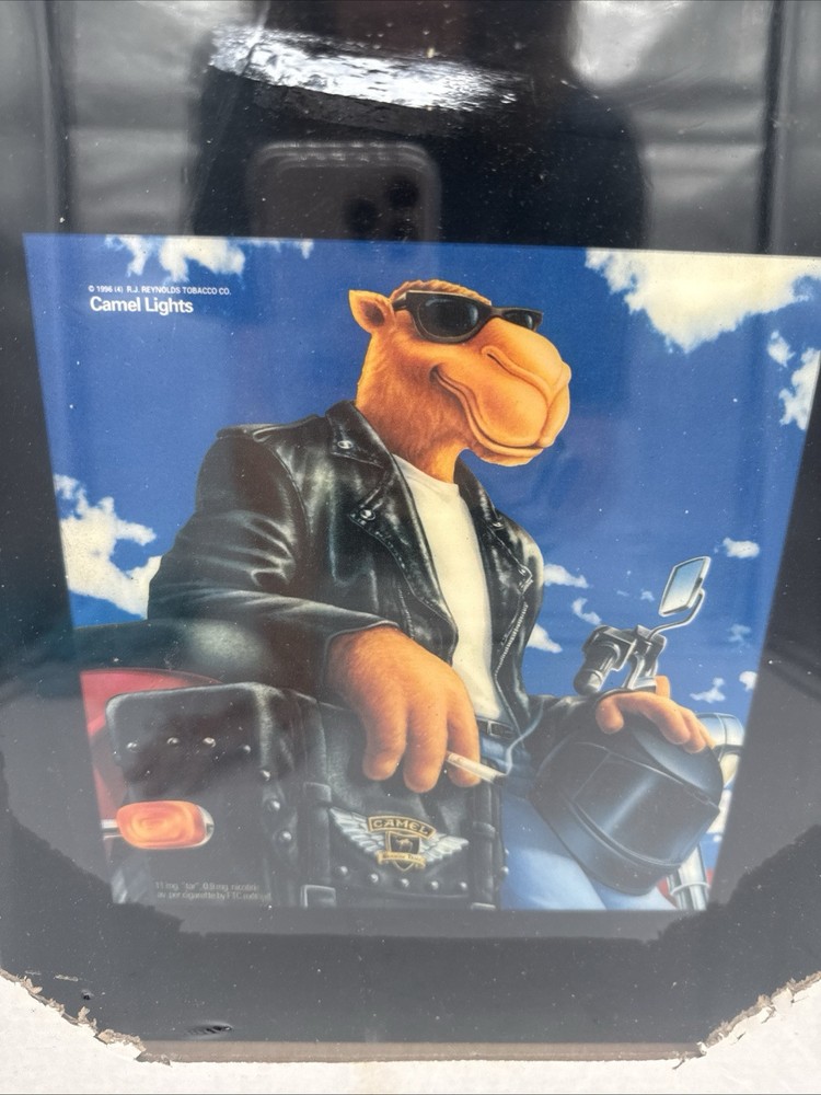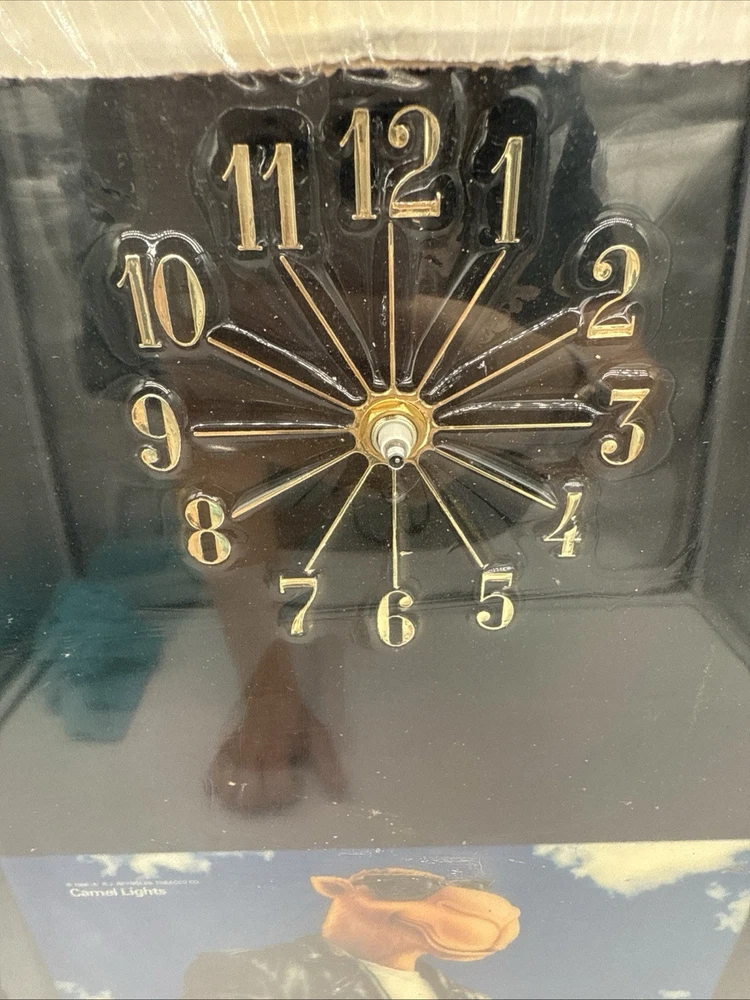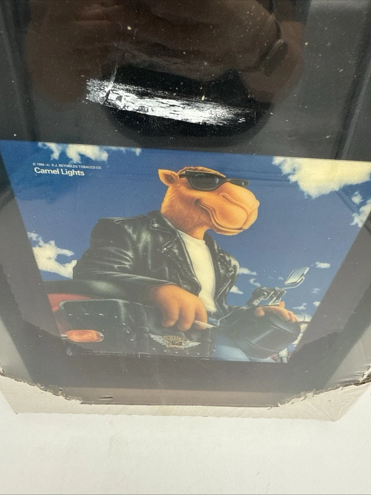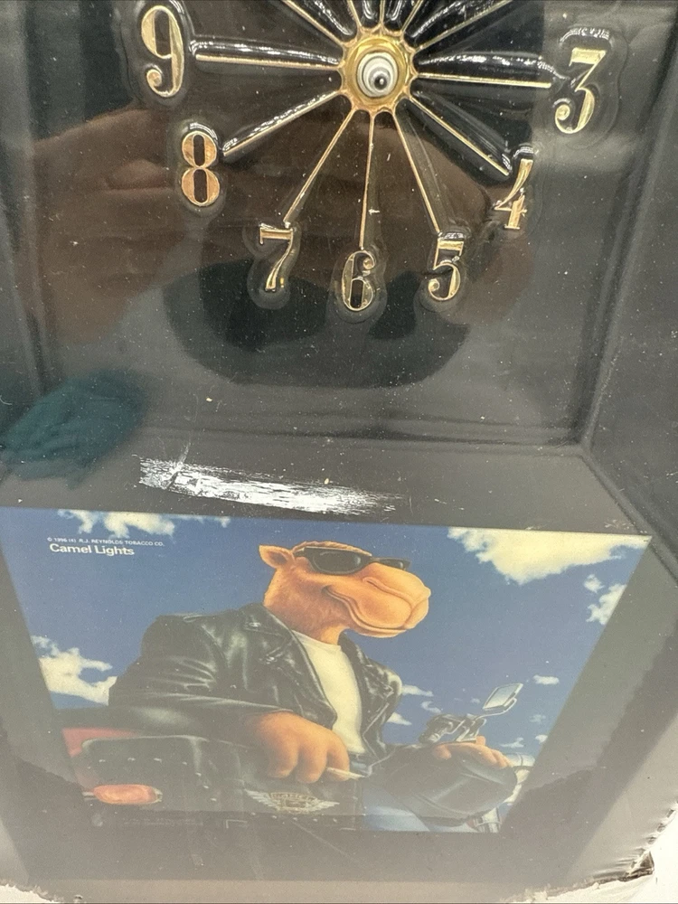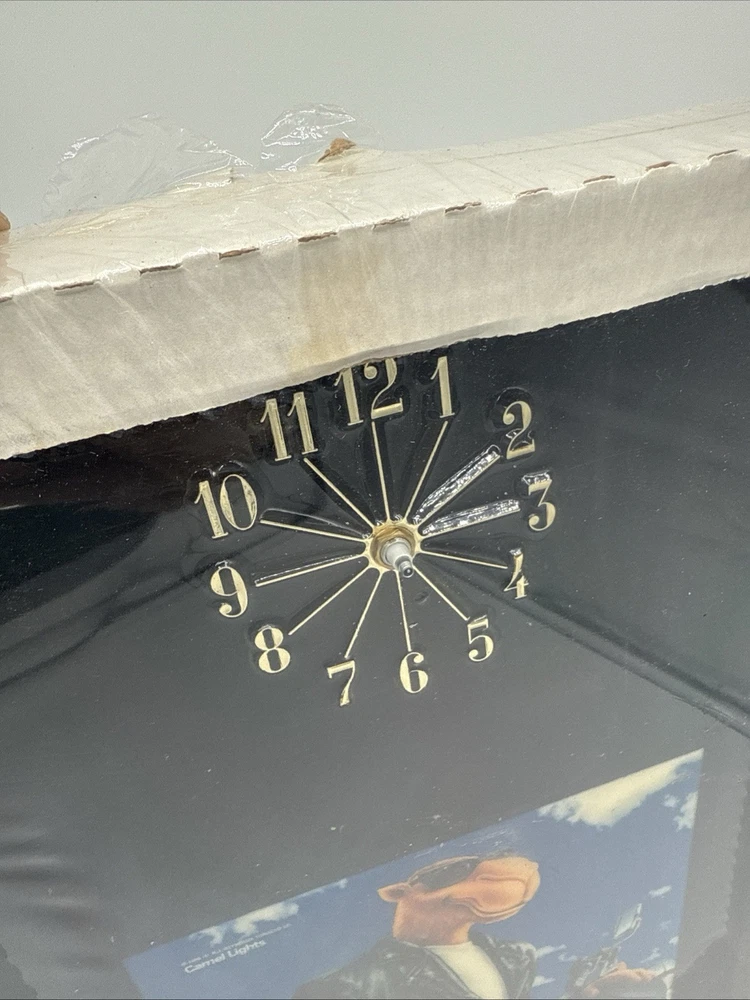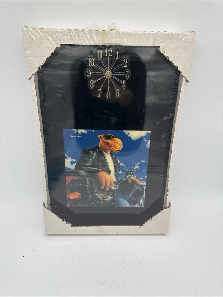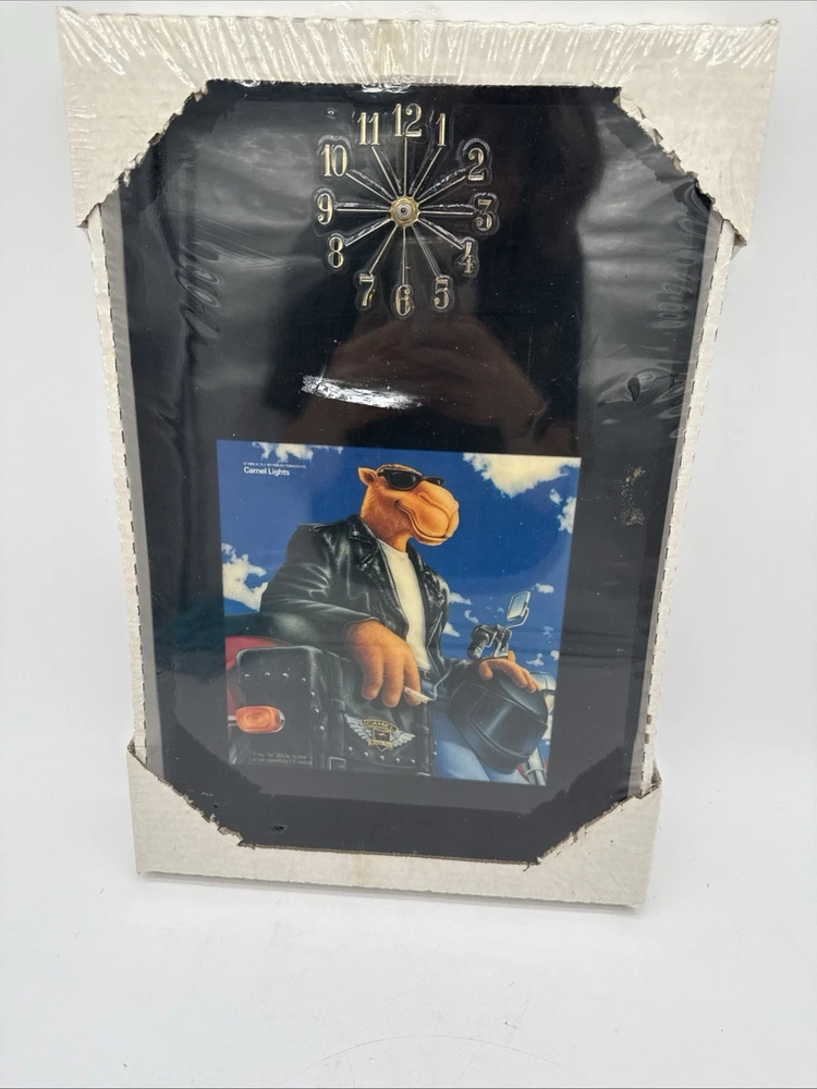 Approx 19"x12". Enhance your space with a sleek, timeless piece that combines functionality with a touch of vintage flair. The Camel Lights Wall Clock is a newly revealed old stock item, featuring a classic black design that effortlessly complements any room. Its distinctive Joe Camel Leather Jacket Motorcycle theme adds a unique appeal, making it a standout addition or a thoughtful gift for collectors and enthusiasts alike. Crafted with precision, this clock is a testament to the enduring legacy of the Camel brand. Its unbranded versatility allows it to blend seamlessly with various decor styles, from rustic to modern. The clock's rich history and iconic branding make it more than just a timekeeper; it's a statement piece with a story.