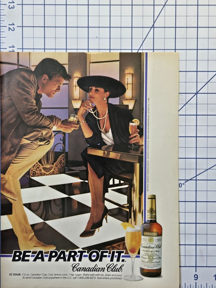Canadian Club Whisky Sour Bar Mancave Art Deco Lounge Vintage Print Ad 1986 Full Page - great for framing. Every item for sale at Blue Feather Ephemera is 100% original. I sell no reproductions or copies. ------- Thanks for checking out this item. Please carefully view all of the photos for this listing - they are an important part of the description. I don't use stock photos or pictures sourced from third parties. The pictures you see are taken by me and show the product you're buying. Depending on the light, the pictures may not reflect the true color. If color is an issue, please message me and I can check for you. Any questions you might have about items in my store are always welcome. I'm happy to combine shipping when you purchase multiple items. Just buy the items, and then wait until you are invoiced to pay (within one business day). Unless noted above, all of my ephemera products are free of rips or tears. Vintage print ads invariably have some degree of wear, especially near the binding. Also, some fading is possible, as is the smudge or run of inks during production. If it's obvious that color has bled due to exposure to humidity or water exposure, you will see a ***CONDITION NOTE*** above. The small holes resulting from saddle-stitch (staple binding) may or may not be present on the piece. They will NOT be noted unless they're abnormal in some way. If their presence might affect your decision to purchase, or your satisfaction upon receipt, please feel free to ask first. I'm happy to provide additional details. As always, and as stated above, my pictures are your best source of information about this piece. As expected with vintage paper, there may be some natural darkening, and foxing may be present. I do not sell ephemera with evidence of mold, mildew, odor, or pest damage. Generally speaking, I will not offer for sale an item with any substantial condition issues unless it's of great quality, scarcity, or it has some other exceptional characteristic, and the issues would be described in detail. Thanks for stopping by Blue Feather Ephemera. I'm a part-time reseller of vintage, retro, and quaint items of good quality. Check out more of the items in this store for awesome examples of beautiful, interesting advertising from bygone days. Don't forget to add my store to your "favorites" if you like what you see. Then you'll be notified of new items, discounts, and special offers.