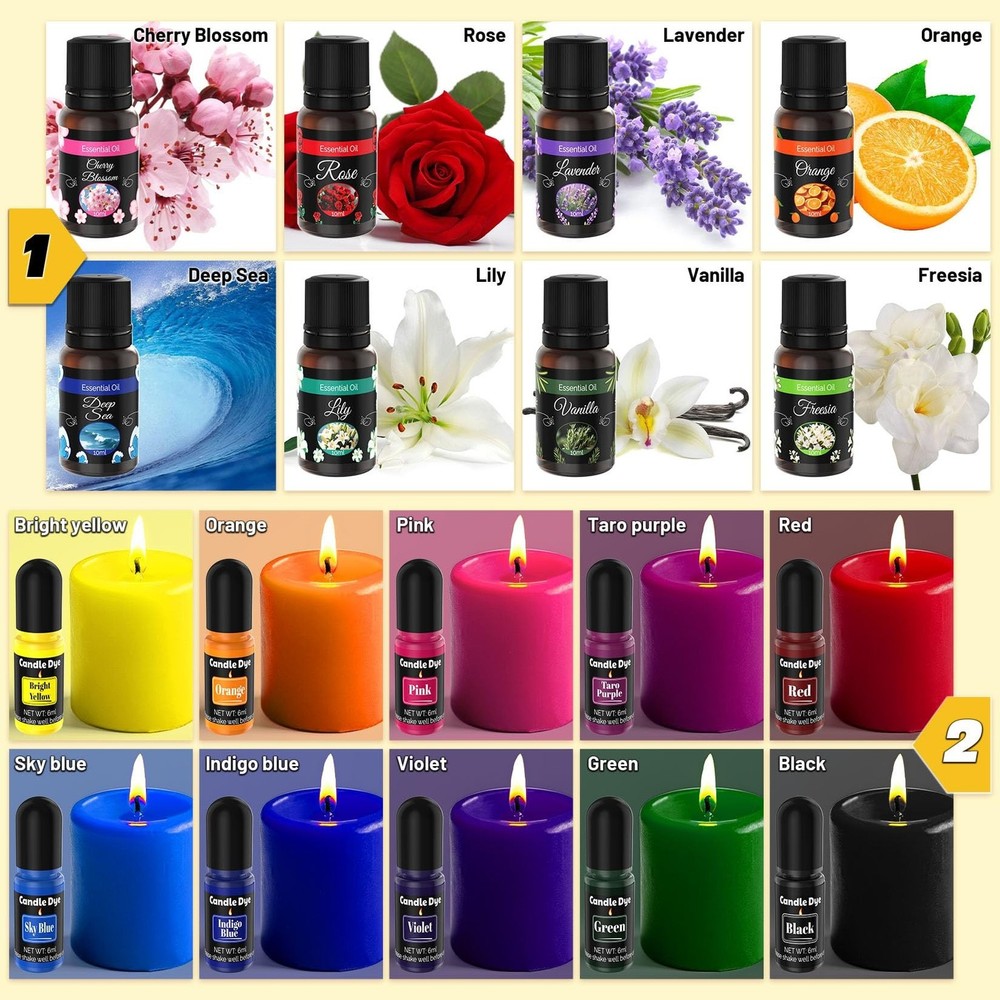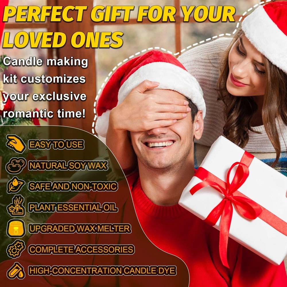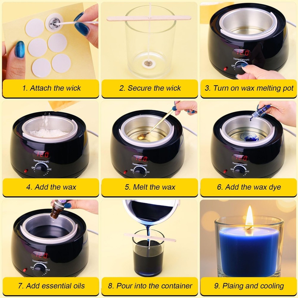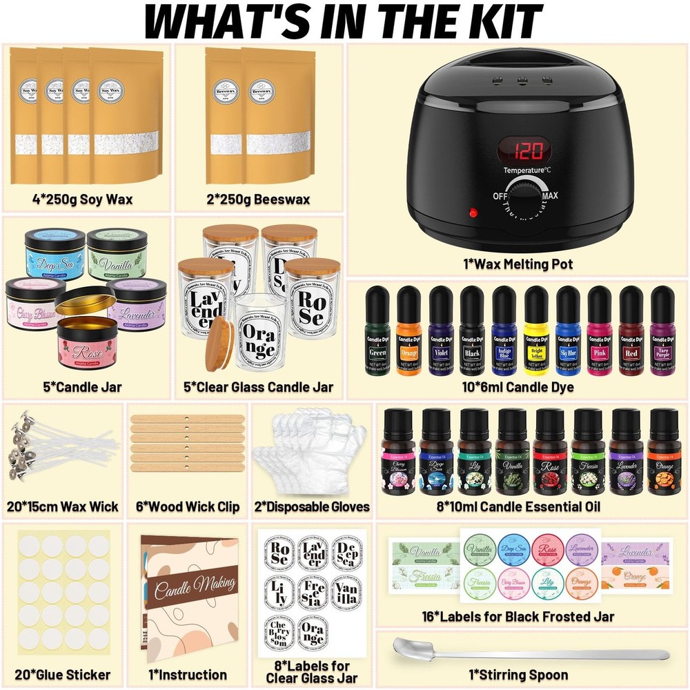 Candle Making Kit for Adults - 43 PCS Complete DIY Candle Making Supplies, Include Wax Melter, 1500G Soy Wax Beeswax, 8 Scents, 10 Dyes, 10 Jars, 20 Wicks & More - Great for Beginner, Home Decoration Product Details Brand: Candle Aider Color: Multi-color Item dimensions L x W x H: 15 x 12 x 4 inches Paint Type: Tempera Set Name: Candle Making Kit for Adults Product Dimensions: 15 x 12 x 4 inches Item model number: CDK-01 Item Weight: 9.26 pounds Date First Available: June 22, 2025 COMPLETE CANDLE MAKING KIT - These carefully matched candle making supplies covers the full process tools and materials from melting wax to shaping: 1*wax melter, 5*clear glass candle making jars, 5*candle making jars, 4*250g soy wax, 2*250g beeswax, 20*glue sticker, 6*wood wick clips, 20*15cm wax wick, 8*10ml candle essential oil, 10*6ml candle dye, 1*stirring spoon, 5*label for clear glass jars, 5*label for black frosted jar, 1*instructions, 2*disposable gloves. From raw materials to tools, everything is done in one step, allowing you to focus on enjoying the joy of handmade creation! Complete & High-Quality Accessories - The natural soy wax for candle making in the set has a lower melting point and is easier to melt. It also burns longer and does not produce black smoke when burning. It does not contain lead or paraffin hydrocarbon compounds, and the ingredients are safe and reliable. 8 different candle making scents of plant essential oils, high concentration, make the fragrance last longer. 10 bright candle dyes allow you to freely match and give full play to your imagination and creativity. Whether it is a homemade holiday gift or creating a home atmosphere, this top-notch candle making kit for adults will make your creative inspiration come true immediately! Professional candle wax melter- The newly upgraded candle melting pot is equipped with an LED digital display and a precise temperature control system. It does not require additional complicated tools such as thermometers and electric furnaces. Even novices can accurately control the temperature of the wax melting. It comes with a detachable inner pot with a handle, which is not hot when held in hand, and pouring the wax liquid is more stable. Simple & Safe - Our wax kits come with an instruction manual with very detailed step-by-step pictures and instructions. Just follow the steps in the manual to make a perfect candle! Whether you are a beginner or a candle lover, having our full set of diy candle kit is half the battle! All our accessories are in compliance with standards, safe and non-toxic, and can be used with confidence. A warm gift - When traditional gifts become assembly line replicas, this exquisite candle crafts for adults is becoming a new gift-giving trend - melt the wax, blend the scent, and dye it yourself, injecting the natural warmth of soy wax and the healing scent of essential oils into each unique candle. Customize a named scented candle for your loved one on their birthday, make scented candles with your children on Christmas, and express gratitude with rose wax on Mother's Day... The dancing flame is a warmer heart than any gift.