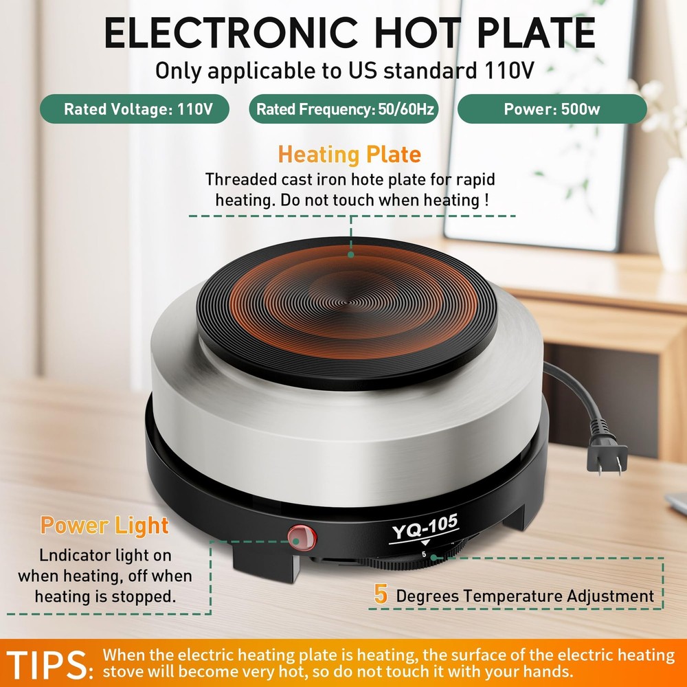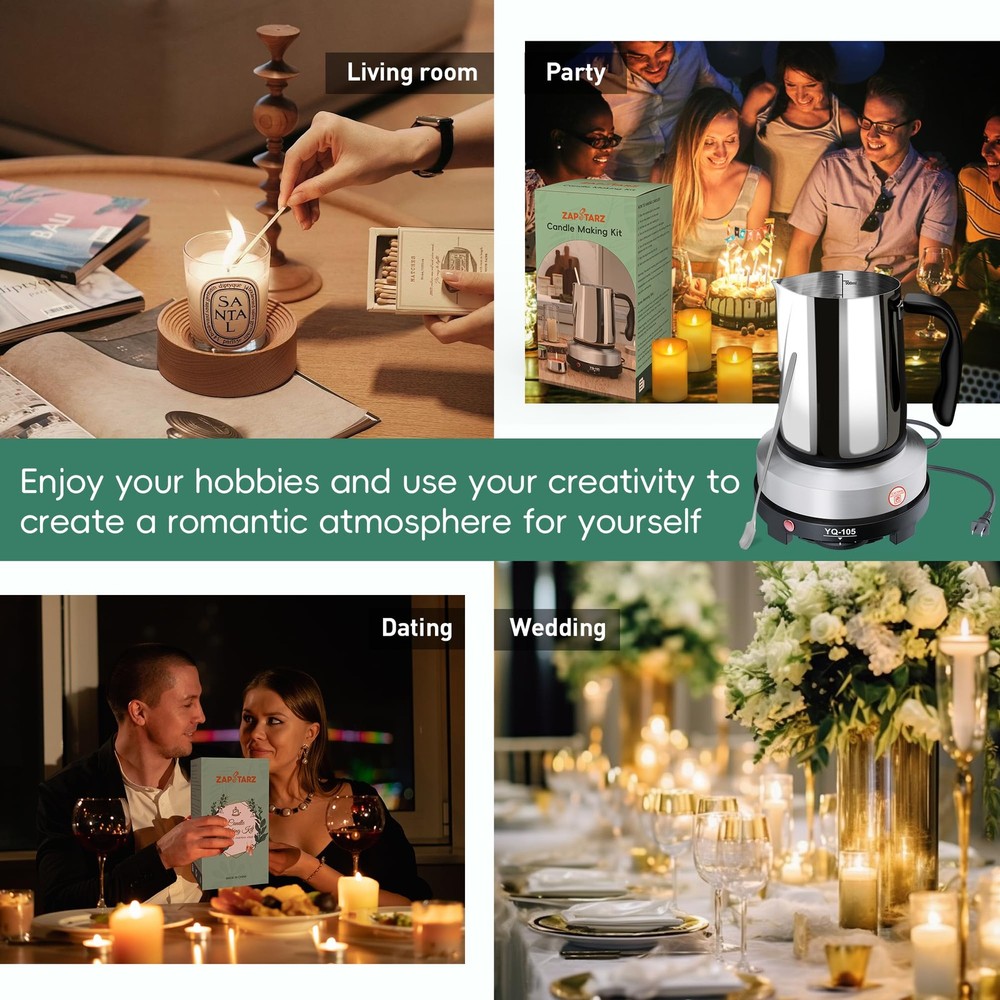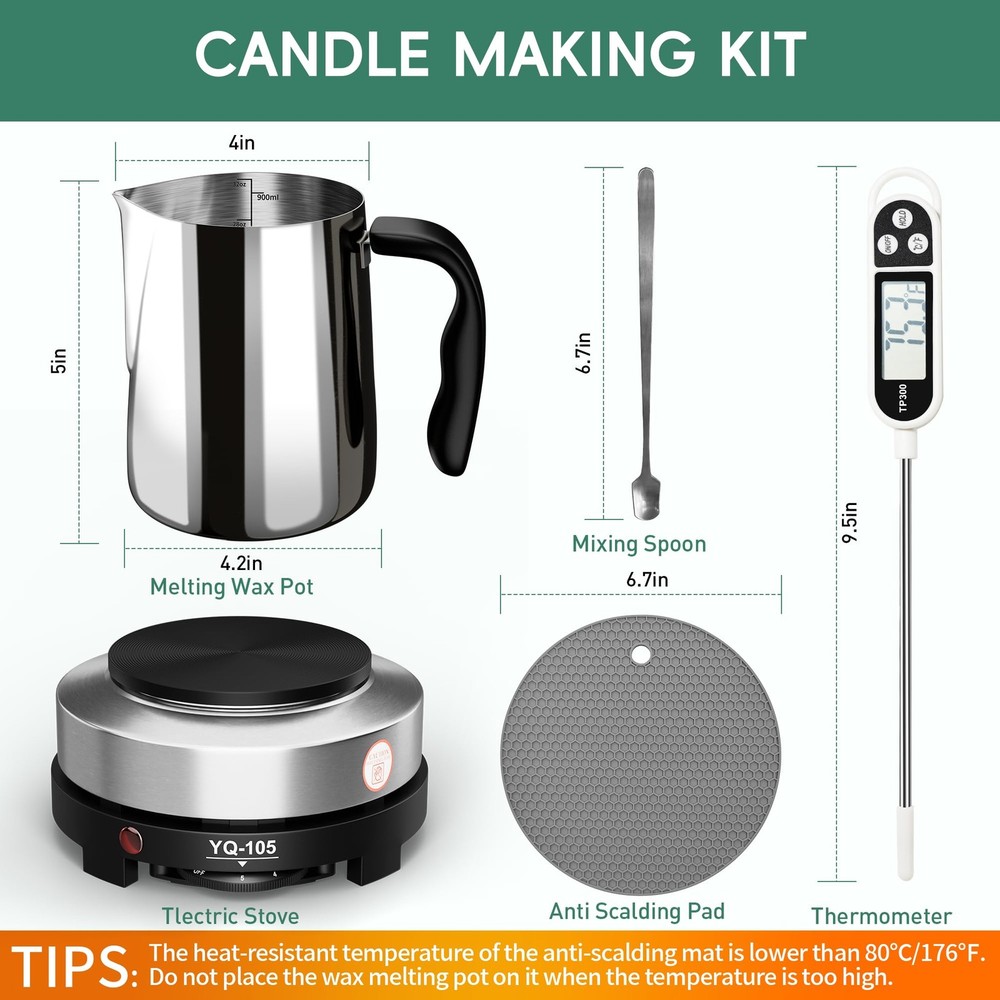 Whether you are a candle lover or a beginner, this candle making supplies allows you to easily make your own candles and enjoy the fun of making candles with your family. Homemade candles can be used to decorate a house or just set the mood for a romantic evening. Make a wedding, Valentine's Day, Christmas or birthday gift for your family, loved ones and friends who will cherish this heartfelt gift. Candle Making Pouring Pot The wax pot is made of stainless steel, high temperature resistance, strong rust resistance, dripless pouringspout that controls the flow to prevent leakage, heat-resistant handle, anti-hot. Electric Hot Plate 110v-500w Electric Hot Plate (only supports the voltage of American Standard 110V). 1-5 gears, the third gear is recommended to prevent the temperature from being too high. Stainless Steel Spoon This stainless steel spoon, length 17cm/6.7inch, can be stirred while the wax is melting, saving time. Thermometer for Candle Making This thermometer can switch between Celsius and Fahrenheit. Helps you precisely control temperatures when melting candles, adding pigments, adding essential oils and pouring wax. Heat Resistant Mat This thermal pad is made of TPR material and is non-slip and insulating. It protects your countertops from heat damage. Candle Making kit Include: 1x 500w Hot Plate 1x Stirring Spoon 1x Thermometer 1x Candle Melting Pot 1x Anti-Scald Pad Notice: When heating, do not touch the entire surface of the heating plate to avoid burns. Instead, place your hand on the top of the electric stove to feel the temperature. When the electric furnace is not in use, adjust the switch to 0, and store it after the temperature dissipates Candle Making Kit with Hot Plate: We provide a variety of accessories to assist beginners in making perfect candles, including 900ml Stainless Steel Wax Melting Pot, 500w Hot Plate, Anti-Scald Pads, Stirring Spoon, Thermometer. The electric heating plate only supports the American standard 110V voltage Candle Making Supplies: The candle making pouring pot has a large capacity of 900ml/32oz. The handle is anti-scald to ensure the safety of use. The internal laser scale makes it easy to precisely control the amount of wax used. This melting wax pot and stirring spoon is made of high quality stainless steel, with anti-rust, high temperature, Which is easy to clean. There is no dripping at the pouring mouth, which controls the flow and prevents leakage Electric Hot Plate: This hot plate for candle making is constant temperature heating, safer and more convenient for user. 1-5 gears, each gear has a temperature setting value, only 2-3 gears of temperature are needed to melt the candles(It is recommended not to exceed level 3 to prevent the wax from overheating.). With thermometer, more accurate control Multiple Uses: Candle making hot plate can not only melt the wax to make candles but also make soap, lipstick, etc. The candle making kit is suitable for beginners and experienced candle makers alike. this wax melter for candle making is small and easy to carry, suitable for camping trips, dormitories and offices, easier and more convenient to operate Tips: The heat-resistant temperature of the anti-scalding mat is below 80℃/176℉. Do not put the wax melting pot on top when the bottom temperature is too high. You can let it cool on the hot plate for a while before putting it on top. In order to prevent rust, the surface of candle making hot plate is covered with a protective film, so a small amount of smoke and an unpleasant smell will be generated when it is used for the first time. This is a normal situation