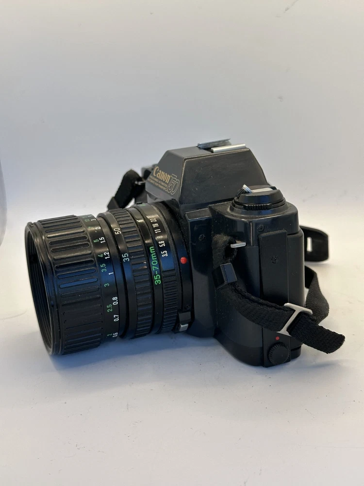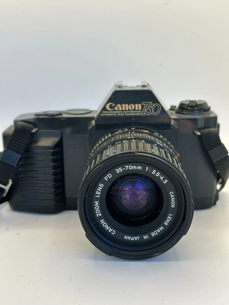 Capture memories with this classic Canon T50 35mm SLR Film Camera. Equipped with built-in light meter, auto exposure, and an electric drive, this camera offers a range of features to help you take the perfect shot. The black body design is sleek and stylish, blending in with your photography gear. This unit is a reliable choice for film photography enthusiasts, whether you're a professional or amateur. With a focus type of manual, you have complete control over your shots. Made in Japan, this camera is a testament to the country's reputation for quality electronics. Don't miss out on the opportunity to own this iconic piece of photographic history.