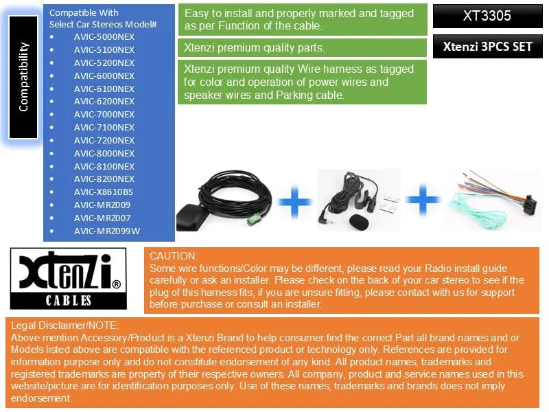 Brand 3PCS Replacement Set XT3305 Compatible with Pioneer In-Dash Radio DVD NAV System. Hard To find complete set to install your IN-Dash if missing important parts. This Set include Three (3) Main Cables for the Pioneer NAV System. If you do not need the whole complete set, you can purchase them separately COMPATIBLE MODELS: AVIC-5000NEX AVIC-5100NEX AVIC-5200NEX AVIC-6000NEX AVIC-6100NEX AVIC-6200NEX AVIC-7000NEX AVIC-7100NEX AVIC-7200NEX AVIC-8000NEX AVIC-8100NEX AVIC-8200NEX AVIC-X8610BS AVIC-MRZ009 AVIC-MRZ007 AVIC-MRZ099W AVIC-MRZ099 AVIC-MRZ077 AVIC-MRZ066 What is included: The 3PCS Set Includes: GPS Antenna (XT91830). Wire harness Power (XT91011) Microphone Mic Assembly (XT91501). CAUTION: Some wire functions/Color may be different, please read your Radio install guide carefully or ask an installer. Please check on the back of your car stereo to see if the plug of this harness fits, if you are unsure fitting, please with us for support before purchase or consult an installer. Legal Disclaimer/NOTE: Above mention Accessory/Product is a Brand to help consumer find the correct Part all brand names listed are compatible with the referenced product or technology only. References are provided for information purpose only and do not constitute endorsement of any kind. All product names, trademarks and registered trademarks are property of their respective owners. All company, product and service names used in this are for identification purposes only. Use of these names, trademarks and brands does not imply endorsement. Premium quality replacement Set XT3305 Compatible with Pioneer In Dash. 3 PCS Cord Set Compatible with following Pioneer models AVIC5000NEX 5100NEX AVIC6000NEX AVIC6100NEX AVIC7000NEX AVIC7100NEX AVIC8000NEX AVIC8100NEX. RCA Harness Set XT3305 is ideal for installing or connecting to an aftermarket stereo especially when original Cord/Harness is damaged or lost. Brand Accessory is easy to install and properly marked and tagged as per Function of the cable. Set Includes GPS Antenna, Microphone and Wire Harness Assembly.