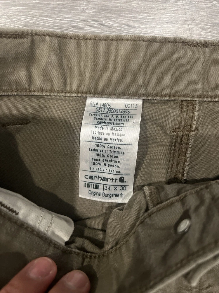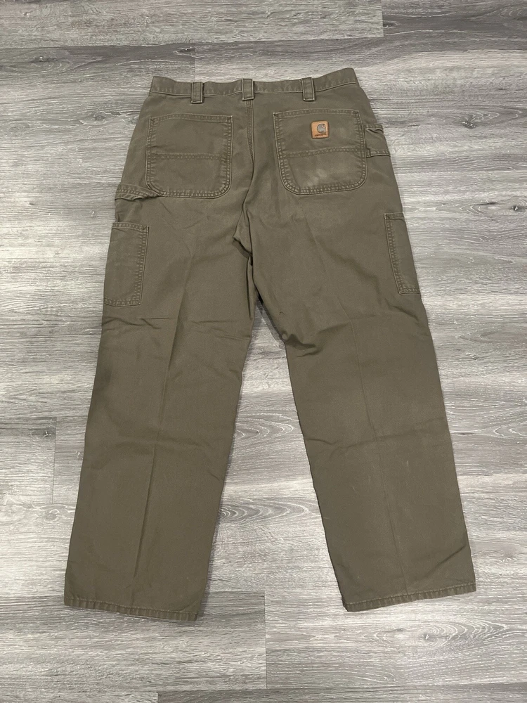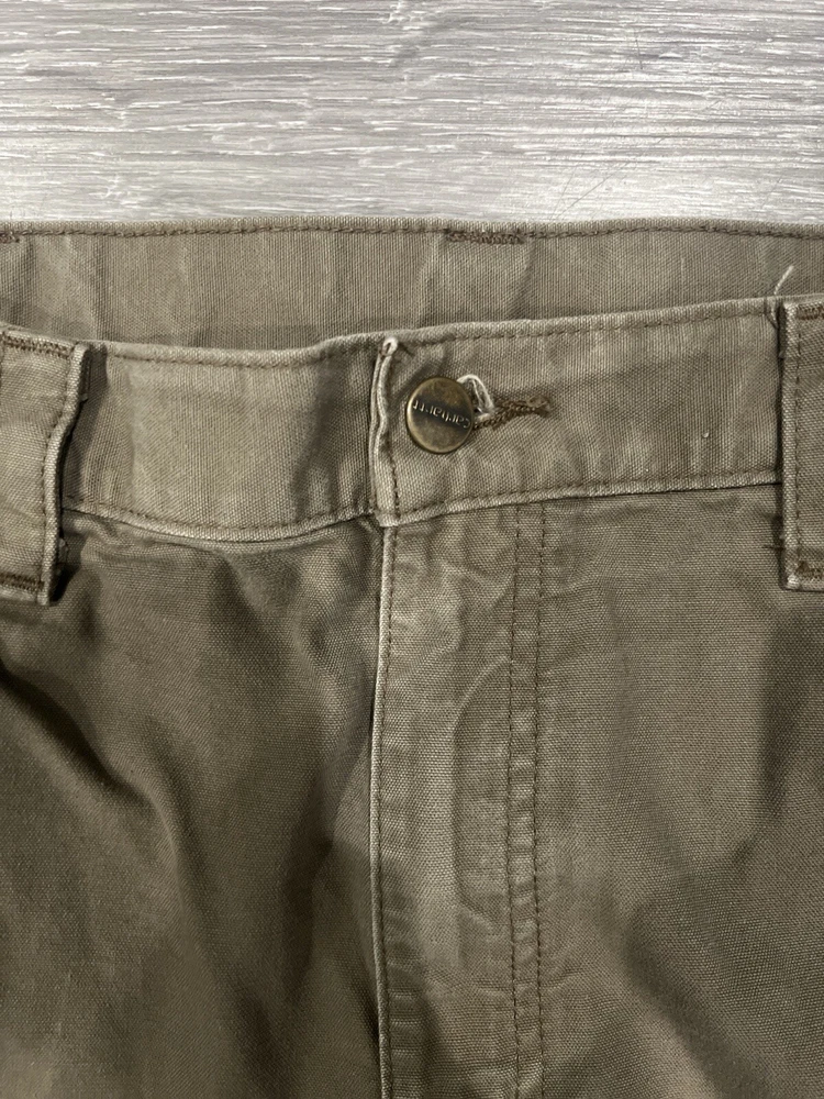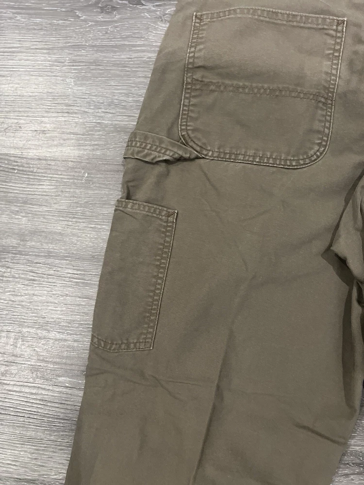 Elevate your workwear game with these Carhartt Carpenter pants. Made of a durable cotton blend, these pants feature a flat front and straight leg style with multiple pockets, including cargo, slash, and coin pockets. The pants are also belted and have a high rise for added comfort and support. These pants are perfect for any occasion, whether it's travel, casual, formal, or even for workwear. They come in a solid green color and are machine washable for easy care. The pants are also lightweight, breathable, and water-resistant, making them suitable for all seasons. With accents such as buttons, zippers, and the Carhartt logo, these pants are sure to be a fashion statement. FLAWLESS ALL SALES FINAL NO RETURNS