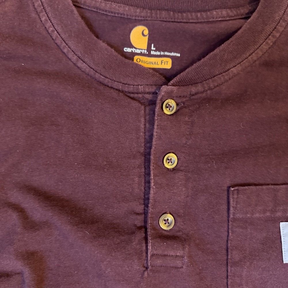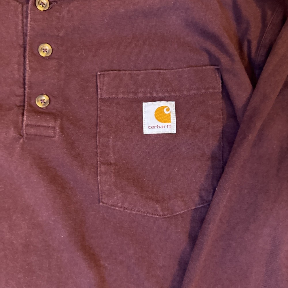 The Carhartt Long Sleeve Henley Pocket Shirt in Burgundy is a men's workwear t-shirt made of cotton knit fabric. It features a solid red color with a Henley neckline and long sleeves, making it suitable for all seasons. This regular fit shirt includes pockets for added functionality, making it a versatile and practical option for everyday wear. Machine washable for easy care, this Carhartt shirt is a timeless addition to any man's wardrobe.