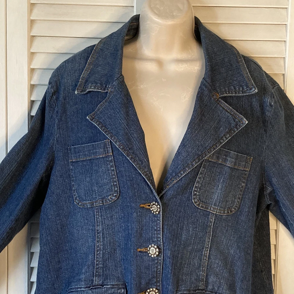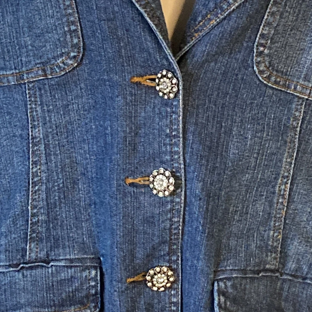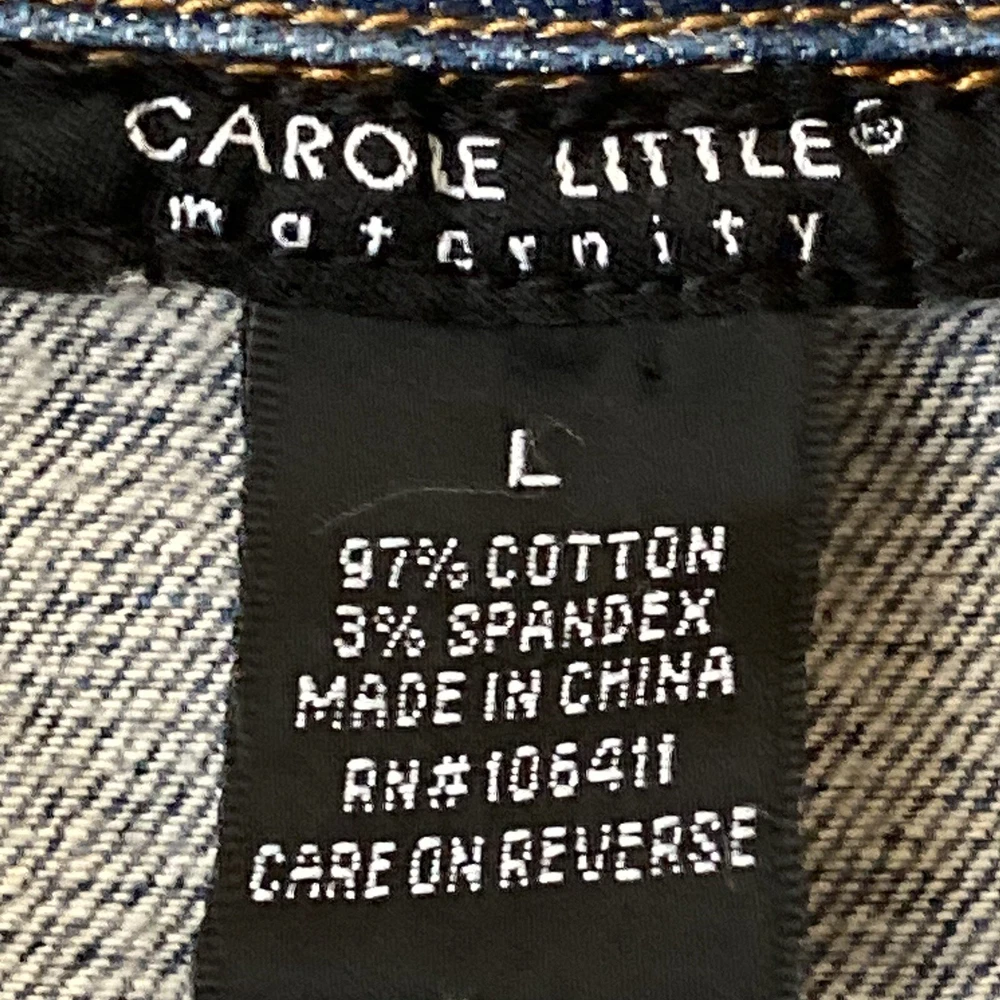 Add some bling to your maternity wardrobe with this Carole Little Jean Jacket. The rhinestone button-front adds a touch of glamour to this stylish jacket, while the blue cotton blend fabric ensures comfort for you and your growing bump. The jacket features a button closure and is a size L, perfect for any mom-to-be looking to stay fashionable during her pregnancy. The jacket's style is a classic jeans jacket, with accents of rhinestone that make it stand out. Don't miss out on this gorgeous addition to your maternity wardrobe. 97% Cotton, 3% Spandex Machine Wash Bust: 46 inches Length: 25 inches Sleeves: 24 inches