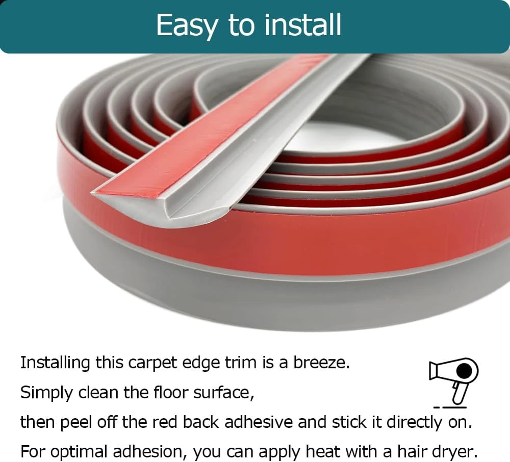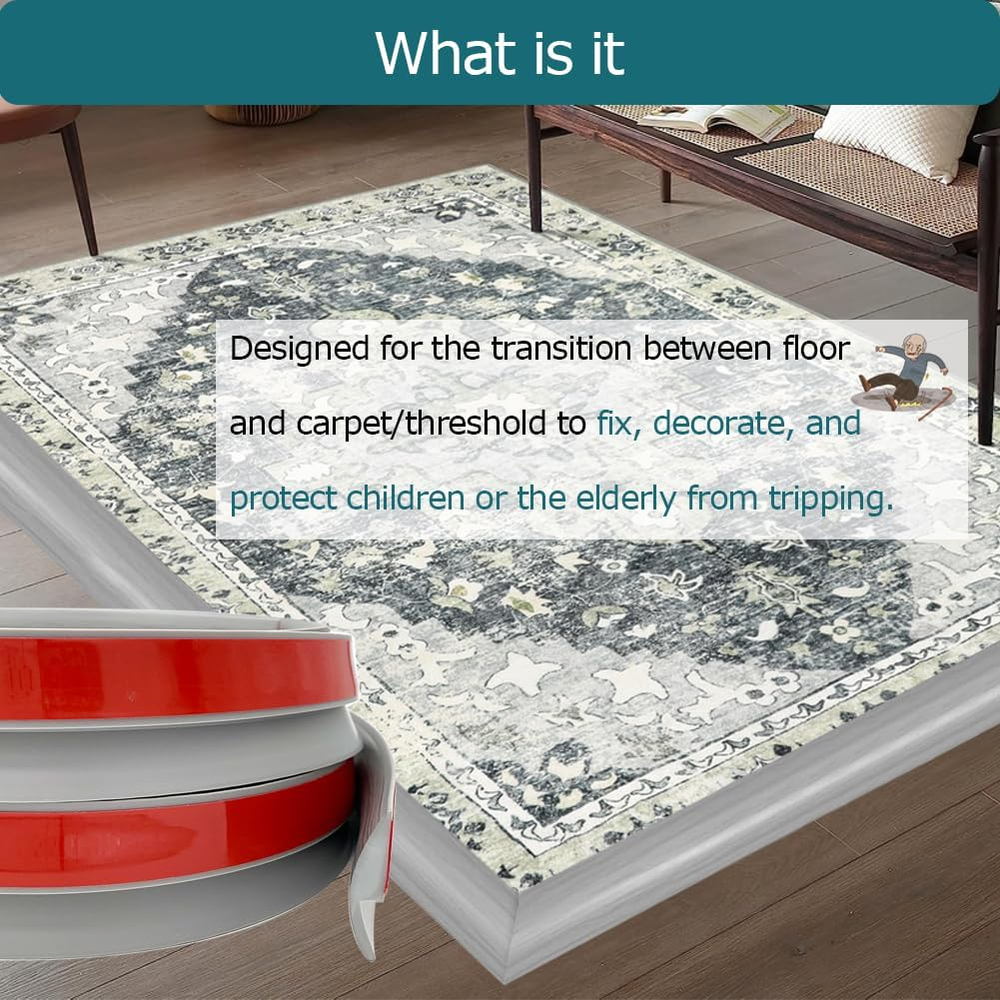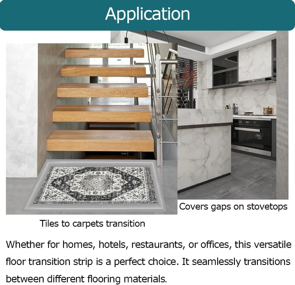 【What is it】This rubber threshold transition strip is specially designed for the transition between floor and carpet/threshold to fix, decorate, and protect children or the elderly from tripping. It is perfect for creating a seamless and safe transition in your space. 【Reasons to Buy】 This high-quality rubber carpet edge decoration offers several key benefits. Its strong adhesion ensures a secure fit, effectively covering the edges of floor tiles and carpets. The soft and comfortable texture provides a pleasant stepping experience. Made from non-toxic materials, it poses no harm to the human body. 【Ideal Option】Whether for homes, hotels, restaurants, or offices, this versatile floor transition strip is a perfect choice. It seamlessly transitions between different flooring materials such as wood floors to carpets, tiles to carpets, tiles to door thresholds, and even covers gaps on stovetops. Not only does it serve its practical purpose, but it also enhances the aesthetic appeal of your space. 【Easy to Install】Installing this carpet edge trim is a breeze. Simply clean the floor surface, then peel off the red back adhesive and stick it directly on. For optimal adhesion, you can apply heat with a hair dryer. 【Service】We take great pride in the quality and convenience of our carpet to tile transition strip, and we are confident that you will love it too. If you encounter any issues, please do not hesitate to contact us. We provide timely responses and offer the perfect solutions for any problems you may encounter. Product description Designed for the transition between floor and carpet/threshold to fix, decorate, and protect children or the elderly from tripping. Specification Strong adhesion ensures a secure fit, effectively covering the edges of floor tiles and carpets. Made from non-toxic materials, it poses no harm to the human body. Easy to install Simply clean the floor surface, then peel off the red back adhesive and stick it directly on. For optimal adhesion, you can apply heat with a hair dryer. Application Whether for homes, hotels, restaurants, or offices, this versatile floor transition strip is a perfect choice. It seamlessly transitions between different flooring materials.