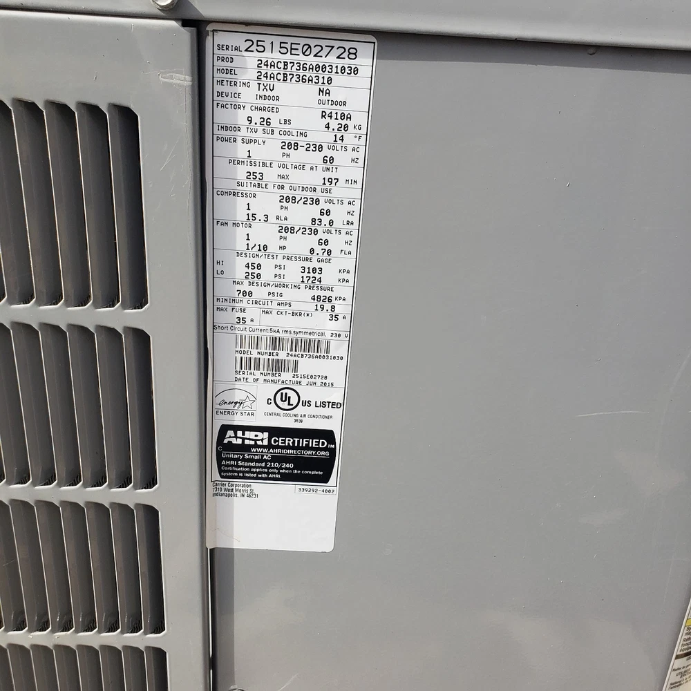 3The Carrier Performance Air Conditioner with a capacity of 36,000 BTU and a SEER rating of 17 is a high-quality central air conditioner unit designed for optimal efficiency and performance. Featuring a variable speed blower motor, this unit provides consistent and comfortable cooling in your home. Made of durable aluminum materials and manufactured in 2015, this air conditioner is a reliable choice for maintaining a pleasant living environment during hot weather conditions.