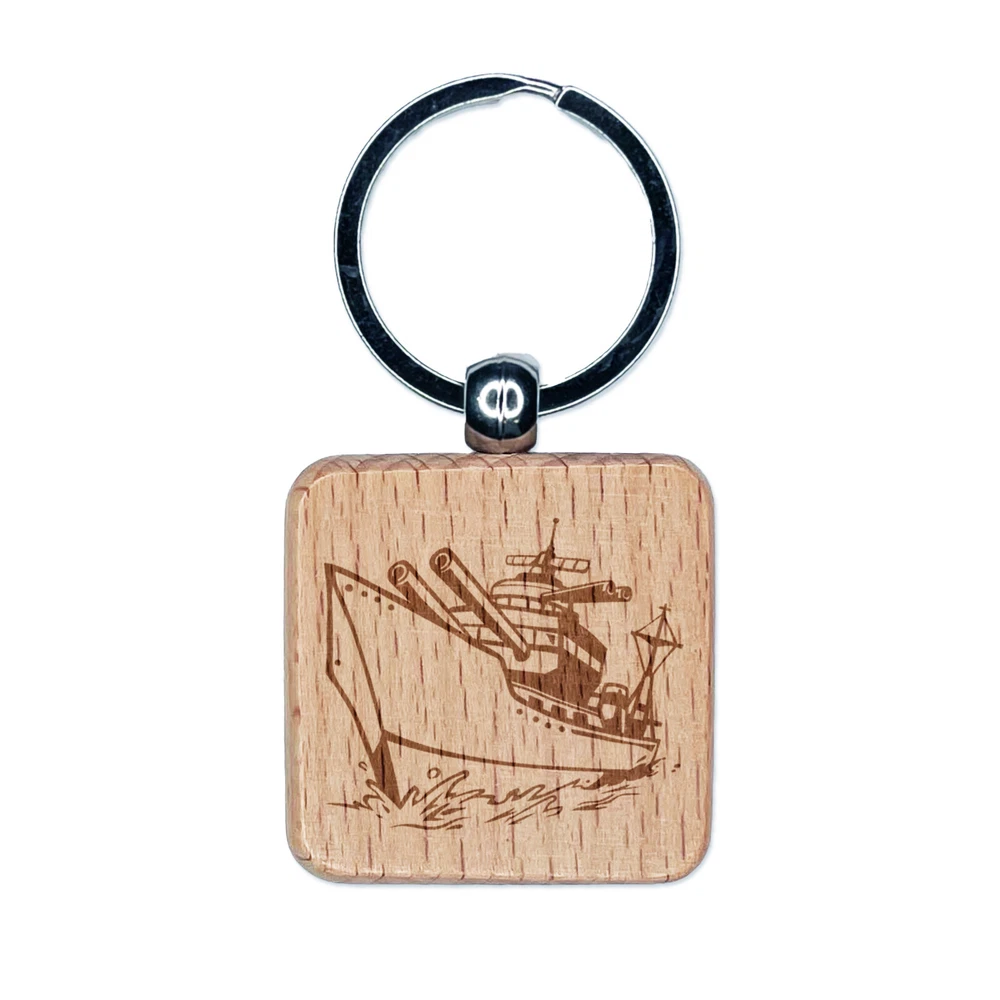 Cartoon Navy Battleship Engraved Wood Square Keychain Tag Charm
