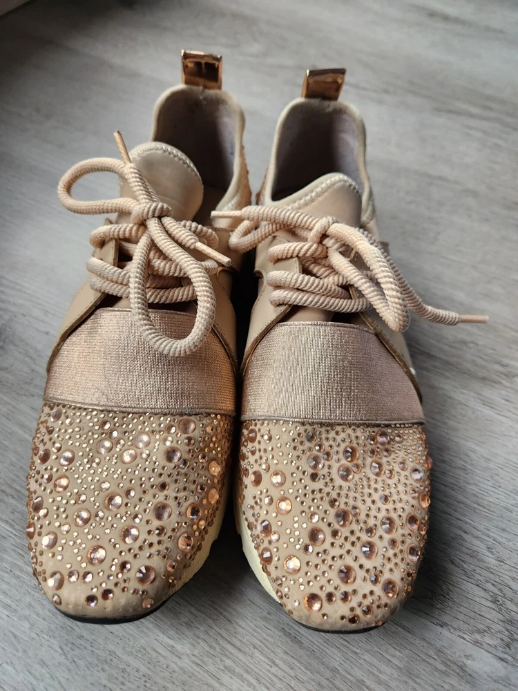 Step up your shoe game with these gorgeous Carvela rose gold sneakers! These stunners are perfect for a day out on the town or hitting the club with your friends. The metal cleats give them an athletic edge, while the studded accents add a touch of punk rock flair. Some wear and tare see pictures