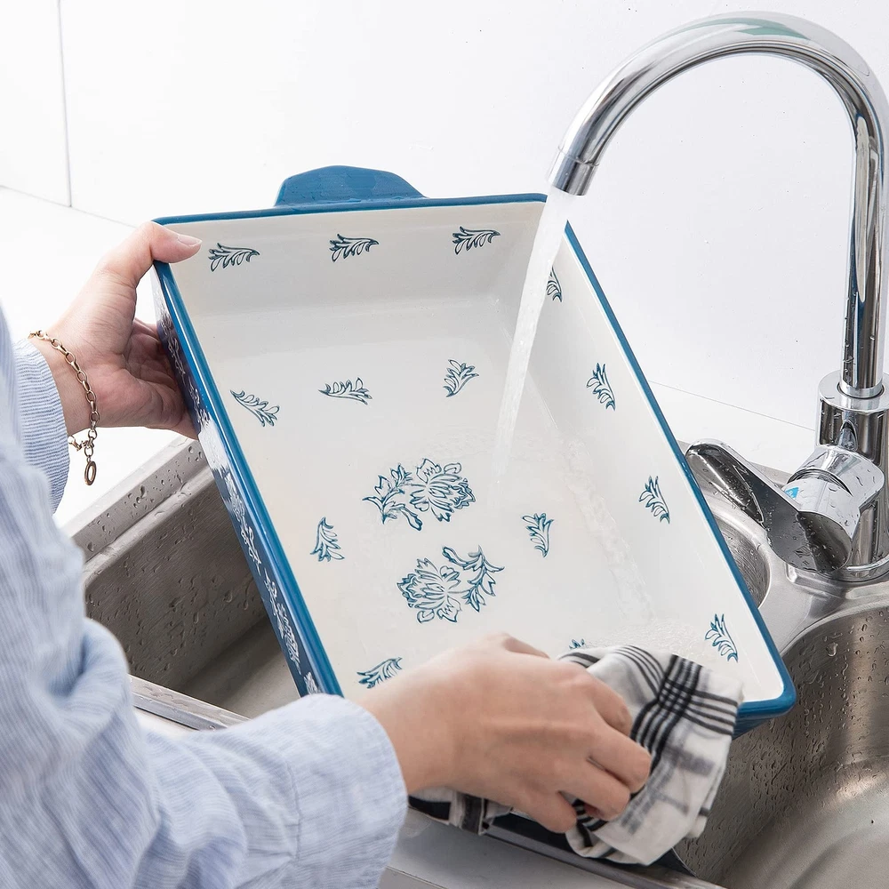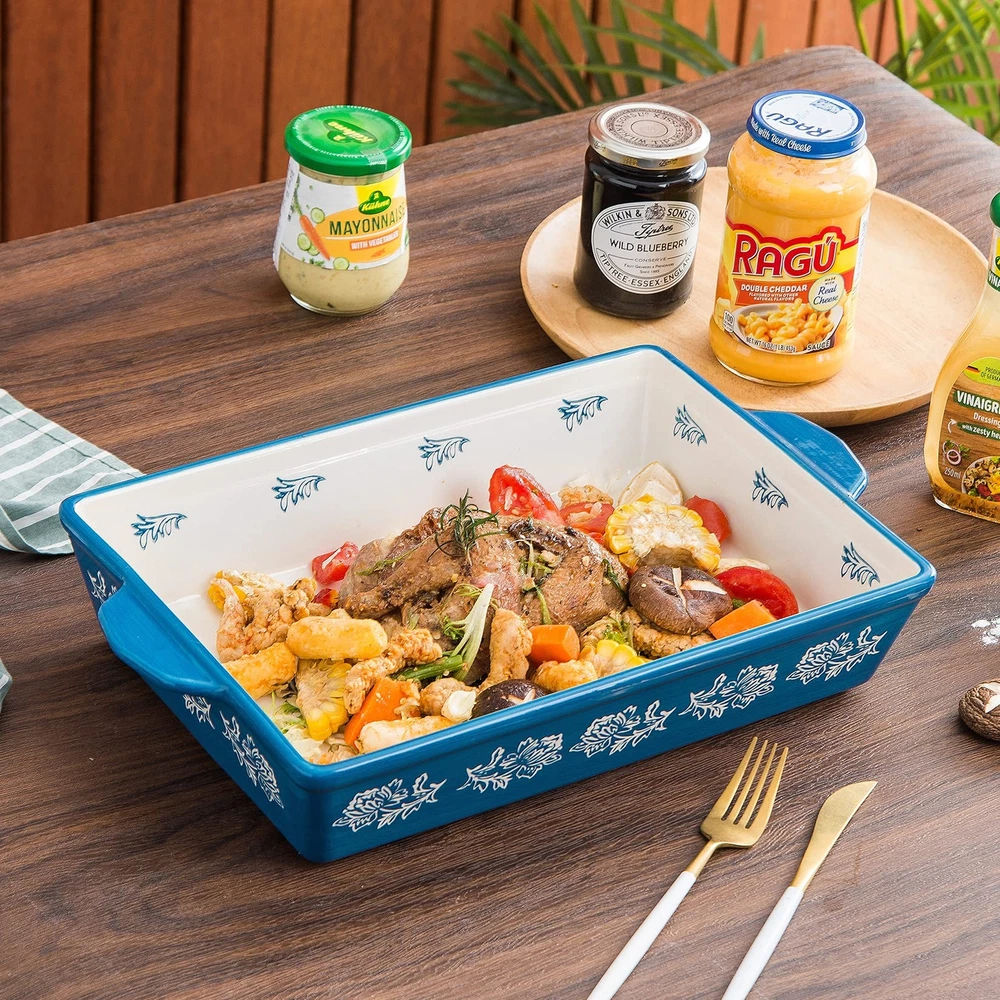 【HEALTHY MATERIALS】 The baking dish is The baking dish is made of durable porcelain, a type of premium healthy ceramic. chip-resistant and more sturdy than stoneware. Safe to use around your family. 【MULTIFUNCTIONAL USE】 The baking dish are ideal for making and sharing gratin, roasted meat, lasagna, casseroles, brownies, desserts. In addition, baking, serving, storing, and reheating all in dish. 【CONVENIENT CLEANING】 Whether you want to clean the baking dish by hand or with your dishwasher, it won't matter because the smooth porcelain texture makes cleanup a breeze. and It is suitable for microwave, freezer and oven( 400 ℉ /204 ℃).. 【BEAUTIFUL PATTERN】 The baking dish features unique rose pattern design and bright color for easy daily use. Classical and remarkable display can be a charming decoration in your table and kitchen. 【SCIENTIFIC DESIGN】 The double handles for more safety. Please use the Anti-hot gloves (excludes) to take the baking dish out when it is still hot. The baking dish can nest within another for convenient storage.