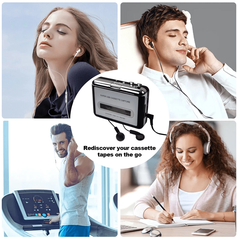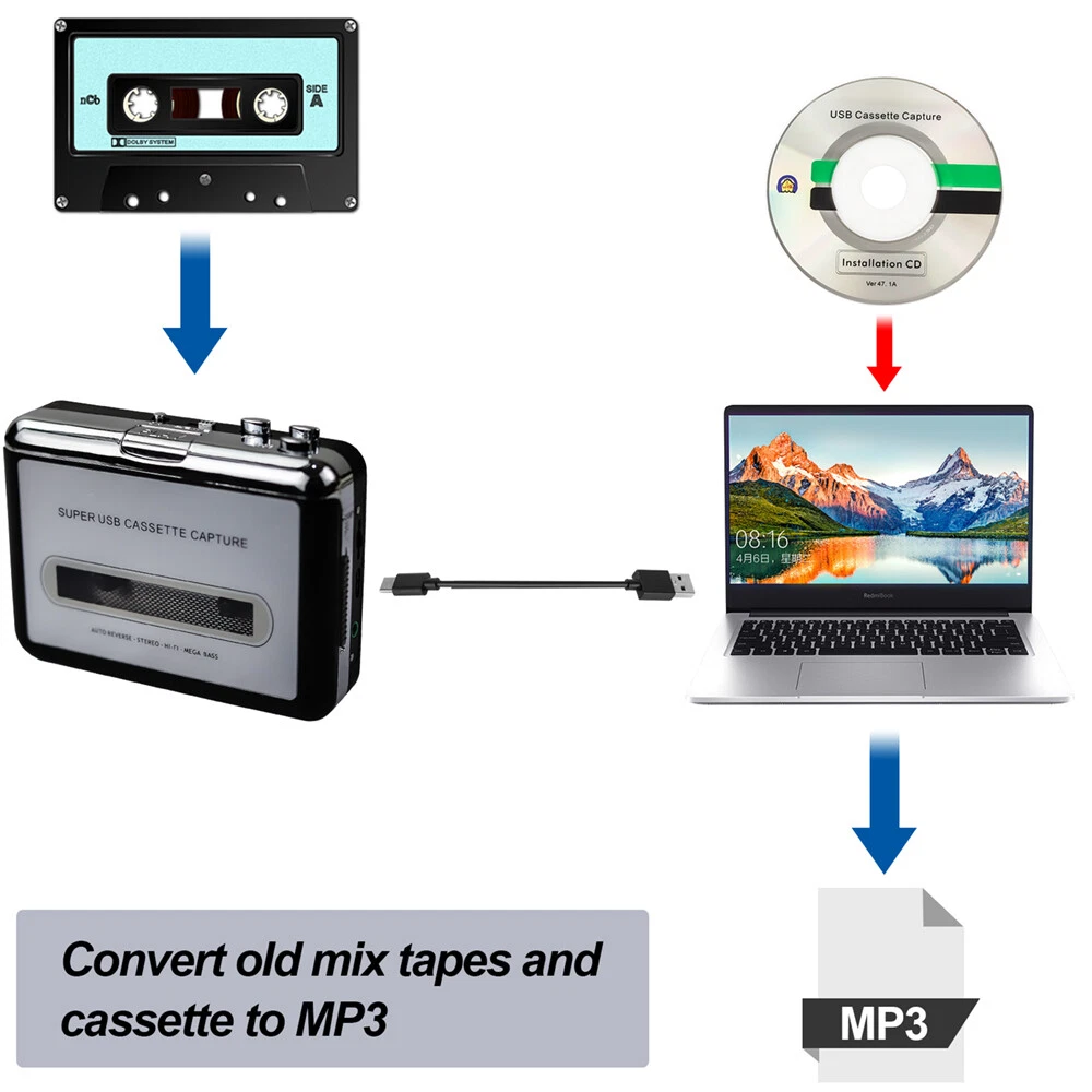 Product Features: Brand new and high quality guaranteed! Converts tape to MP3, quickly converts old cassettes to MP3 format via a USB cable. Can be used as . Better than just a recorder, it works perfectly as an old school, vintage with any standard headphones. Works perfectly with any standard 3.5mm AUX jack, you can use headphones, earbuds, or an audio port to your car speakers. Clear sound quality. By transferring your cassettes to MP3s in a quiet room, you can enjoy crystal Clear sound quality with even the oldest bands. Portable design fits in virtually any bag and enables you to play and transfer anywhere. Plug and Play USB device, no drivers required. Powered Operation: Battery or USB. Comes with tape converter software to guide you through transfer. Easy to use. How To Use Connect audio capture USB connector into your computers USB2.0 port and activate the software. Put a cassette into the cassette player. Push the Start button to transfer the tape. Click the Record button of the Software to record and click the Stop button when finished. Save as MP3 in PC. Buttons: Eject: slide to open the cassette holder. Volume: adjust the volume of headphones and USB connection. Headphones: connect headphone here. USB Connection: connect USB cable. Play: press to play tape. Stop: press to stop tape. FF/REW: press to fast forward or rewind tape. DIR: selects the direction of tape playback. Play Mode: selects what the tape does when it reaches the end of a side. Product Specification: Type:USB Cassette Capture Function:convert tapes and cassettes to MP3 Compatible PC OS:all except for Mac 10.5 or higher Consumed Power:≤1.5W Dimension:4.5*3.2*1.2in(110*80*30mm) Weight:5.18oz(148g) USB Cable Lenght:31.49in (800mm) Audio Cable Length:41.34in (1050mm) Package included: 1 x USB Cassette Capture 1 x Headphones 1 x USB cable 1 x Software CD 1 x User Manual
