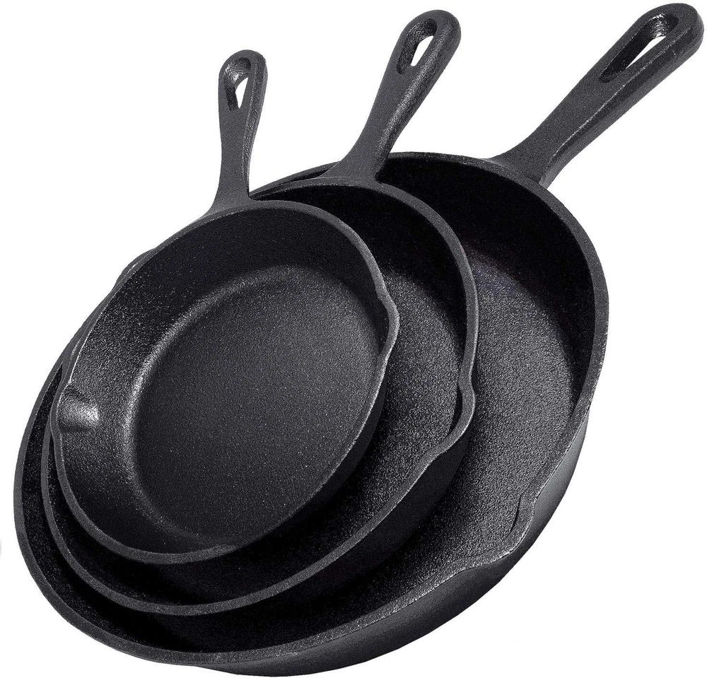 Cast iron skillets are a timeless must-have for every kitchen! The Cast Iron Skillet 3-Piece Set is better than a Lodge Cast Iron Skillet Set - just ask our customers! With this heavy duty and virtually indestructible, so they will last you years, decades, and generations to come! Our skillets are factory pre-seasoned, so they are ready to use straight out of the box. Our cast iron cookware is multi-functional, and suitable for many different cooking methods. Use them on the stovetop, in the oven, over a campfire, and even when slow-cooking! They’re perfect for frying, sautéing, cooking, grilling, and more. Plus our design has superior heat retention and conducts heat evenly, so your food will turn out great every time! Don’t wait. Purchase your own Cast Iron Skillet 3-Piece Set Now, and forgo purchasing just an ordinary Lodge Cast Iron Skillet Set! HEAVY DUTY – Cast iron skillets are a timeless must-have for every kitchen. The Cast Iron Skillet 3-Piece Set is virtually indestructible and will last years, decades. Better than any Lodge cast iron set! READY TO USE – The skillet set is ready to use, straight out of the box. They are factory pre-seasoned, which is much more effective than at home pre-seasoning. Factory pre-seasoning makes our cast iron skillets virtually non-stick, easy to clean, protected against scratches, and will also make your food rich in flavor! MULTI-FUNCTIONAL – Our cast iron cookware is multi-functional, and suitable for many different cooking methods. Use our skillets on the stove top, in oven, over a campfire, and even when slow-cooking! Our set is great for frying, sautéing, cooking, grilling, and more. HEAT RETENTION – Our design provides superior heat retention for cooking. And they conduct heat evenly, so that your meals will turn out perfectly cooked every time. Plus the sturdy handle aids in lifting, and provides a hole for hanging when not in use.