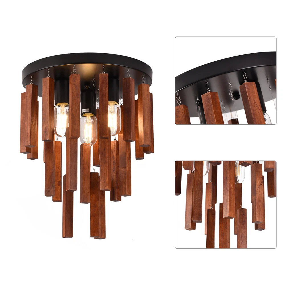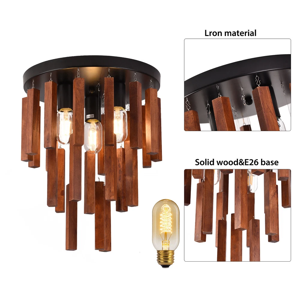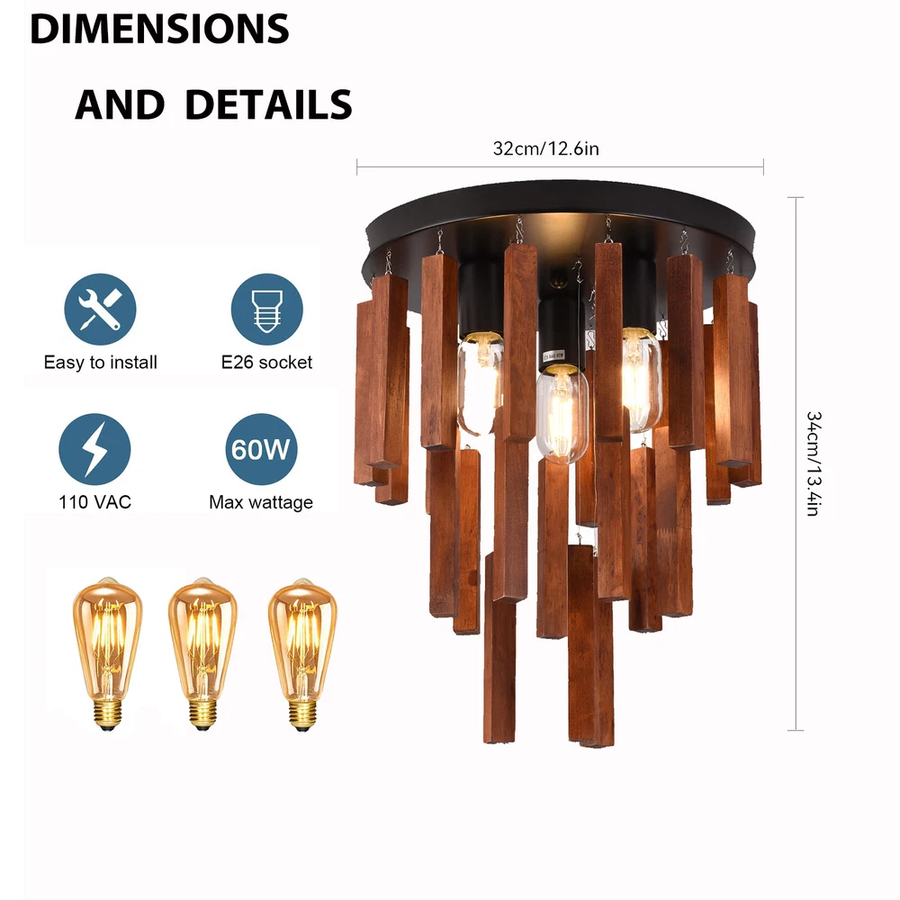 Ceiling Light Fixture Rustic Wooden Chandelier Retro Ceiling Semi Flush Mount Description This ceiling light uses solid wood and iron material, making it anti-rust , high-strength, and long-lasting. With wood forming the lampshade in a beautiful meteor form, it will cast a warm shimmering reflection on the ceiling when on, adding romance to your home. Key Features High-quality Material: This ceiling light adopts an iron chassis and solid wood lampshade, making it anti-rust , corrosion-resistant , and high-strength. Beautiful Lighting Effect: Applying evenly distributed rectangular wood, this ceiling light casts gorgeous rays on the ceiling to make a beautiful lighting effect and create a warm&romantic atmosphere in your living room. Retro Appearance: With a unique meteor form design and a classic round chassis, this ceiling light looks retro industrial, adding beauty and vintage elements to your room. Wide Compatibility: Three standard E26 bases make you choose different style bulbs such as LED, incandescent, and halogen to create different lighting effects. Dimmable: It is fully dimmable when used with dimmable bulbs and compatible dimming switches. Easy to Install : You can assemble the wood lampshade easily with the hooks. Then you just need to connect the wire reserved on the ceiling. And there is an English manual for your reference. Easy to Clean: Due to the painting surface treatment, you can easily wipe the dirt from it with a wet cloth. Ideal Gift: Thanks to its exquisite design, elegant appearance, and beautiful lighting effect, you can choose this ceiling light as a gift for housewarming to your friends. Protective Package: To prevent the product from being damaged and bumped during transportation, we packed it with pearl cotton to protect your products to the maximum extent possible. Details Hooks&Piercings: The piercings on the chassis&wood lampshade and hooks allow for convenient assembly. Open Bottom: With the open design, you just screw the E26 bulbs you want into the lamp holder. Stable Chassis: The round iron chassis with a nut in the middle ensures stable support for the light body and present classic beauty. Stainless Steel Wire: The solid wood is hung by stainless steel wires, making it sturdy. Application It is ideal for kitchens, hallways, living rooms, bedrooms, balconies, bars, aisles, foyers, hotels, restaurants, corridors, cafes, dining rooms, children's rooms, libraries, and other indoors. And its applicable area is 53-107.6ft². Specifications Model: 8923 Color: Black Material: Solid Wood, Metal Processes: Painting, Grinding Style: Retro Shape: Round Mounting Type: Ceiling Mount Indoor/Outdoor Usage: Indoor Specific Uses: Home Special Feature: Dimmable (Depending on the Bulbs you Choose) Light Fixture Form: Close to Ceiling Light Direction: Downlight Light Source: 3* E26 Bulbs (Not Included) Bulbs Type: LED, Incandescent, Halogen, Etc. Voltage: 110V Max. Single Bulb Power: 60W Applicable Area: 5-10m²/53-107.6ft² Chassis Thickness: 2.5cm/0.98inch Ceiling Light Height: 34cm/13.38inch Ceiling Light Diameter: 32cm/12.59inch Package Included 1* Ceiling Light 1* English Manual Notes Please check the product size before ordering to make sure it fits your room. You need 3 E26 bulbs with a single bulb less than 60W (not included). Please make sure the power is cut off before installation. To ensure your safety, we recommend that two people install this ceiling light together. Please install it by someone with an electrical license if necessary. Please use it in a dry environment. It is not suitable for outdoors and bathrooms because the wood will get wet. Please read the English manual carefully before installation. Please allow the slight color difference caused by the shooting light and 1-3cm error due to manual measurement, and make sure you do not mind before you order. Payment Delivery details Terms of sales About us Contact us Payment We accept ebay payment 。 Fees such as import duties, taxes are not included in the item price or shipping costs. These charges are the buyer's responsibility. Delivery details Shipping: 2-9 working days to: USA Terms of sales We maintain high standards of excellence and strive for hundred percent customer satisfaction. Feedback is very important to us. We hope that you contact us immediately before you give neutral or negative feedback, so that we can address your concerns. It is impossible to address issues if we do not know about them! About us Your satis faction is our ultimate goal. We work hard to earn your trust and future business. Our certified technicians have tested each item before shipping. The unit comes with 1 year limited warranty on all manufacturing defects. a) If you receive a defective item, you may return it or ask for a discount. Please contact us within 14 days after you receive the package. b) What you returned must be intact and in its original packaging as re? u. Customer is responsible for shipping costs of the returned item. c) We will cover the cost of shipping back t with the shipping rate indicated in the registration page. We will send you a new unit or refund the full payment you paid. Thank you. Contact us Business Hour Business Hour: Monday To Friday: 8:30 AM to 5:00 PM (Beijing China time) Due to time zones, our reply to your questions may not be immediately. But within above working time, we will reply your email within 24 hours. If it's non-workdays, please kindly be patient and wait till Monday. Please contact us with ebay message. Please feel free to contact us if you have any questions. Monday To Friday: 8:30 AM to 5:00 PM (Beijing China time) Due to time zones, our reply to your questions may not be immediately. But within above working time, we will reply your email within 24 hours. If it's non-workdays, please kindly be patient and wait till Monday. Please contact us with ebay message. Please feel free to contact us if you have any questions.