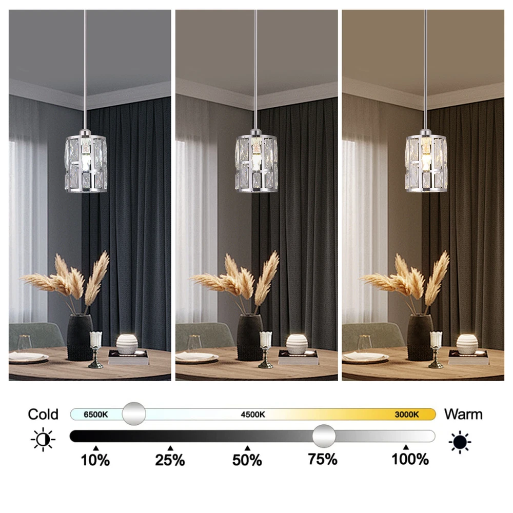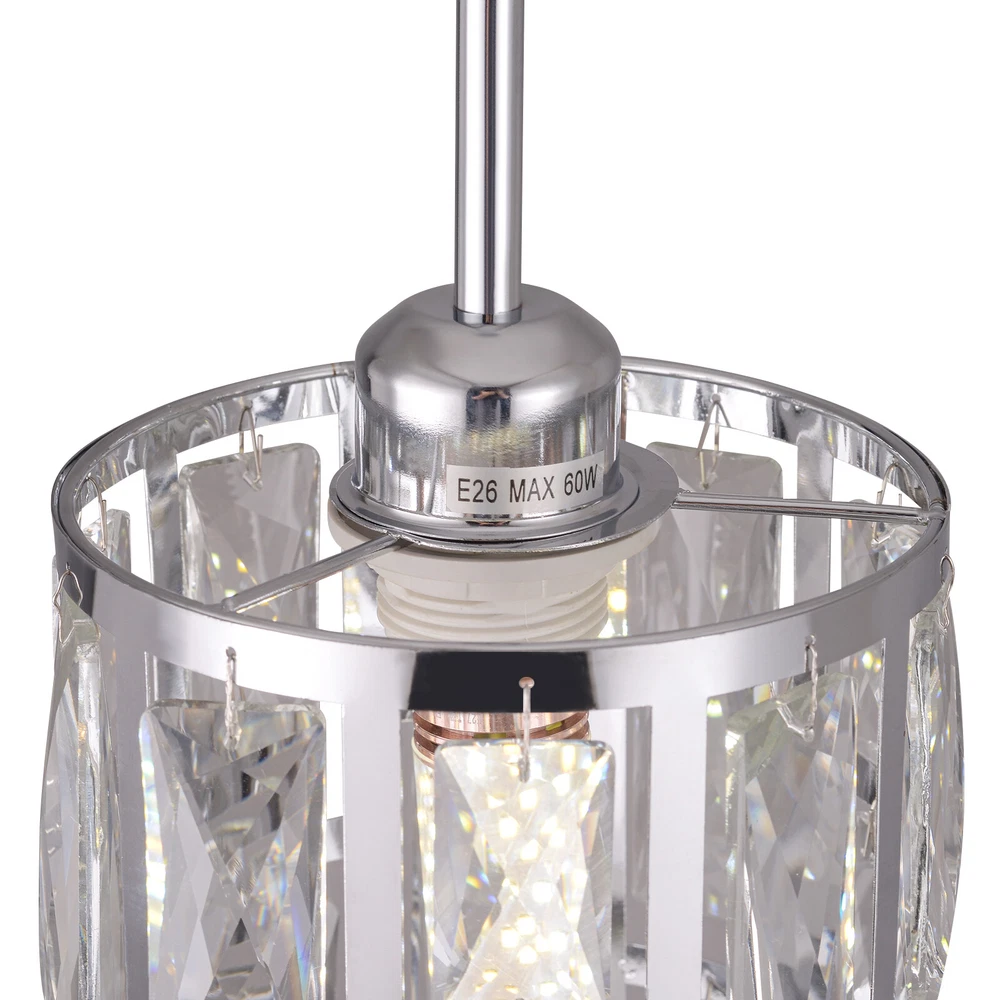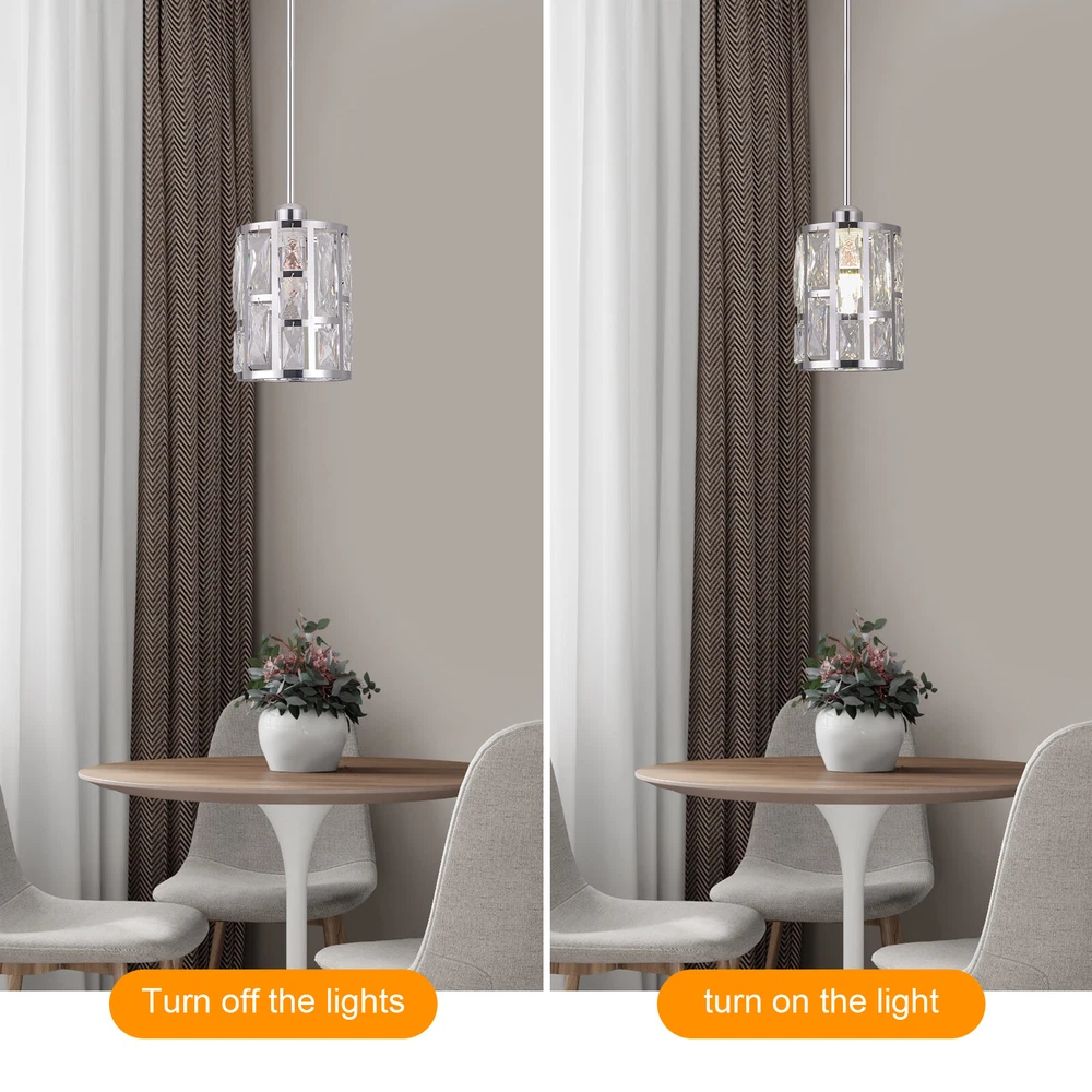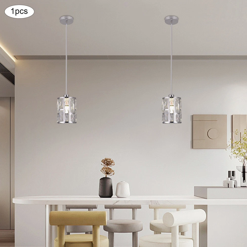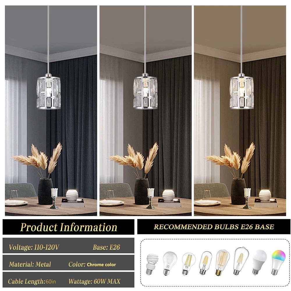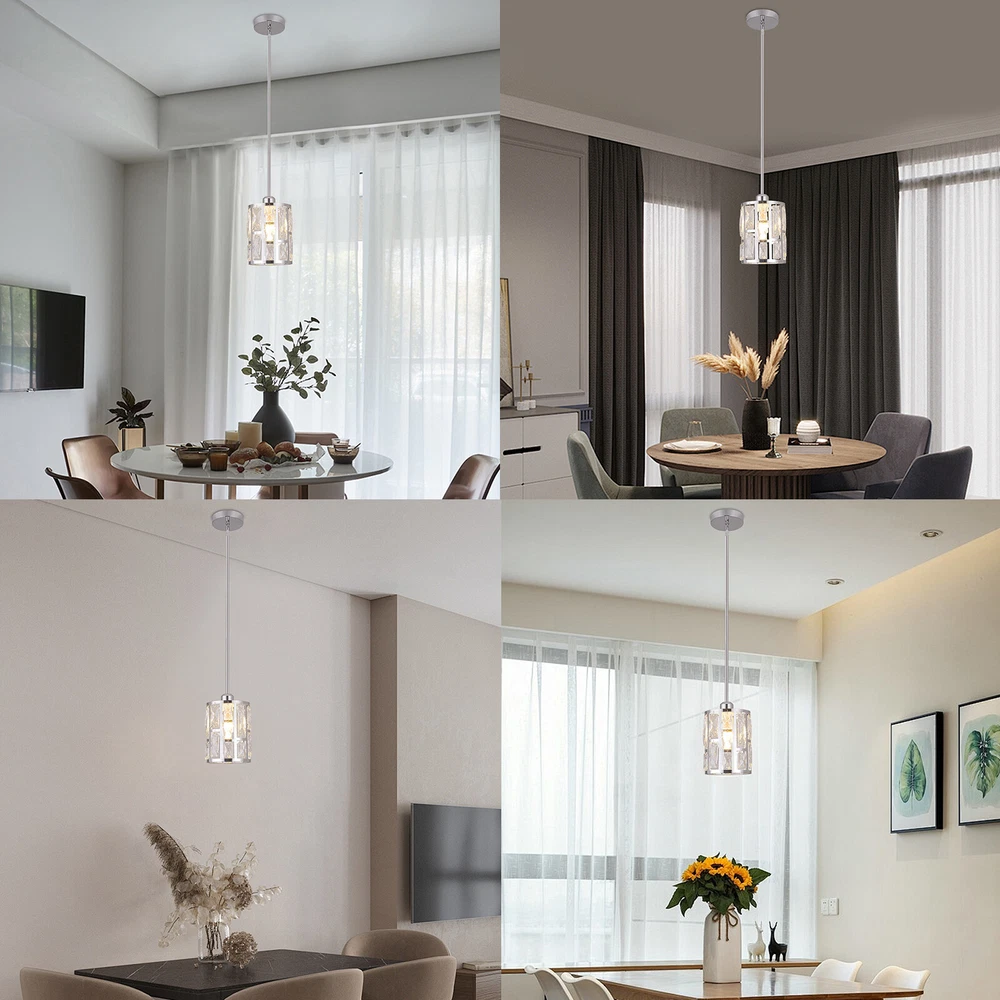 Description This ceiling light is both fashionable and practical. The combination of metal frame and crystals gives it a luxurious and exquisite look, adding a cozy and exquisite visual effect to the room. The standard E26 lamp holder makes it compatible with a variety of bulbs, and you can also adjust the height of the light according to your needs. This product is not only a lamp, but also a beautiful decoration. Come and buy it. Key Features Eye-catching Appearance: The noble and elegant silver frame is combined with highly clear crystals, adding a touch of sophistication to the fixture. When the light is on, the light reflected from the exquisite crystal casts a fascinating glow, bringing you an extremely beautiful visual enjoyment and romantic atmosphere. Sturdy and Durable: This pr Ceiling-mounted Light, Adjustable Height, Modern Crystal Pendant Light Fixture? Description This ceiling light is both fashionable and practical. The combination of metal frame and crystals gives it a luxurious and exquisite look, adding a cozy and exquisite visual effect to the room. The standard E26 lamp holder makes it compatible with a variety of bulbs, and you can also adjust the height of the light according to your needs. This product is not only a lamp, but also a beautiful decoration. Come and buy it. Key Features Eye-catching Appearance: The noble and elegant silver frame is combined with highly clear crystals, adding a touch of sophistication to the fixture. When the light is on, the light reflected from the exquisite crystal casts a fascinating glow, bringing you an extremely beautiful visual enjoyment and romantic atmosphere. Sturdy and Durable: This product is made of premium iron and crystal and adopts an electroplating process, which is rust-proof, and corrosion-resistant, and can be used for a longer time. Convenient to Use: The standard E26 lamp holder can support the use of LEDs, Halogens, etc., making it very convenient for you to buy and replace bulbs. Wide Adaptability: You can adjust the height of the lamp to suit rooms of different heights by changing the number of suspension rods. In addition, this product can be mounted on sloped ceilings, making it highly adaptable. Dimmable Design: By purchasing dimmers and dimming bulbs (both not included), you can also adjust the light to create different lighting effects. Simple Installation: The simple structure, complete accessories, and English manual allow you to quickly and easily complete the installation and start to use it. Easy to Clean: Thanks to the simple construction, the light is easy to clean, and you just need to gently wipe it to remove the dust on the surface. Protective Package: Foam can effectively reduce the normal impact and ensure that it is fully delivered to you to the greatest extent. Ideal Gift: With its elegant appearance and practical function, it is a good gift for friends, loved ones, coworkers, and other people on holidays, birthdays, or housewarming days. Good Service: We aim to provide quality products and services. If you have any problems, please feel free to contact us. We will reply and solve the problem for you as soon as possible. Details Smooth Edges: They not only ensure safer use but also improve the beauty of the product. Stable Base: The thickened base of 4.72" in diameter increases stress area and can make the item fixed firmly without falling easily. Application It can be used in living rooms, bedrooms, kitchens, dining rooms, reading rooms, apartments, villas, malls, hotels, restaurants, coffee shops, dessert stores, and other places. Specification Material: Iron, Crystal Process: Electroplating Color: Silver Shape: Cylinder Style: Modern Indoor/Outdoor Usage: Indoor Assembly Required: Yes Control Method: Wall Switch (Not Included) Mount Type: Ceiling Mount Voltage: 110V Light Source: 1* E26 Bulb (Not Included) Efficiency: E Max. Bulb Power: 60W Adjustable Height: Total 60cm/23.62in (30cm/11.81in, 20cm/7.87in, 10cm/3.93in) Suitable for Room Height: 2.6-3m/8.53-9.84ft Overall Height: 125cm/49.2in Base Diameter: 12cm/4.72in Lampshade Size(D*H): 15*20cm/5.9*7.87in Package Size: 25*15*15cm/9.84*5.91*5.91in Gross Weight: 1.5kg/3.31 lbs Net Weight: 1.2kg/2.64 lbs Package Included 1* Ceiling Light 1* Base 1* English Manual All Accessories for Installation Notes Please check the dimensions of the product before ordering to ensure it fits your home. Please note that the bulb is not included and you will need to purchase an E26 bulb yourself. Please disconnect the power supply before installation, and wear insulated gloves (not included), or you can seek professional installation. Please use the lamp within the applicable voltage range and clean it regularly. Please cut off the power supply when you clean the light or replace the light bulb. Please wipe with a soft cotton cloth and do not use household cleaning agents. Please read the instructions carefully before installation and use. Please note that this product is not waterproof, so please do not use it outdoors. Please note that the brightness depends on the power of the bulb. Please allow the slight color difference caused by the shooting light and 1-3cm error due to manual measurement, and make sure you do not mind before ordering. Payment Delivery details Terms of sales About us Contact us Payment We accept ebay payment 。 Fees such as import duties, taxes are not included in the item price or shipping costs. These charges are the buyer's responsibility. Delivery details Shipping: 2-9 working days to: USA Terms of sales We maintain high standards of excellence and strive for hundred percent customer satisfaction. Feedback is very important to us. We hope that you contact us immediately before you give neutral or negative feedback, so that we can address your concerns. It is impossible to address issues if we do not know about them! About us Your satis faction is our ultimate goal. We work hard to earn your trust and future business. Our certifi