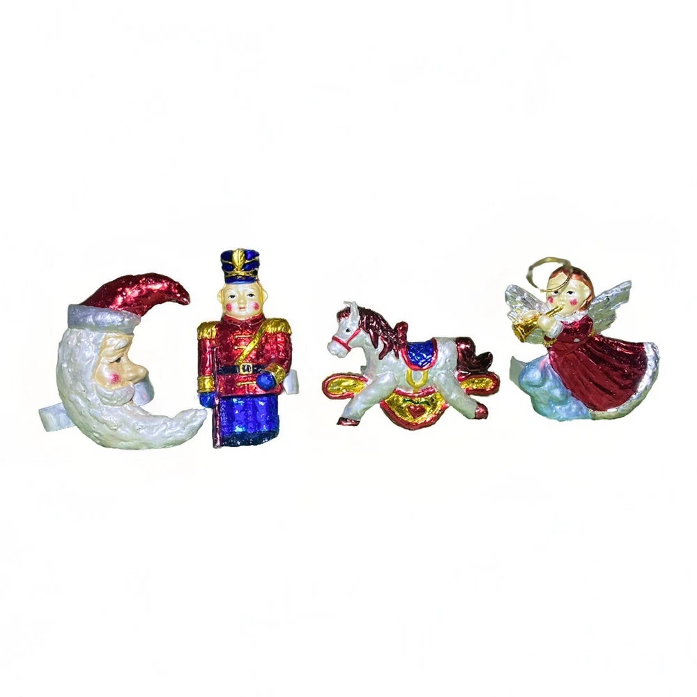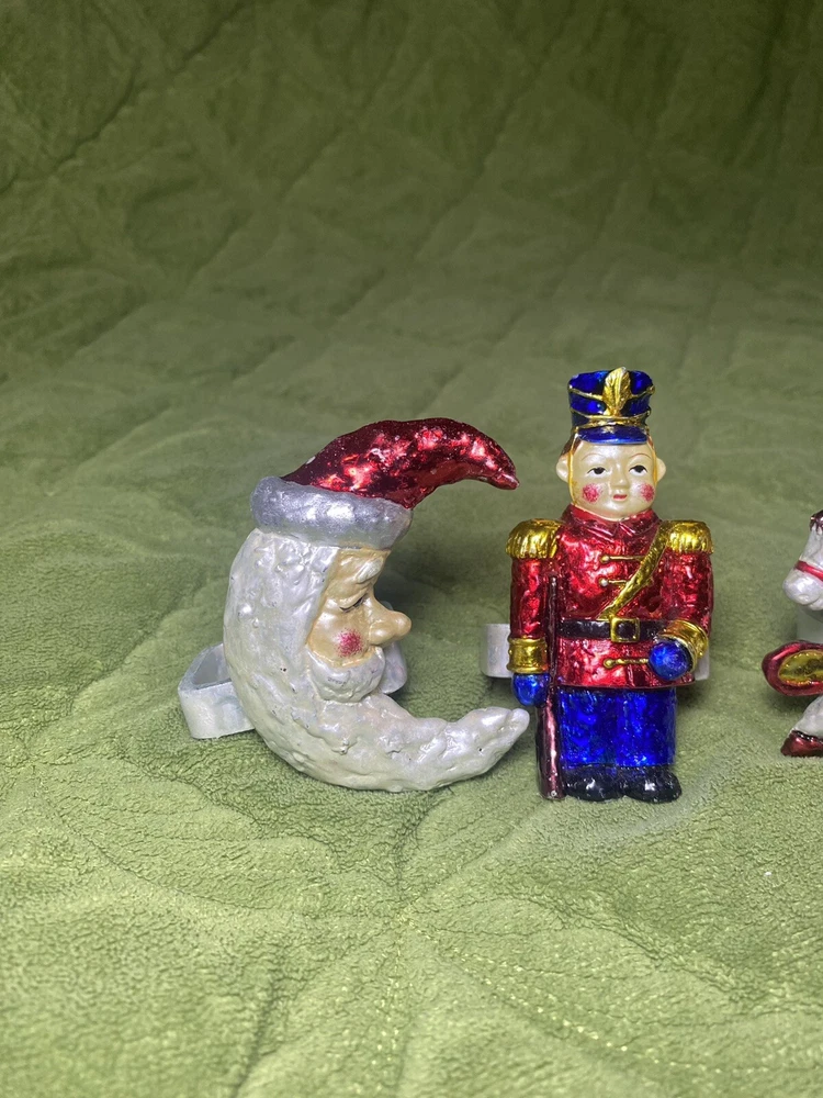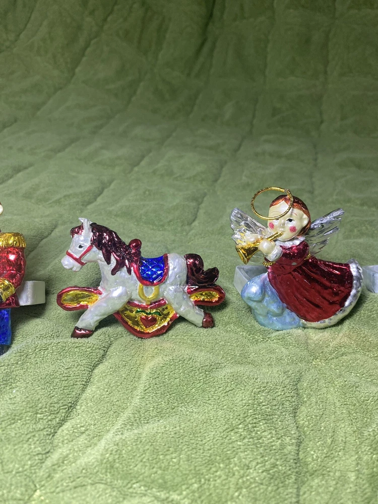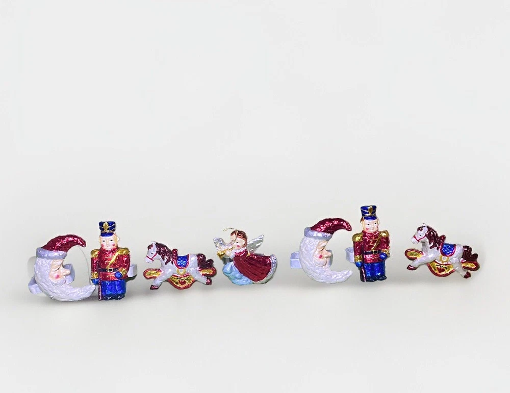 2sets of 4 available of these amazing 90’s eclectic Christmas vibe celestial Christmas napkin rings featuring a theme high gloss iridescent crescent moon Santa, toy soldier, rocking horse, and angel. The napkin rings are made of what I think may be porcelain and are hand-painted in a warm navy & cranberry color way. One of the Angel napkin rings have been repaired. designed for the Holiday Christmas season celebrations and should be hand washed with care and hand dried. I do need to make contact with you via messages before shipping During inclement weather conditions- understand that there may be some delays in shipping that are unavoidable. so make sure you’re ordering with ample time to receive if that’s a possible issue. Depending on where you ship to- I may request signature on delivery. Warehouses apartments businesses duplexes etc. just to be sure YOU receive your order. We do offer gift wrapping & personalized gift notes.