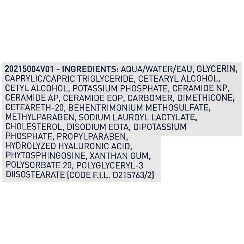Developed with dermatologists, CeraVe Daily Moisturizing Lotion for Normal to Dry Skin has a unique, lightweight formula that provides 24-hour hydration and helps restore the protective skin barrier with three essential ceramides (1,3,6-II). The formula also contains hyaluronic acid to help retain skin’s natural moisture. Accepted by the National Eczema Association, this product is gentle on skin, non-irritating, oil-free, fragrance-free, allergy tested, and non-comedogenic (won't clog pores). Suitable for normal to dry skin (including sensitive skin) as a body lotion, face moisturizing lotion, and/or hand lotion. Unisex. Ages 18+ DAILY MOISTURIZING LOTION : Smooth, light-weight texture that is absorbed quickly, leaving skin feeling smooth and hydrated, never greasy LONG-LASTING HYDRATION : Contains Hyaluronic Acid to help retain skins natural moisture and MVE technology to provide 24 hour hydration GENTLE ON SKIN : Holds National Eczema Association (NEA) Seal of Acceptance. Fragrance free, allergy-tested, non-comedogenic, and suitable for use as a body lotion, face moisturizing lotion, and/or hand lotion 3 ESSENTIAL CERAMIDES : Ceramides are found naturally in the skin and make up 50% of the lipids in the skin barrier. All CeraVe products are formulated with three essential ceramides (1, 3, 6-II) to help restore and maintain the skin’s natural barrier DEVELOPED WITH DERMATOLOGISTS : CeraVe Skincare is developed with dermatologists and has products suitable for dry skin, sensitive skin, oily skin, acne-prone, and more. Skin Care Key Benefits Moisturizing Scent Fragrance-Free Body Part Face, Body, Chest, Back, Neck, Shoulder, Knee Brand CeraVe Manufacturer CeraVe LLC Features N/A Gender Unisex Age Group Adult, Teen, Tween, Child Assembled Product Dimensions (L x W x H) 1.95 x 3.38 x 7.60 Inches Indications Skin Care Concern Dryness Directions Instructions Apply liberally as often as needed, or as directed by a physician. Warranty Warranty information Please be aware that the warranty terms on items offered for sale by third party Marketplace sellers may differ from those displayed in this section (if any). To confirm warranty terms on an item offered for sale by a third party Marketplace seller, please use the 'Contact seller' feature on the third party Marketplace seller's information page and request the item's warranty terms prior to purchase. Ingredients Ingredients "AQUA / WATER / EAU GLYCERIN CAPRYLIC/CAPRIC TRIGLYCERIDE CETEARYL ALCOHOL CETYL ALCOHOL POTASSIUM PHOSPHATE CERAMIDE NP CERAMIDE AP CERAMIDE EOP CARBOMER DIMETHICONE CETEARETH-20 BEHENTRIMONIUM METHOSULFATE METHYLPARABEN SODIUM LAUROYL LACTYLATE CHOLESTEROL DISODIUM EDTA DIPOTASSIUM PHOSPHATE PROPYLPARABEN HYDROLYZED HYALURONIC ACID PHYTOSPHINGOSINE XANTHAN GUM POLYSORBATE 20 POLYGLYCERYL-3 DIISOSTEARATE" Active Ingredients Hyaluronic Acid Active Ingredient Name Hyaluronic Acid