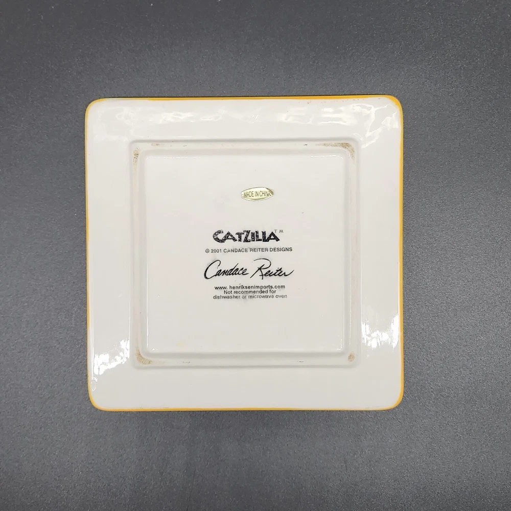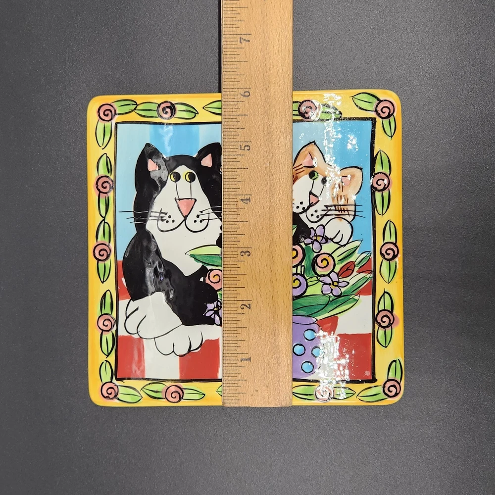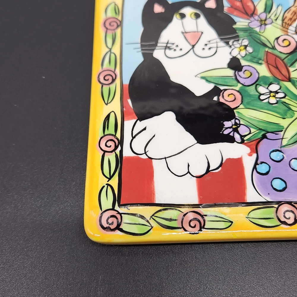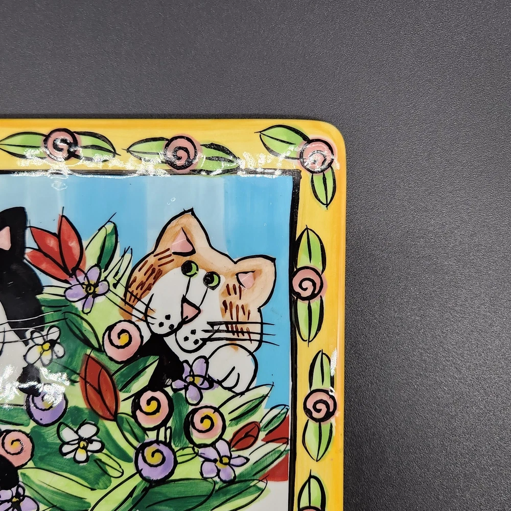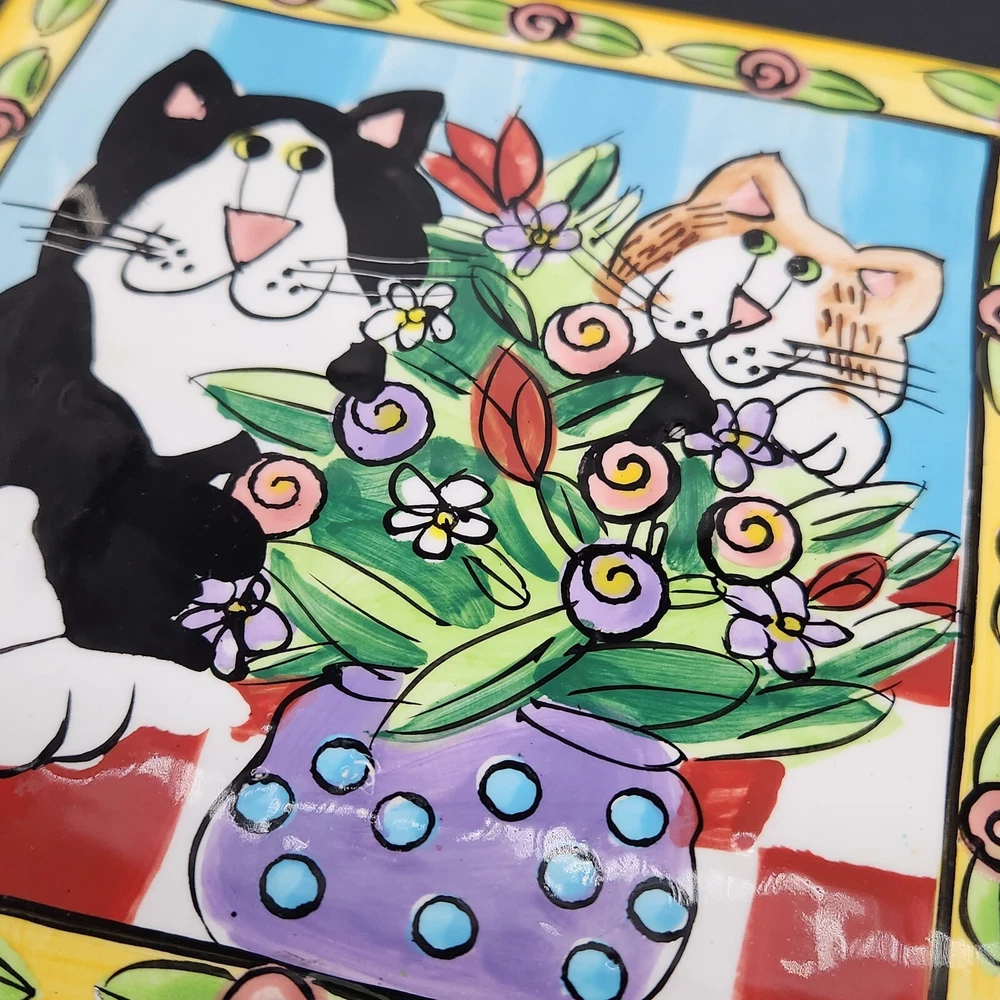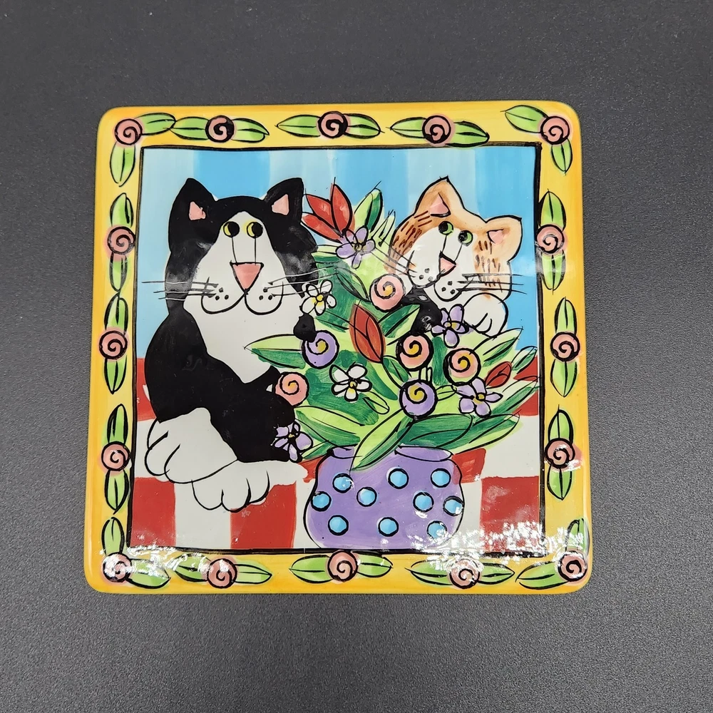 This square plate/trivet is like a feline sitcom, starring two mischievous cats in the middle of an epic floral heist. Whether you're a cat lover or simply enjoy quirky decor, this plate adds a splash of humor and color to any setting. • Made of durable ceramic • Features colorful cat and floral design • Measures 6 inches by 6 inches • Designed by Candace Reiter • Hand wash recommended Used but in very good condition. No chips or cracks. See photos for details.