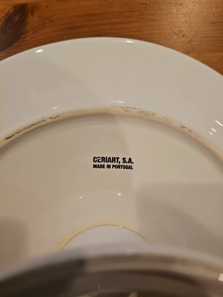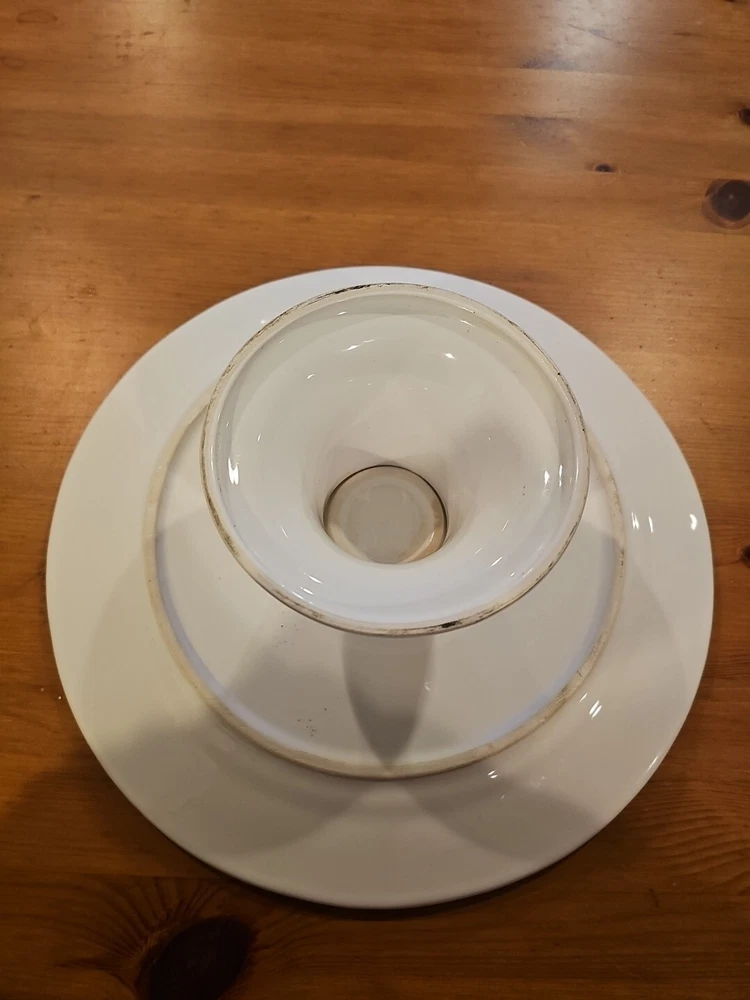 Add a touch of elegance to your dessert table with this beautiful white ceramic cake stand from Ceriart S.A. Made in Portugal, this round stand measures 12 inches in diameter and 4 inches in height, perfect for showcasing your favorite cakes and pastries. The stand features a beaded edge design and is solid in pattern, making it a great addition to any occasion, whether it's a wedding, birthday, or just a regular Sunday afternoon tea. Small chip underneath but does not effect look or use