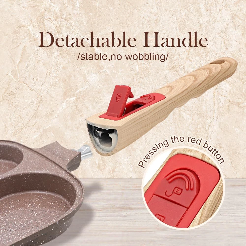 HEALTHY COOKING - The egg pan is made from high quality materials and covered with a healthy ceramic coating that is more durable than traditional coatings and free from any harmful substances including PFAS and PFOA. 4-CUP DESIGN - This omelette pan has a multi-hole design, so you can make 4 omelettes or pancakes at once, which is a great time saver. Comes with a flat lid that makes the food get a better flavor. APPLICATION - Suitable for all stoves. To protect the coating, low heat is recommended. Take care to use low heat when using on gas, as this pan is a little smaller than a regular pan and using high heat will likely burn the handle. EASY STORAGE - This egg pan is newly upgraded with a removable handle that can be easily removed with just a press, eliminating the hassle of turning screws and making it easy to either hang on the wall or put in a cabinet for storage. BOX CONTENTS - 1* ceramic egg pan, 1* silicone brush, 1* silicone spatula. Please feel free to contact us with any questions.