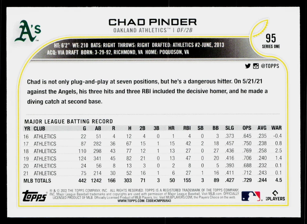 You will receive a , Chad Pinder 2022 Topps #95 Oakland Athletics Near Mint or Better condition. Please note i am not a professional card grader the condition of raw cards can be very subjective. Please refer to the high quality pictures to determine condition yourself any questions at all please feel free to ask!! we take pride in the quality of cards we sell and ship, all cards will be shipped in a penny sleeve and top loader for added protection. be sure to save us as a seller, as we are growing and listing daily THANK YOU FOR YOUR BUSINESS