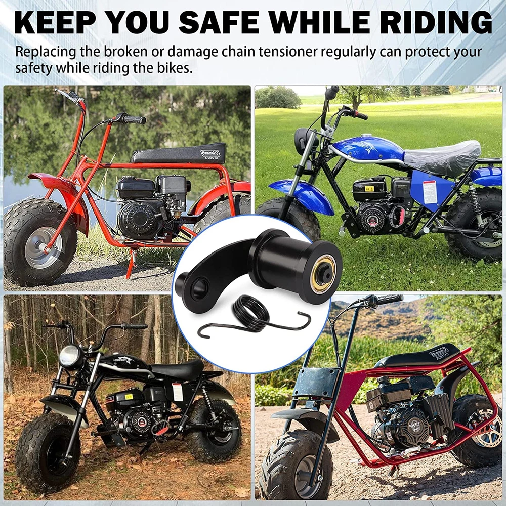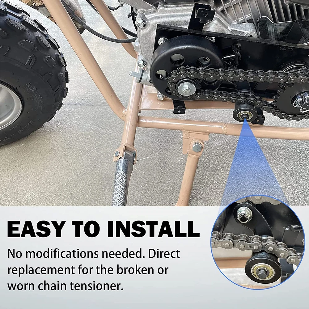 CHAIN TENSIONER WITH 1-3/4" ROLLER - Chain tensioner plays an important role in the operation of the drive system. Heavy duty chain tensioner work as a adjuster roller guide can prevent chain loose, fall off, reduce sprocket/chain wear. Replacing the broken or damage chain tensioner regularly can protect your safety while riding the bikes. COMPATIBLE WITH - Fit for Coleman Powersports BT200X,CT200U-EX CT200U-EXR CT200U Trail CT200U-A CT200U-AC; Baja Motorsports Mini Bike MB165 MB200 (Heat, Mini Baja, Warrior); Hensim Mini Bike MB165 & MB200 (Heat, Mini Baja, Warrior); MASSIMO MB200; TrailMaster MB200; 6.5hp Powersports Mini Bike. Please check the size and compatibility before ordering! PREMIUM QUALITY - FEITON Chain Tensioner with 1-3/4" Roller for 6.5HP Massimo MB200 Hensim Baja Heat Warrior MB165 MB200 Coleman Ct200u Falcon 200 Mini Bike Motorsports manufactured by FEITION undergo strict quality control throughout the production process. During each step of production multiple quality control checks are performed to insure every parts can last for long lifespan. Durable and Reliable! PACKAGE INCLUDES - 1 Piece Chain Tensioner, 1 Piece Chain Tensioner Spring. A bad chain tensioner can be identified by a loose chain that falls off during ride time, so please check and replace it regularly! BUY WITH CONFIDENCE - FEITON Chain Tensioner with 1-3/4" Roller Arm Spring comes with 1-Year Warranty, if you have any questions when using this chain tensioner parts on your BT200X, CT200U Trail, and CT200U-EX mini bikes, 6.5HP Massimo MB200 Hensim Baja Heat Warrior MB165, please don’t hesitate to contact us for a replacement. We will reply your email within as soon as possible. Product Description Upgraded Chain Tensioner Wiith 1-3/4" Roller Function: Chain tensioner plays an important role in the operation of the drive system. Heavy duty chain tensioner work as a adjuster roller guide can prevent chain loose, fall off, reduce sprocket/chain wear. Replacing the broken or damage chain tensioner regularly can protect your safety while riding the bikes. Compatible with: For BT200X, CT200U Trail, and CT200U-EX mini bikes; For 6.5HP Massimo MB200 Hensim Baja Heat Warrior MB165 Specifications: Brand: FEITON Condition: Brand New Color: Black Package Including: 1 * Chain Tensioner, 1 * Chain Tensioner Spring Please check the size and compatibility before ordering! Chain tensioner plays an important role in the operation of the drive system. Heavy duty chain tensioner work as a adjuster roller guide can prevent chain loose, fall off, reduce sprocket/chain wear. Replacing the broken or damage chain tensioner regularly can protect your safety while riding the bikes. FEITON Chain Tensioner with 1-3/4" Roller for 6.5HP Massimo MB200 Hensim Baja Heat Warrior MB165 MB200 Coleman Ct200u Falcon 200 Mini Bike Motorsports manufactured by FEITION undergo strict quality control throughout the production process. Package Includes: 1 Piece Chain Tensioner, 1 Piece Chain Tensioner Spring. A bad chain tensioner can be identified by a loose chain that falls off during ride time, so please check and replace it regularly! During each step of production multiple quality control checks are performed to insure every parts can last for long lifespan. Durable and Reliable!
