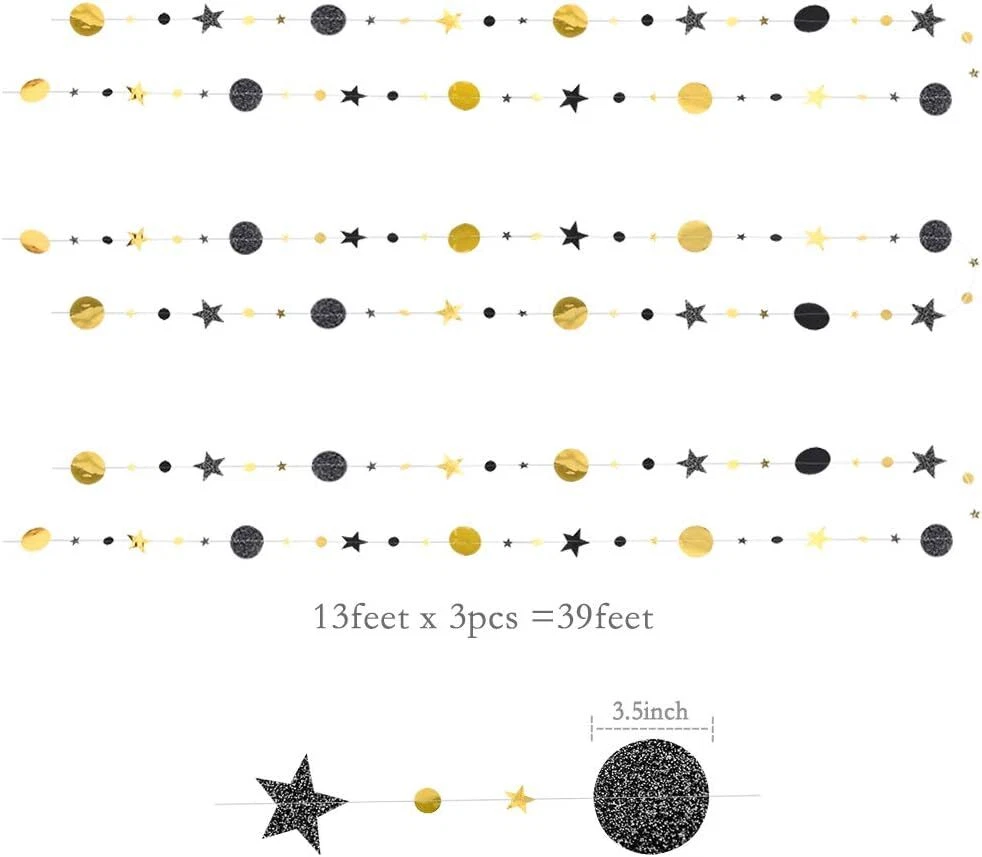 Cheerland Black Gold Party Decorations Moon Star Garland Hanging Product Details Brand: Cheerland Color: Gold Black Material: Paper Item Length: 468 Inches Is Artificial Garland: No ·Package Includes: 3 strings of 13 feet glittering and shiny black gold star and moon circle garlands. Totally 39 ft. The biggest paper circle is 3.5 inches in diameter. ·Black Gold Party Decorations: The black and gold stars and moons streamer made of glitter and shining card paper sway in the breeze and reflect light from all angles. These garlands are gorgeous party decorations to create a elegant and classy atmosphere at home or any festive event. ·Brilliant Decor for Most Occasions: These garlands are perfect decorations for most parties and celebrations such as wedding, engagement, bachelorette, bridal shower, baby shower, christening, birthday/Bday, sweet 16, graduation, retirement, Christmas and NYE New Year Eve, space themed parties, galaxy themed, proms, homecoming, fantasy themed, halloween, masquerade, galactic themed party, star wars party. They are also good ornaments for Islamic celebrations for Ramadan, Hari Raya and EID. Easy to Use: NO DIY needed. Unravel the strings with care to avoid tangling. Just hang them or stick them on wall, window, furniture, from ceiling or as background, backdrop of photo booth. Easy to remove and store for future reuse. Cheerland is an established brand of party decorations & supplies. We excel at creating novel designs and manufacturing quality products to suit your decoration needs. Come visit our shop often, you will surely find some interesting add-ons for your home and parties.