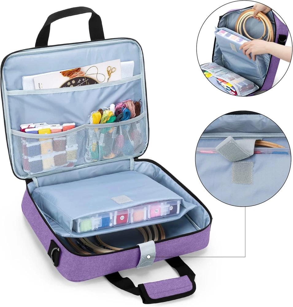 FABRIC: Crafted from durable heavy-duty nylon. NO ACCESSORIES INCLUDED. PROTECTIVE: Features thick padding sandwiched between layers of material to ensure your embroidery supplies remain in excellent condition. MAIN COMPARTMENT: Equipped with 2 inner padded sleeves designed to hold embroidery hoops (up to 11.2”) and an embroidery floss kit. Includes a spacious pocket and 2 mesh pockets for storing embroidery fabric, floss organizers, and more. FRONT ACCESSORIES STORAGE: Contains 4 elastic bands and pockets to securely hold marking pens, scissors, and similar tools. Additionally, there are 3 larger pockets for pin cushions, floss bobbins, and other essential accessories. PORTABLE: Dimensions of 15.25" x 3" x 12.5" (L x W x H) with sturdy handles and a detachable shoulder strap for convenient transport. Product Description FABRIC Constructed from heavy-duty nylon for lasting durability. Thick padding between layers protects your embroidery supplies from damage. Note: Accessories are not included with the bag. MAIN COMPARTMENT Features a large pocket and 2 mesh pockets to accommodate embroidery fabric, floss organizers, and other supplies. Includes 2 inner padded sleeves for safely storing embroidery hoops (up to 11.2”) and your embroidery floss kit. Designed with 4 elastic bands and pockets to secure marking pens, scissors, and other tools. 3 additional larger pockets are available for pin cushions, floss bobbins, and various accessories. ACCESSORIES STORAGE A back pocket is provided for storing small accessories, with the option to also store the shoulder strap. Dimensions: 15.25" x 3" x 12.5" (L x W x H). Equipped with sturdy handles and a detachable shoulder strap for easy carrying.