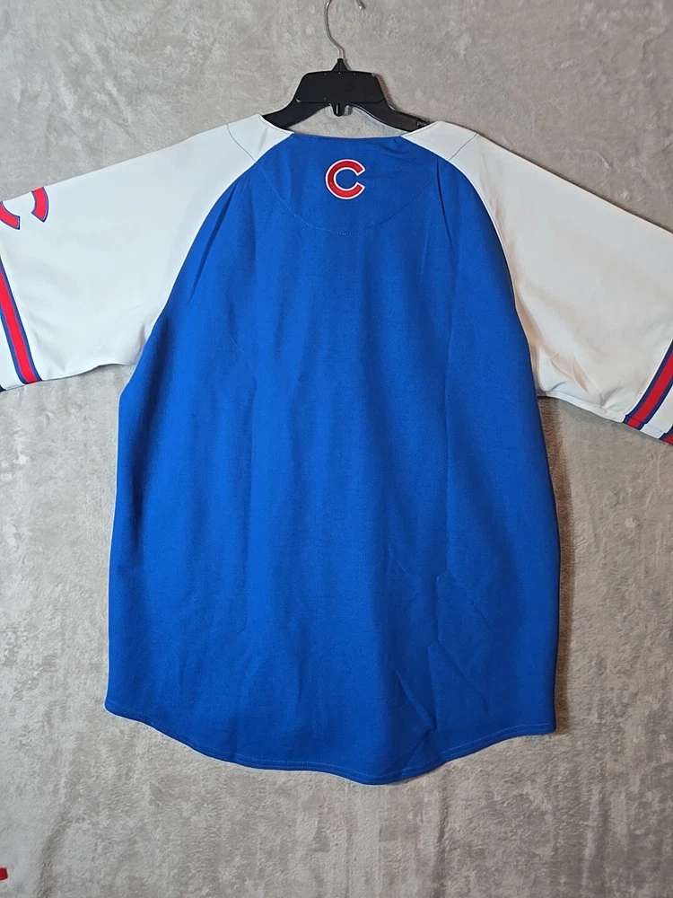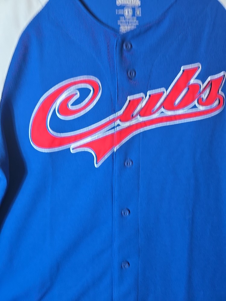 Show your support for the Chicago Cubs with this officially licensed Stitches jersey shirt. The blue shirt features the team's logo and is perfect for any fan. It is made of high-quality materials and has been designed to ensure maximum comfort. This shirt is perfect for men who love baseball and want to show their love for the Chicago Cubs. It is available in size X-Large and has a button-up closure. The shirt is made in Jersey and is perfect for anyone who loves sports memorabilia. Add this shirt to your collection today!