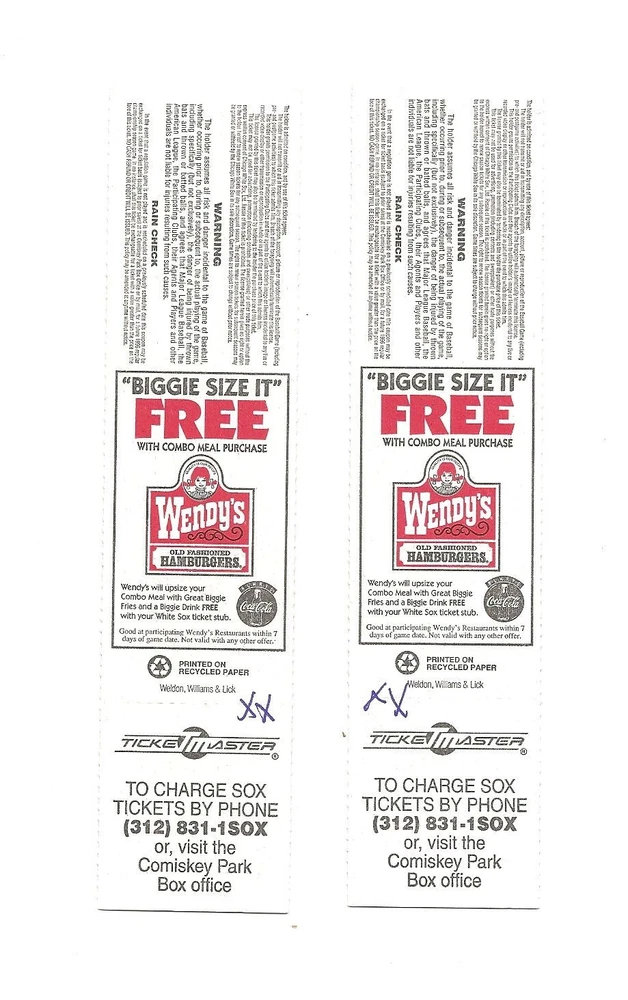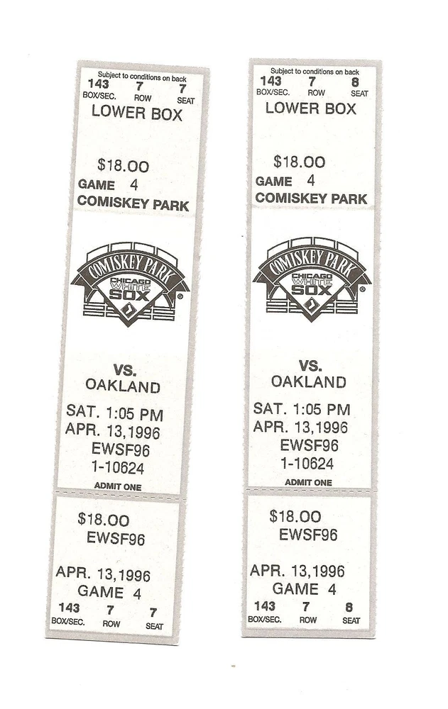 Chicago White Sox vs Oakland A's Unused Baseball Tickets From April 13, 1996 Here are 2 unused Chicago White Sox vs Oakland A's Baseball Tickets from April 13, 1996. The game took place at Comiskey Park in Chicago, Illinois. The tickets are in good condition and would make an excellent addition to your collection. Payment We gladly accept PayPal. Payment is due within 24 hours of sale. Shipping Your item will be shipped within 24 hours of receipt of payment via US Mail. Terms and Conditions All Sales are final. No Refunds