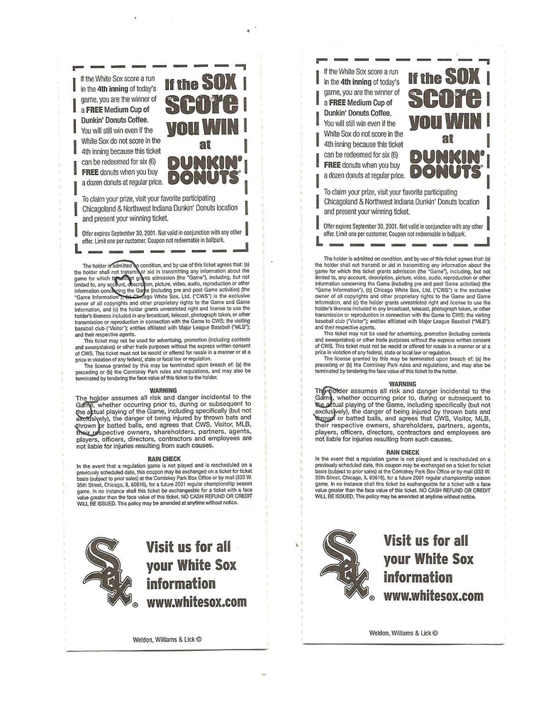 Chicago White Sox vs Oakland A's Unused Baseball Tickets From August 19, 2001 Here are 2 unused Chicago White Sox vs Oakland A's Baseball Tickets from August 19, 2001. The game took place at Comiskey Park in Chicago, Illinois. The tickets are in good condition and would make an excellent addition to your collection. Payment We gladly accept PayPal. Payment is due within 24 hours of sale. Shipping Your item will be shipped within 24 hours of receipt of payment via US Mail. Terms and Conditions All Sales are final. No Refunds