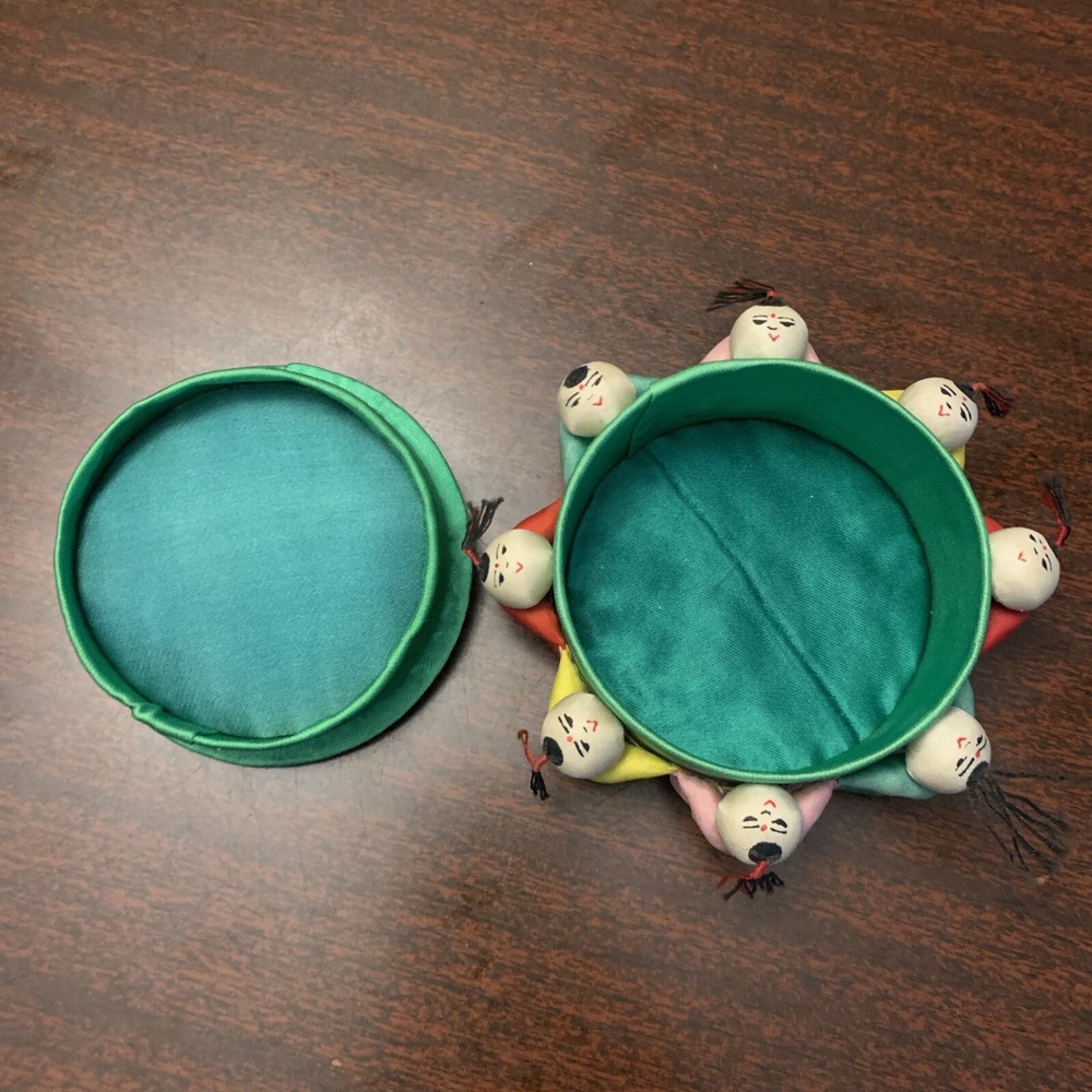 Decorative Round Chinese Trinket Box, 3.25" DIA x 1.5" H Probably vintage, possibly used to keep sewing supplies One of mini-persons surrounding the box is missing it's hair and a couple of slight tears on their bums