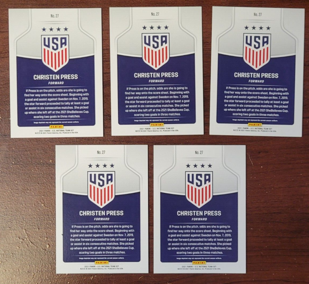 Lot of 5 Christen Press 2021 Panini Instant United States Soccer Women's National Team Card #27 Buyer gets all 5 cards. We always package our items with extra padding to make sure they arrive to you safely.
