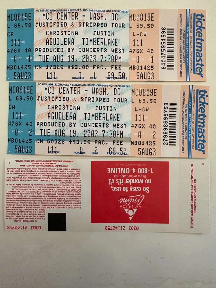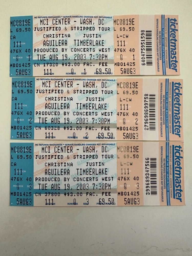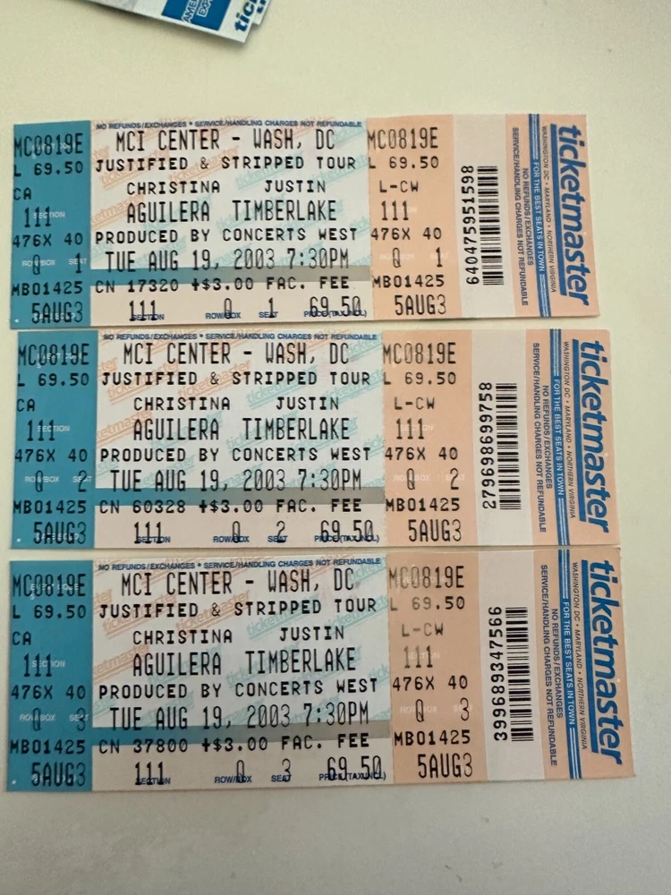 Relive an iconic moment in pop music history with these three authentic ticket stubs from Christina Aguilera and Justin Timberlake's Justified & Stripped Tour. This unforgettable concert took place on August 19, 2003, at the MCI Center in Washington, DC, and was produced by Concerts West. Key Details: Artists: Christina Aguilera and Justin Timberlake Tour: Justified & Stripped Tour Date: August 19, 2003 Venue: MCI Center, Washington, DC Section: 111 Row: Q Seats: 1, 2, and 3 Number of Tickets: 3 Produced By: Concerts West Condition: Well-preserved and in excellent condition These ticket stubs have been carefully stored and are in excellent condition. Whether you're a fan of Christina Aguilera, Justin Timberlake, or a collector of concert memorabilia, these stubs are a rare and special find. Don’t miss your chance to own a piece of pop music history.