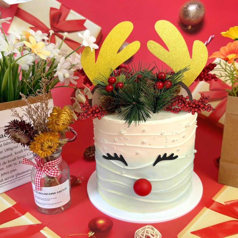 Package Included: You will receive 1 x set of Reindeer shape cake topper(6 pcs), 2 x artificial pine cones, 2 x artificial red Berries, 1 x ball, 3 x artificial pine needles Materials: Reindeer shape cake toppers are made of paper. Pine needles, pine cones and red berries are made of plastic. Ball is made of foam Unique design: This set of christmas cake decorations is specially designed for the coming Christmas. The combination of reindeer and pine needles adds a fun atmosphere to your party Convenient: These cake toppers are very convenient to use. You can decorate your cake quickly and don't need auxiliary tools. These cake toppers can be directly decorated on the cake. DIY your christmas party Wide use: Suitable for birthday parties, holiday theme celebrations, Christmas parties, New Year parties, etc. You can use these decorations to decorate cakes, desserts, cookies, donuts, etc