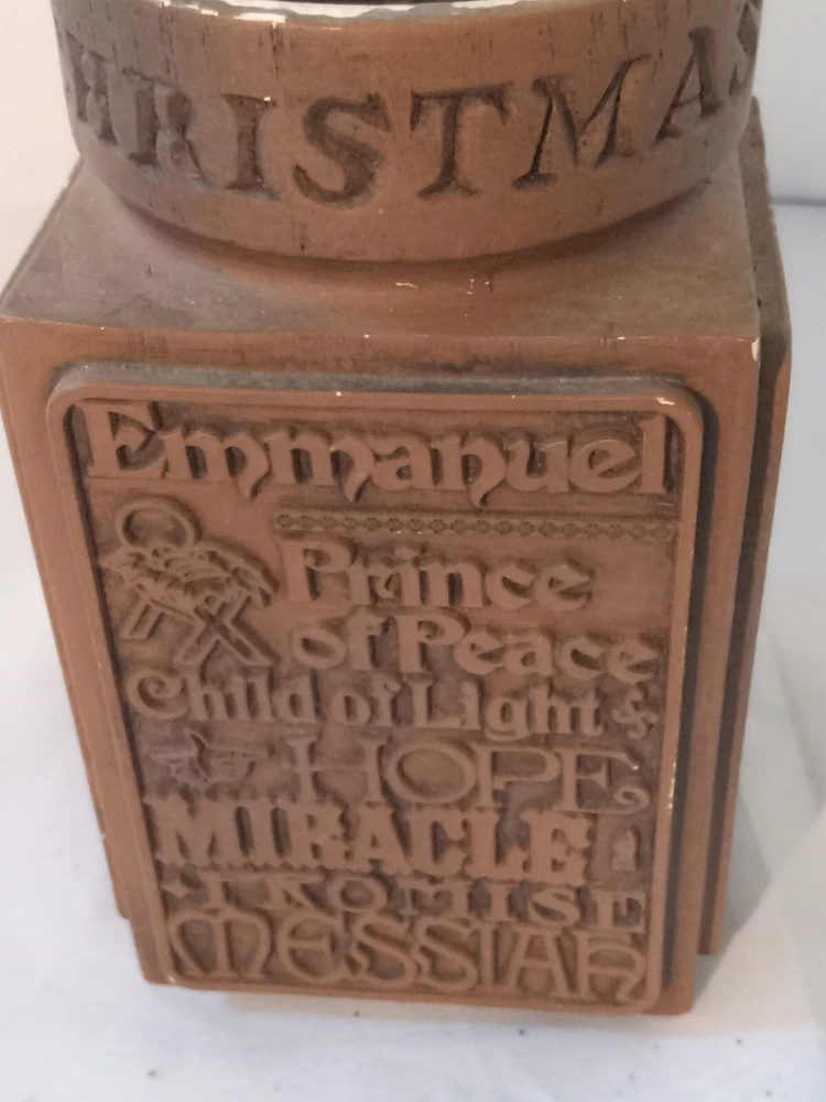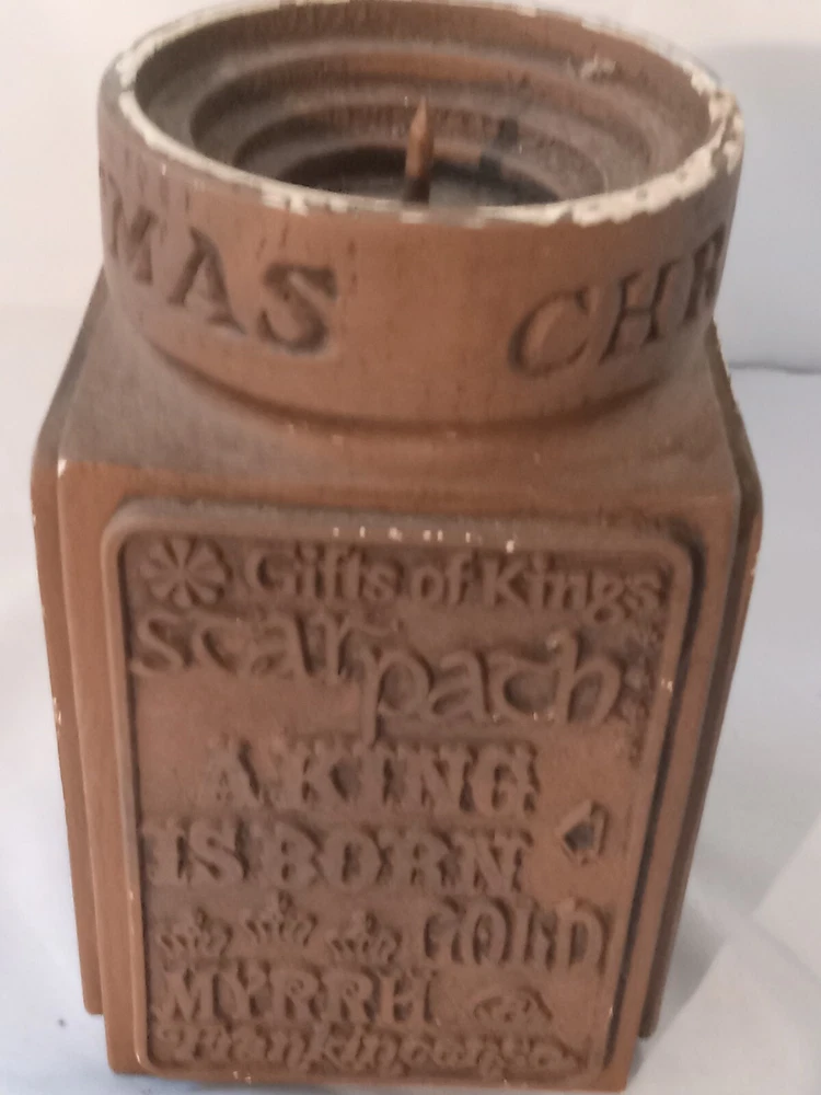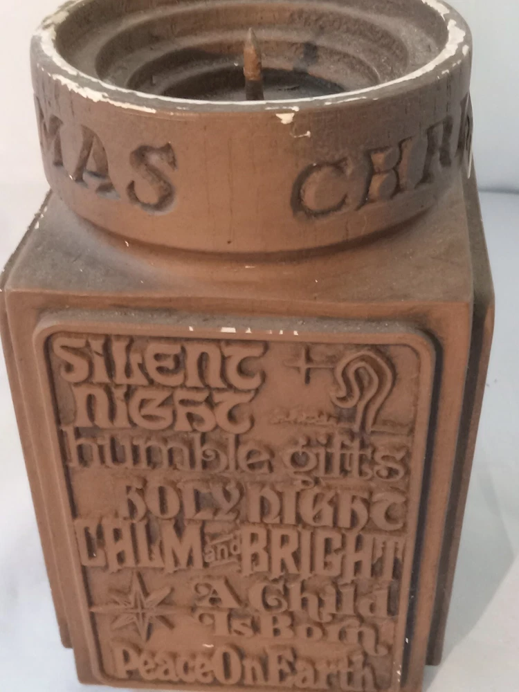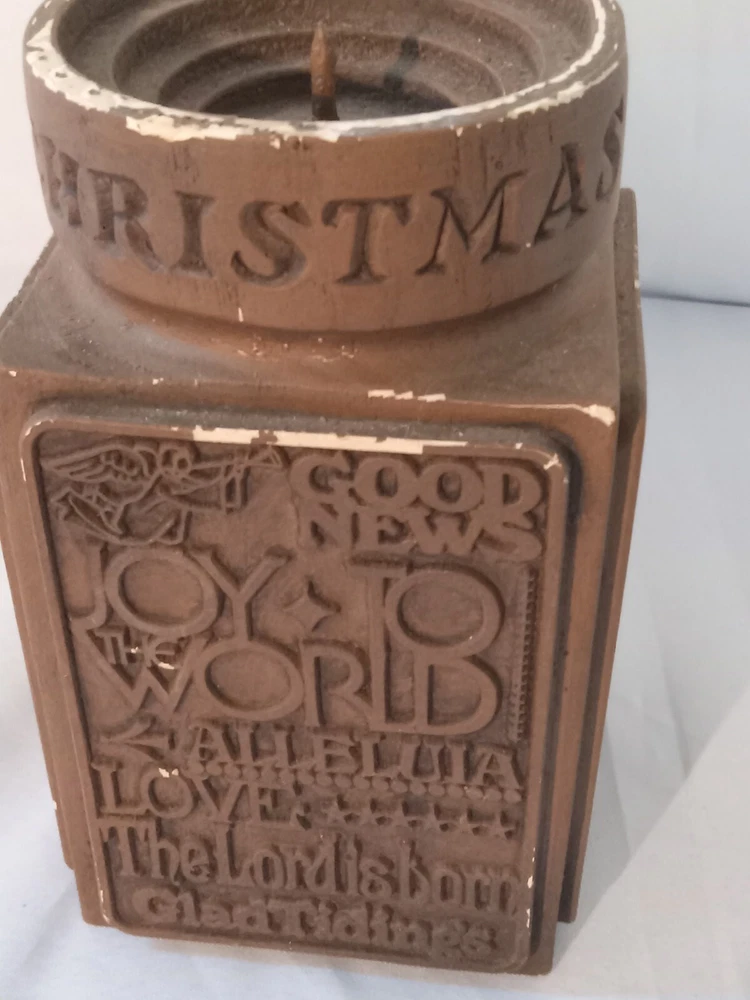Abbey Press 1977 Christmas candle holder. Candle is not included. This is the Spiritual line. Can hold several different sizes of pillar candles. Heavy