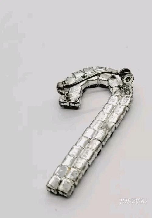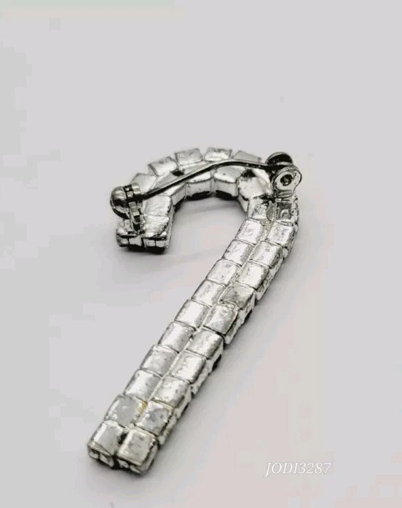 Christmas Candy Cane Brooch Pin Red White Crystal Silver tone Vintage 1.5 in