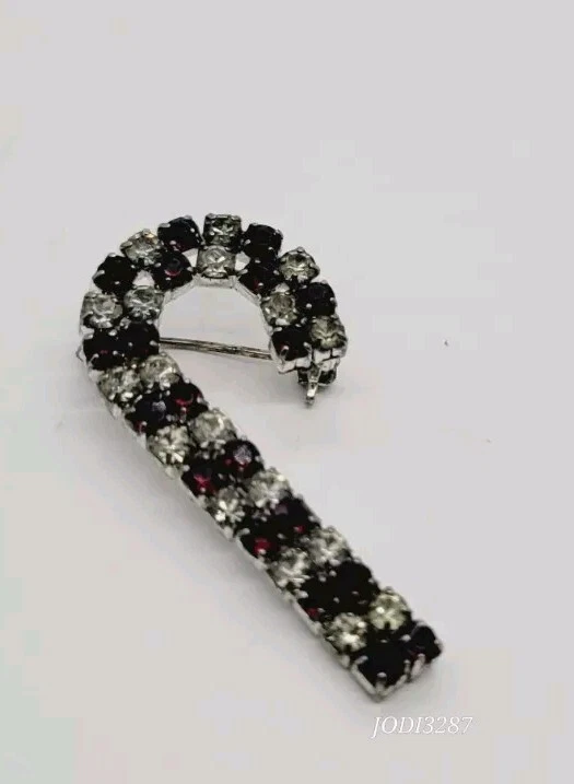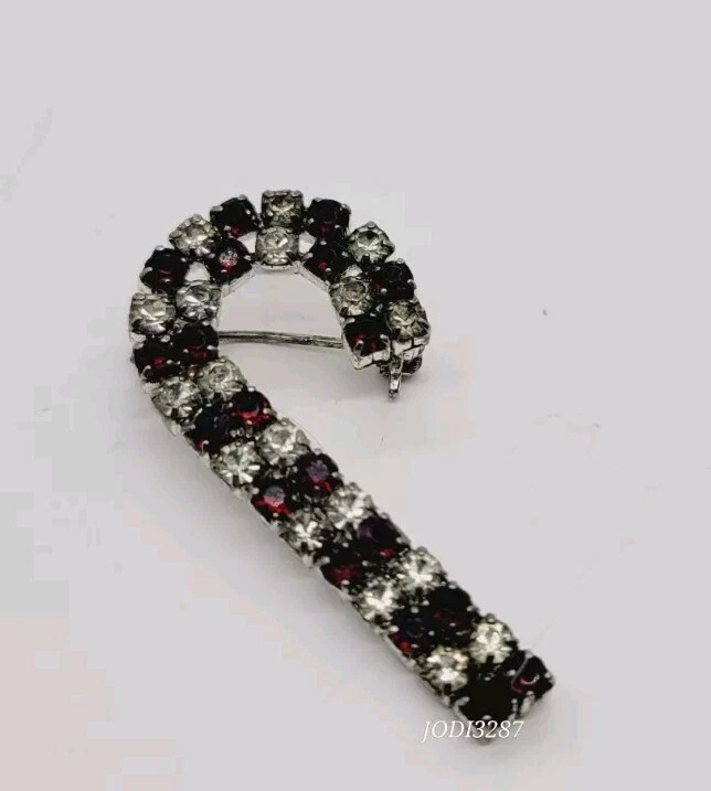 Base Metal:UnknownVintage:YesColor:Red white SilverSigned:NoMain Stone Color:Red WhiteMaterial:CrystalMetal:UnknownMain Stone:CrystalTheme:Fashion & Costumes, Food & Drink, ChristmasMain Stone Creation:UnknownType:BroochPersonalize:NoShape:Candy CaneJewelry Department:FashionCountry of Origin:UnknownCountry/Region of Manufacture:UnknownCustomized:NoAntique:NoMain Stone Shape:RoundBrand:Christmas StoreOccasion:ChristmasItem Length:1.5 inHandmade:NoDepartment:Women