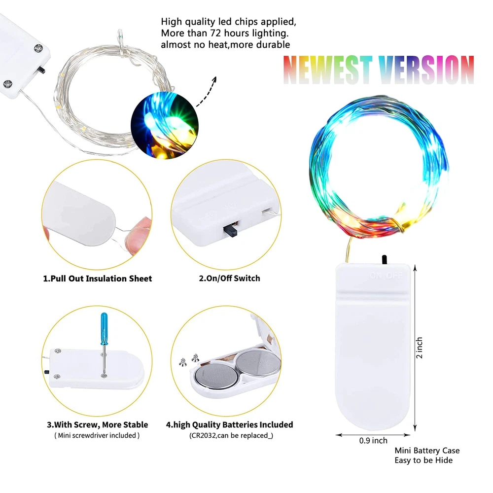 15 Units of Multicolor Fairy Lights - CR2032*2 batteries included,48 hours long battery life, longer working time than other's 24 hour fairy string lights . Durable wire and bright bulbs - Battery fairy lights are 7 feet in length, made of coated flexible silver wire. Wire is thin, almost invisible to see from distance. 20 mini led bulbs are equipped with big and bright chips, 4 inch spacing between led bulbs, 0.66ft lead wire between the battery pack and the first light bulb. IP65 waterproof - The light string is IP65 waterproof, could be immersed in water without worry of short circuit (Only the string lights is waterproof, the battery pack is not waterproof) Safe to use - The starry string lights are low energy consumption, no overheat and remain cool after long hours usage, stay safe to touch. Wildly Application - Perfect copper lights for kids room, window, bedroom, picture wall, garden, patio, balcony, corridor, fence, shelf, bistro, pub, cafe, flower shop, mall, new year, birthday, potted landscape, evening party. After service Policy - thankful choose ours product,we definitely value your customer experience, If you have any questions, please feel free to contact us,we’ll always be there for you ,every second,any time.