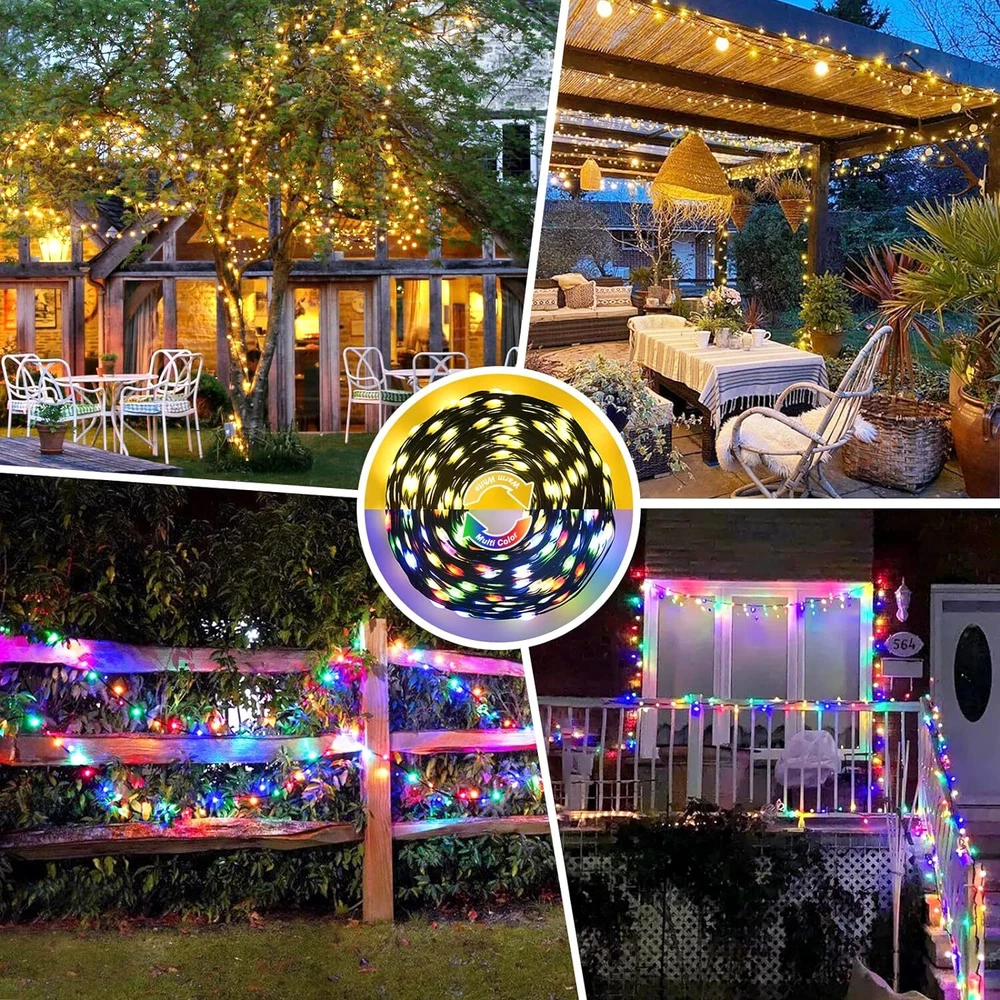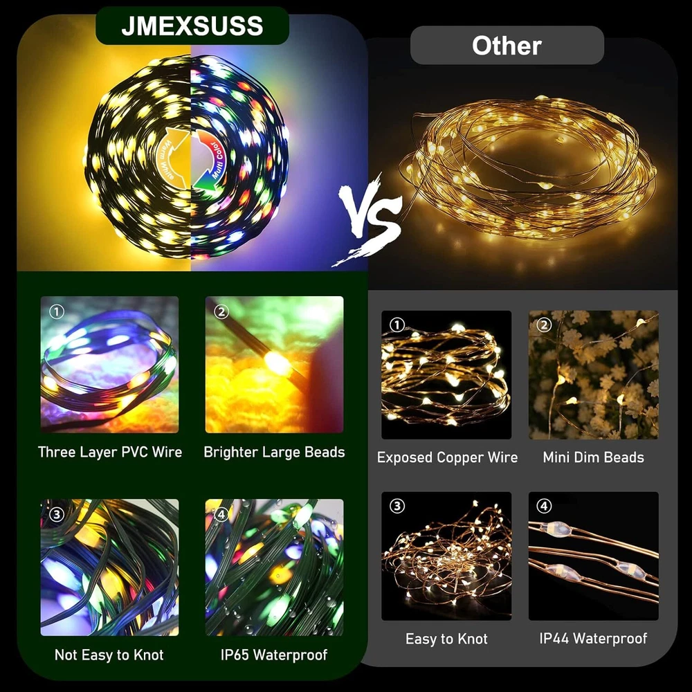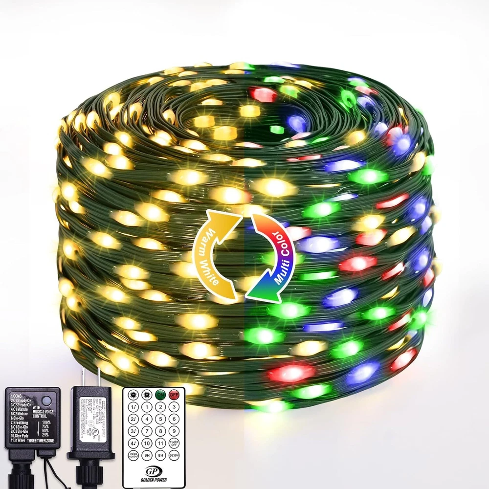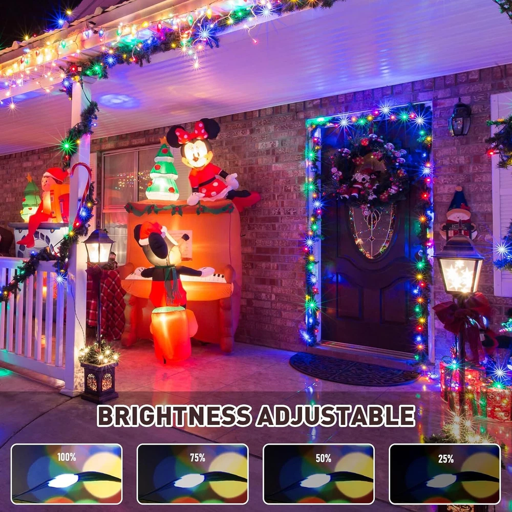 🎄【Enchanting Outdoor Christmas Lights】Elevate your festive decor with our 66ft 200 LED Outdoor Christmas lights, Super Bright Mini LEDs that beautifully adorn your fence, house, and trees in the front yard. Designed with a 3-layer high-quality PVC wire, our outdoor Christmas lights ensure durability and tangle-free convenience, saving you precious time during setup 🌟【Create the Perfect Ambiance】11 Lighting Modes has been updated to replace the previous 8 modes.They are vibrant. Warm white Steady on will meet the masses of consumers requirement.Mulitcolor will crate magic ambiance. Personalize your festive atmosphere further with our innovative 4-levels brightness dimmable function (25%-50%-75%-100%), catering to your every mood and preference ⏰【Effortless Convenience】Experience ultimate ease with our built-in Timer Function, allowing the lights to automatically turn on for 6 hours and off for 18 hours, freeing you from the hassle of remembering to switch them off. The humanized Memory Function ensures your last mode setting is saved, simplifying your life with just one-time setup 🎯【Ready for All Weather】Break free from the limitations of traditional IP44 waterproof lights, as our outdoor string lights waterproof boast a superior IP65 waterproof grade, conquering even harsh weather conditions like heavy rain and snow. Rest assured that our lights will shine bright and beautiful throughout the holiday season(Please protect plug) 🎵【Voice Control & Music Modes】 Music modes have spurred the string lights to a further leap in quality and function. The smart string lights can keep changing with the rhythm of the music because it with a built-in mic ✨【Perfect Christmas Decorations】Embrace endless possibilities with our color changing Christmas lights that are perfect for both outdoor and indoor decor. Accentuate your fences, outline your houses, and bring cheer to your front yard. Indoors, let them dazzle your Christmas tree, making it the centerpiece of festive delight 🌟【Satisfaction Guarantee】Please do not hesitate to reach out to us should you encounter any issues with our Outdoor String Lights Waterproof. We are committed to providing outstanding customer service and will promptly resolve any concerns that may arise. Choose our product, and let these color changing Christmas light up your life