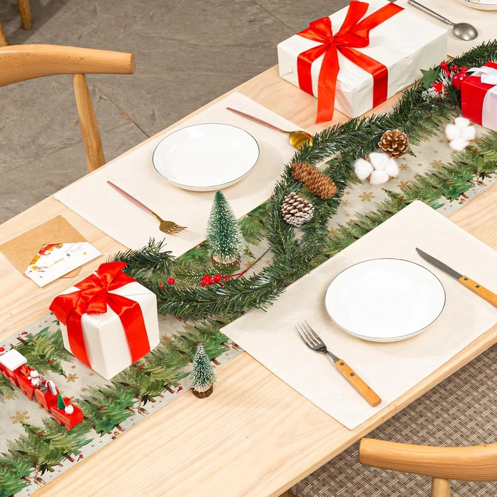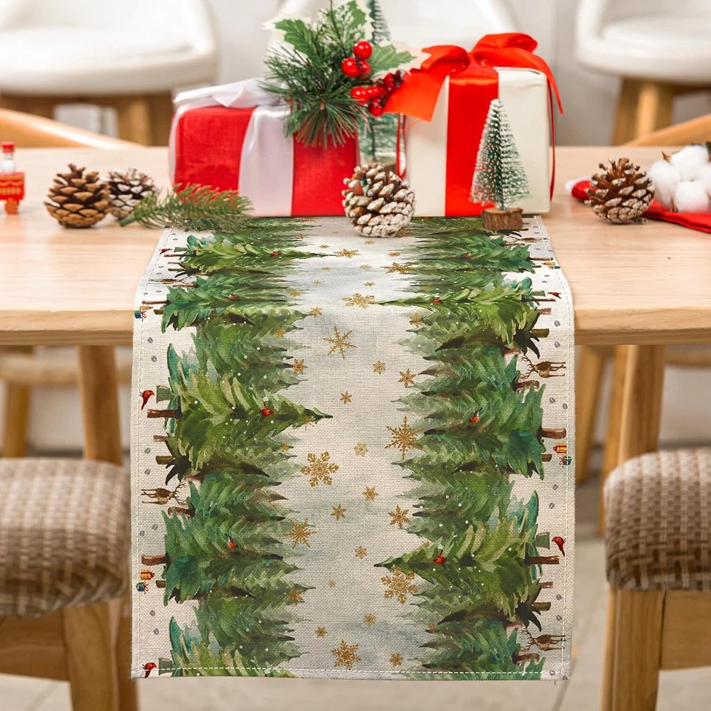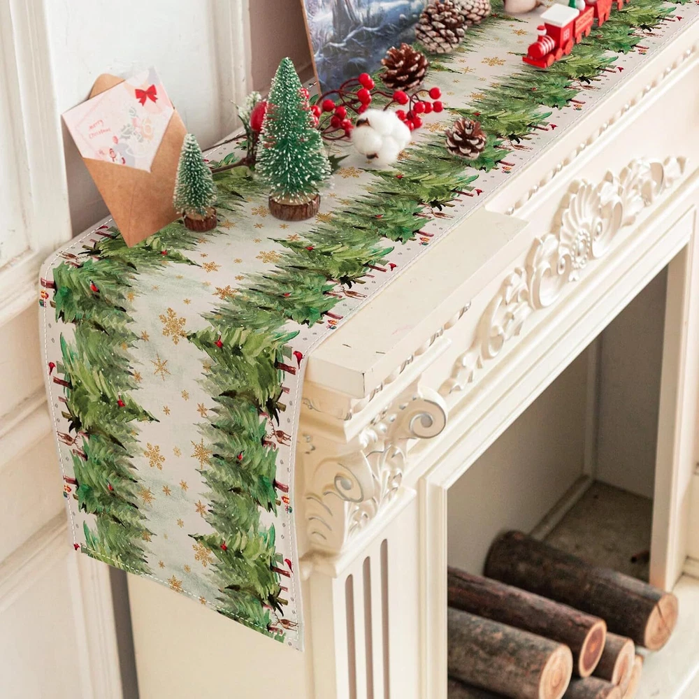 Polyester THE PACKAGE INCLUDES: A Christmas themed table runner, measures 13 × 72inch, it will be appropriate size to decorate your family and party table. NOTICE: Our table runners are packed in compression and may cause uneven creases, you can wash or iron flatten them upon receipt, hoping for your kindly understanding. WATERCOLOR DESIGN: Our table runner is patterned with watercolor pine tree and golden snowflakes, fresh and delicate. While enriches the appearance of table runner, it also brings more fun to Christmas. DURABLE & REUSABLE: Made of premium polyester material, anti-slip and anti-fading, waterproof, reusable and heat resistant, it will offer you a comfortable using experience. ATMOSPHERE CREATOR: Suitable for most tables, including dining table, coffee table, entrance table, and also great for fireplaces, mantels, and more. Our table runner will create strong Christmas atmosphere for your home and party, leaving deep impressions on your guests and friends. Size: 13 x 72 inch Material: Polyester Color: Green