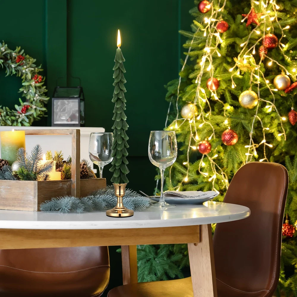 Features: These Christmas tree candles wax with metal candle stick holders make a wonderful and heartfelt gift for your friends, family, or neighbors. They are especially fitting as a holiday present, spreading warmth and festivity The vibrant green and golden color of the green taper candles and candlesticks holders immediately light up your room, adding Christmas cheer to your home. They create a warm, inviting atmosphere that is irresistible, making them an ideal for holiday celebrations. Specifications: Material: wax and metal Color: green and golden Size: Candle: about 9.84 inches/ 25 cm high Holder: about 2.5 x 2.5 x 3 inches (L x W x H) and 0.75 inch deep for candle hole Package includes: 2 x Christmas tree candles 2 x Candle holders Notes: Manual measurement, please allow slight errors on size. The color may exist a slight difference due to different screen displays. Complete Package Includes: the package includes 2 pieces of unscented wax candles in about 9.84 inches/ 25 cm high and 2 pieces of gold candlesticks, approximately 2.5 x 2.5 x 3 inches (L x W x H) and 0.75 inch deep for the candle hole; This set provides what you need for a jubilant Christmas decoration, adding to your convenience, please kindly note that the candle needs to be first poured on the candlestick to secure the candle Notice for Use: due to the special shape of the candle, you need to drip wax oil on the edge of the candle holder to ensure that the candle does not shake; This metal candle holder is suitable for all rod candles, and you can keep it after you have applied your Christmas tree candles Quality and Reliable: our table candles are made of quality wax, crafted delicately for a realistic Christmas tree appearance; The taper candle holders are crafted from robust and durable metal, ensuring they can firmly and safely hold the candles, both the candles and holders are designed to serve you for a long time Suitable for Various Occasions: our Christmas candles with Christmas candle holders not just add festival cheer to your home, but they are versatile enough to be served on various occasions; They can be acted for holiday parties, family gatherings, or even intimate dinners, enhancing the festive feeling Safe Package: we use protective packaging and boxes to ensure that the candle is not damaged to the maximum extent; However, due to the material of the candle, damage is inevitable; If it breaks, please return it in time and we will reship it; We wish you a Merry Christmas