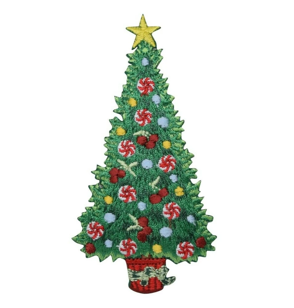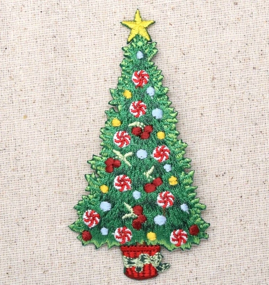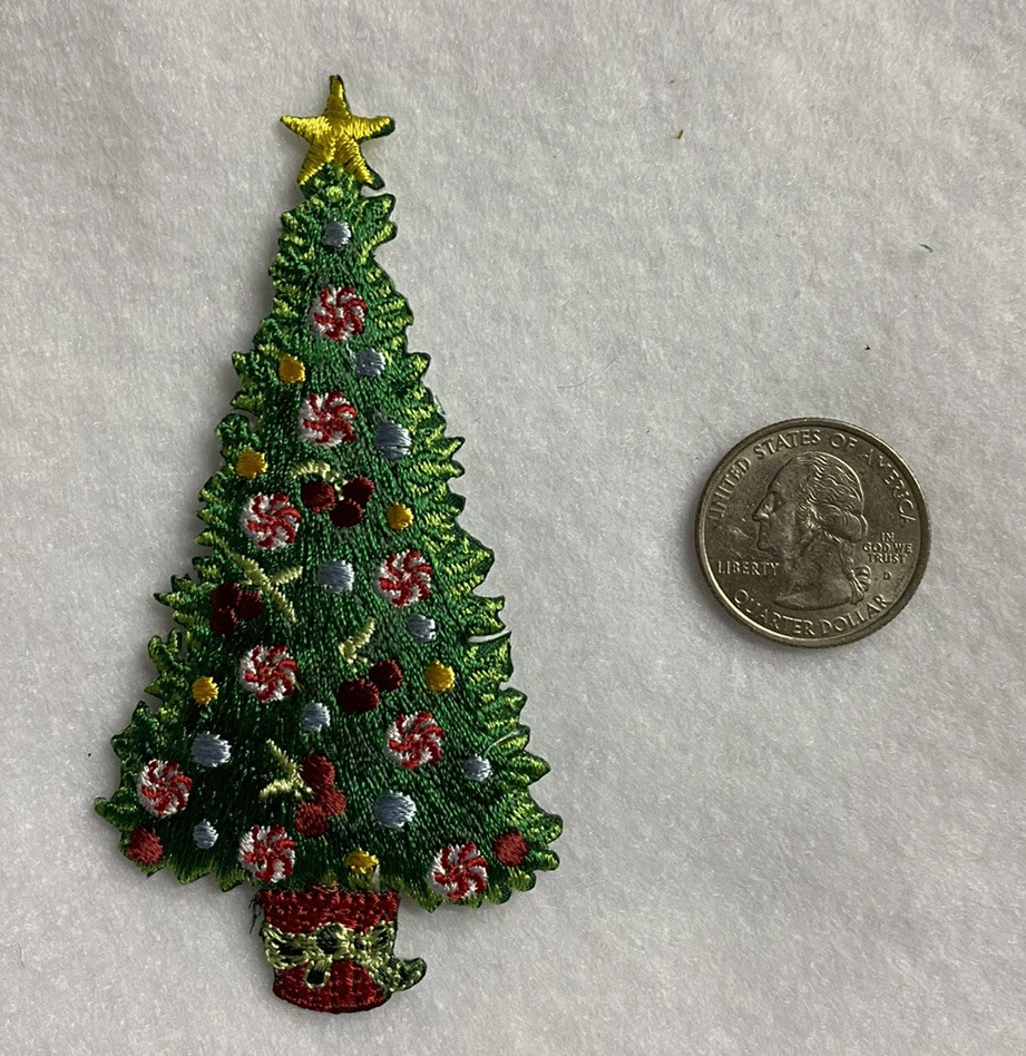Christmas Tree Iron on Applique Size is approx. 2" x 3-7/8" (5.08cm x 9.8cm) High quality, detailed embroidery applique. Can be sewn or ironed on. Great for hats, bags, clothing, and more!