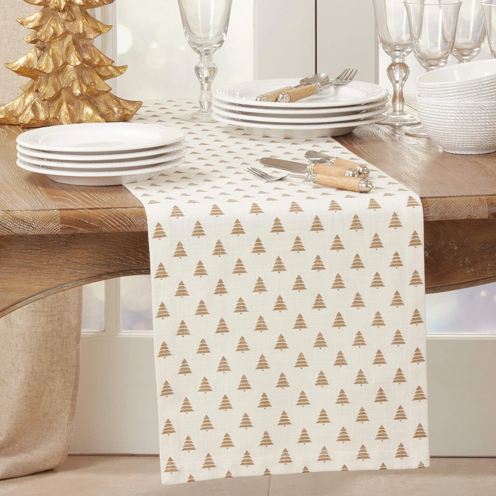 The Christmas Trees Design Table Runner helps set the perfect dining table for your family, friends or guests during the holiday season. It brings Christmas cheer to the table, while adding a touch of elegance to the décor. Pair with the matching napkins for a coordinated look. Size: 14" x 72" Design is not reversible Runner has no lining Cotton is soft and durable for daily use and regular laundering Material: 100% cotton + Care: cool machine wash, lay flat to dry
