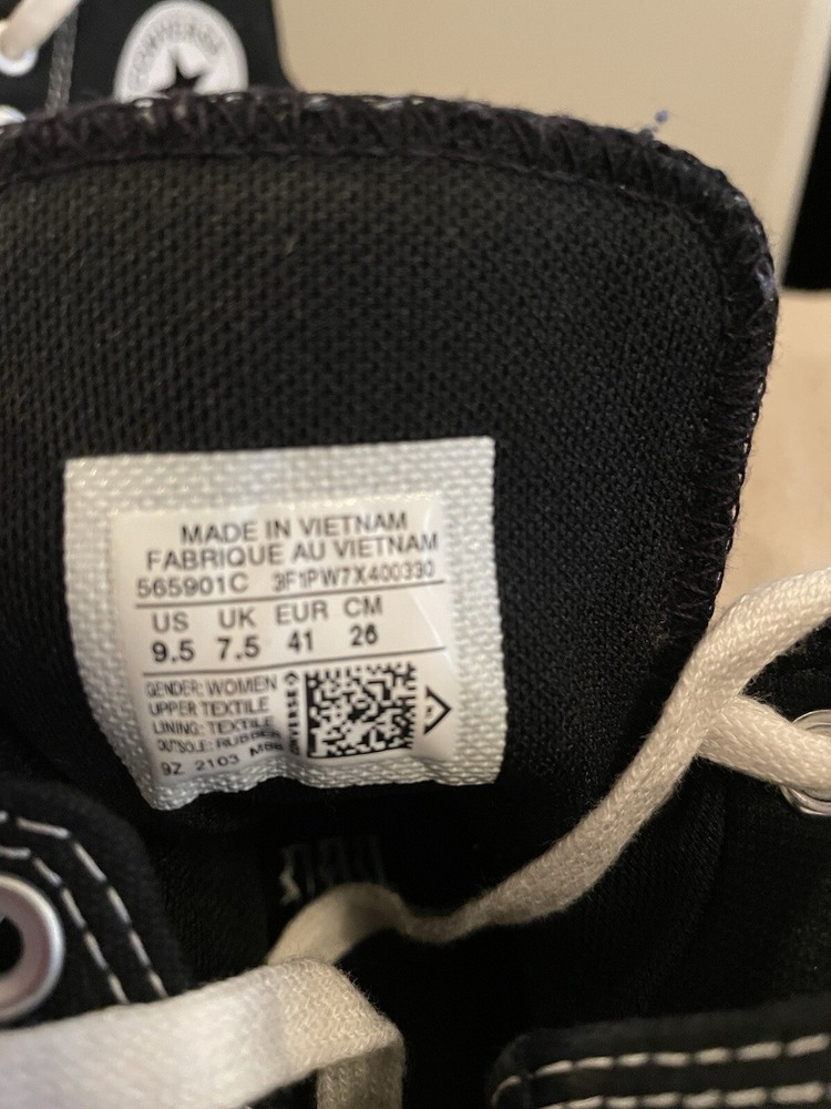 Model:Converse Chuck TaylorTheme:StarsColor:BlackDepartment:Unisex AdultsBrand:ConverseStyle:SneakerUS Shoe Size:9.5Type:AthleticProduct Line:Converse Chucks All Star Chuck Taylor