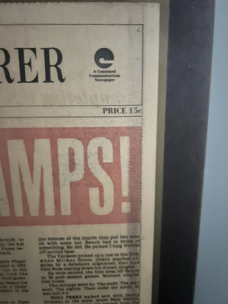 Cincinnati Reds Vintage Sports Memorabilia Laminated And Mounted Enquirer 1976. Professionally laminated and mounted by American Laminating Company Cincinnati is a page from the Sports section of The Cincinnati Enquirer dated Friday, October 22, 1976 Price 15 c titled “Still World Champs!” Reds sweep Yanks. This is in good condition considering age with yellowing and some holes in the paper at the bottom and not on the wording itself from a previous wall hang before mounting. Please see pictures. This would make a great gift for a sports enthusiast, collector, man cave, bar the list goes on and on. Overall measurement 17” x 28”.